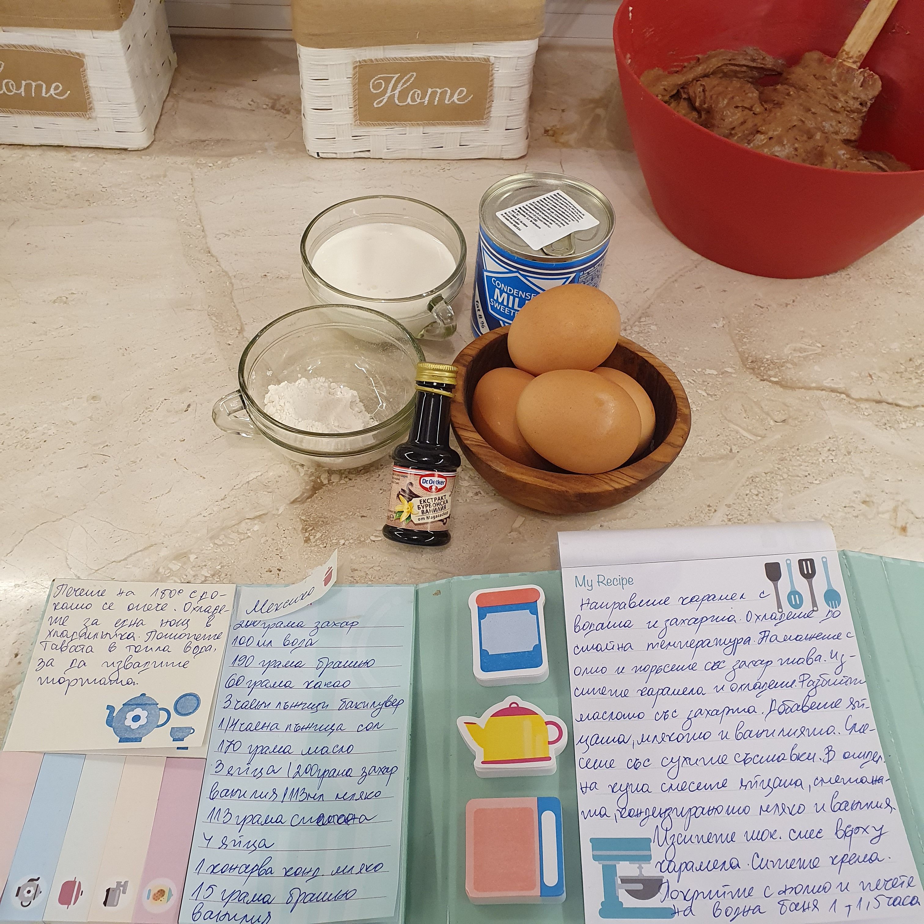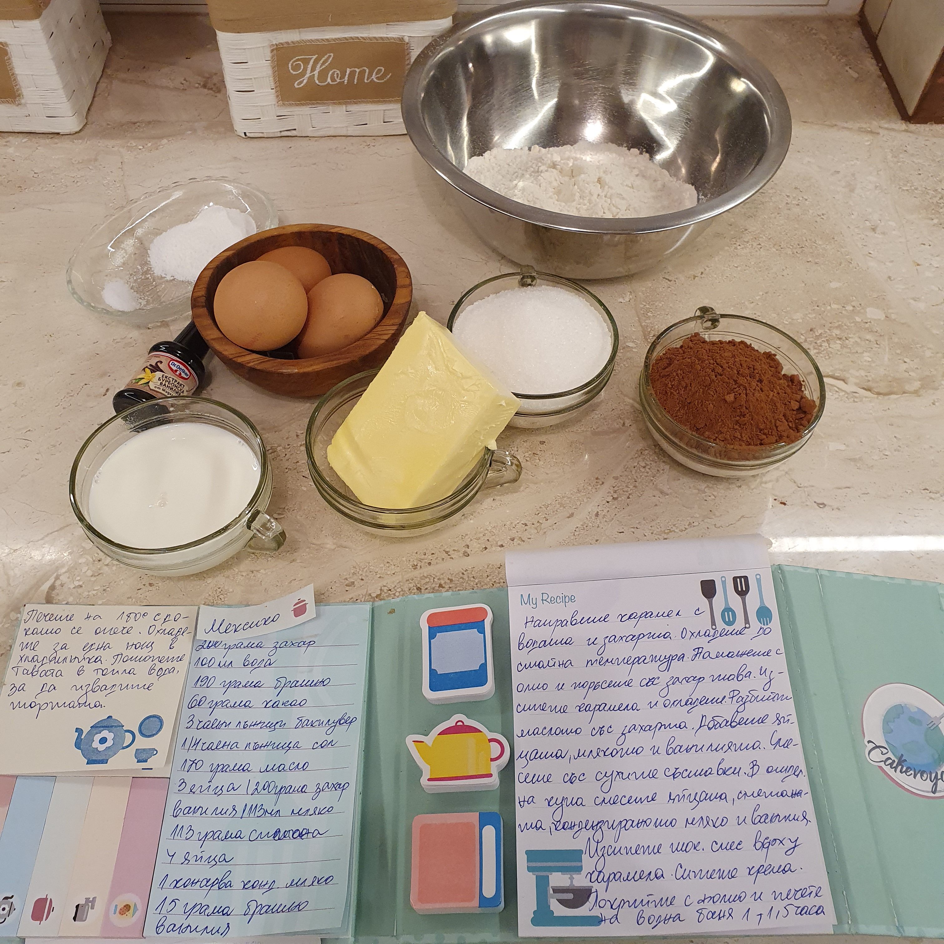 Предполагам няма да се изненадате, че избрах да направя “Flan cake” за Мексико. Този десерт може да го срещнете и като “Magic cake” или “Impossible cake” , защото сипвате в една последователност слоевете, после при печенето те се разместват, а накрая са в обратен ред. Объркахте се май :D. Нека видим необходимите за тортата продукти: