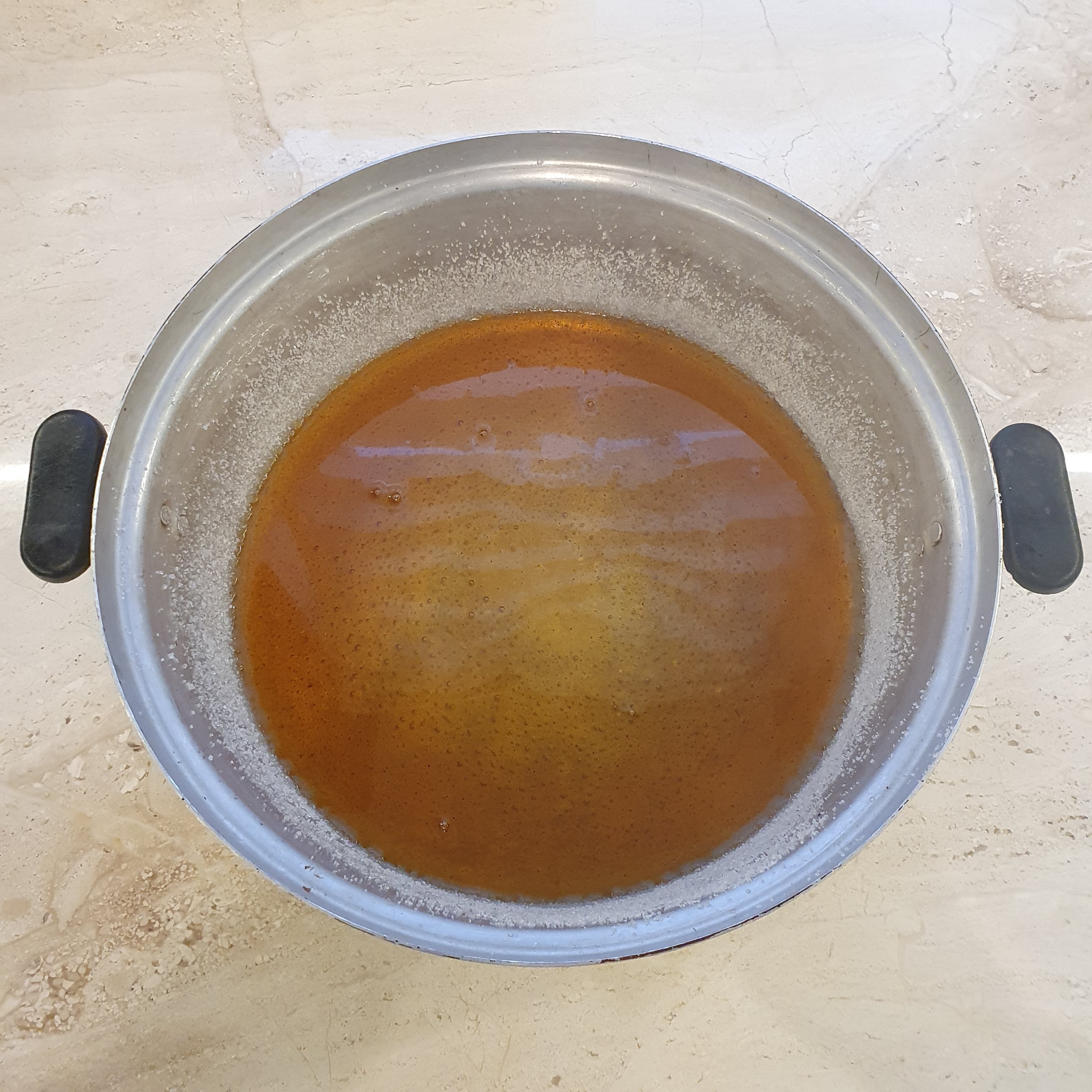 Започваме с карамеления сос. Разтопете захарта в касерола. Дръпнете от котлона и сипете внимателно водата, защото ще пръска и може да ви изгори. Захарта първоначално ще се втвърди, но върнете касеролата на котлона, бъркайте и варете докато отново стане течна. Пригответе съда за печене като го намаслите с олио и поръсите със захар. Излишната захар изсипете. Налейте карамела и оставете да се охлади добре.