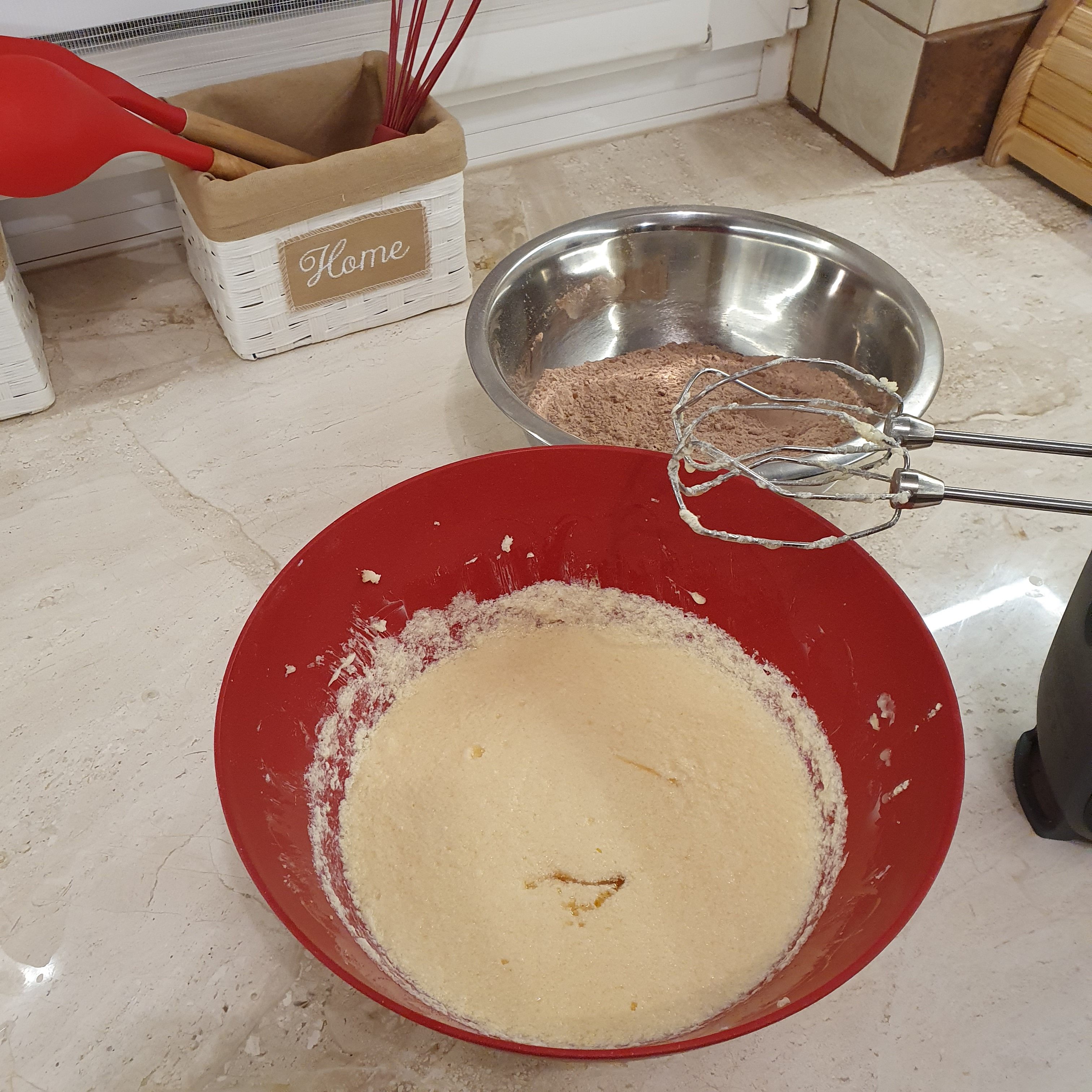 През това време пригответе кафявата и жълтата смес. Разбийте маслото до кремообразно и добавете захарта. Разбийте докато стане хомогенно на ниска скорост на миксера. Добавете яйцата едно по едно като след всяко разбивате. Прибавете млякото и ванилията и разбъркайте.