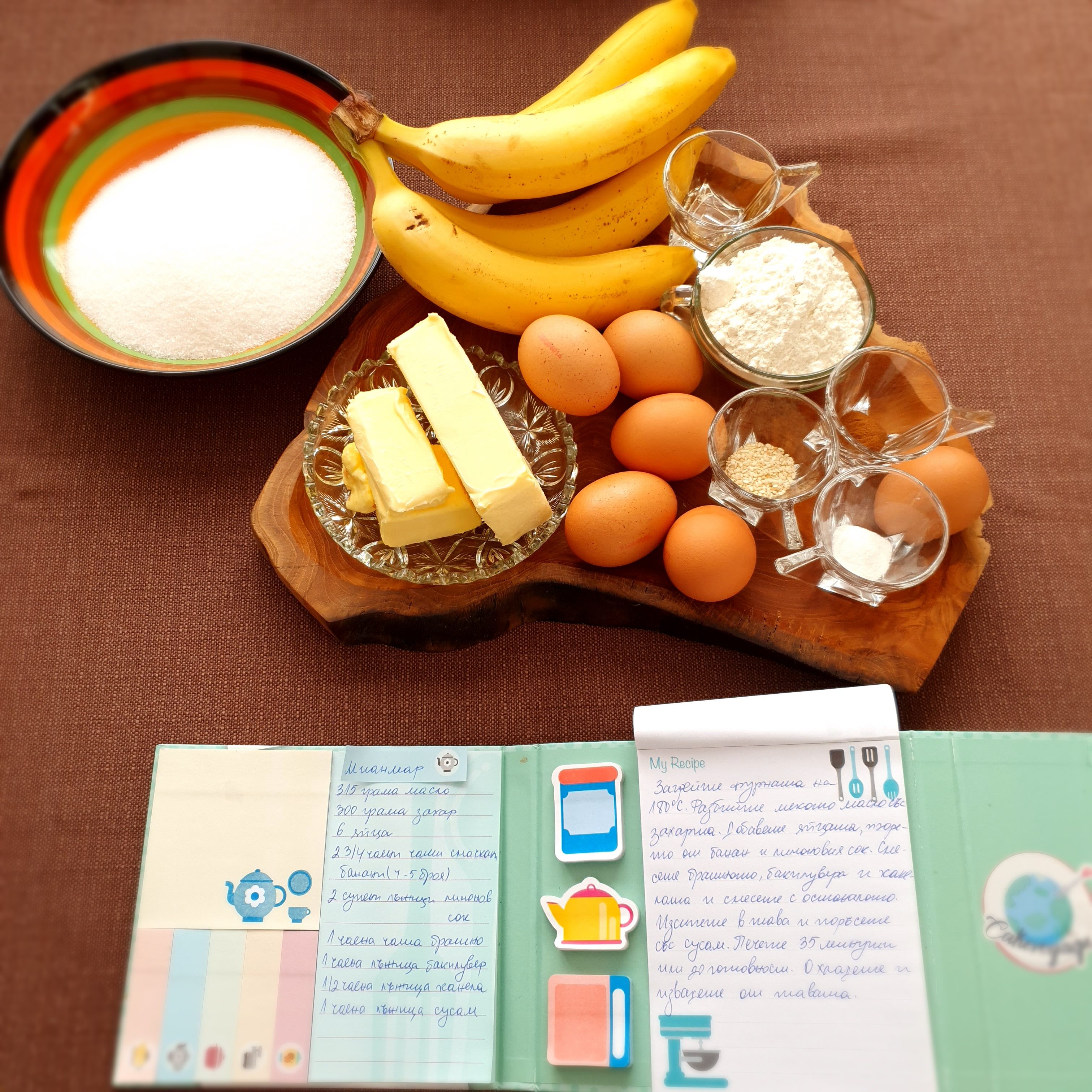 За вас реших да приготвя една лесна, елегантна и маслена бананова торта по рецепта топ готвач от Мианмар. Ето и необходимите продукти за нея: