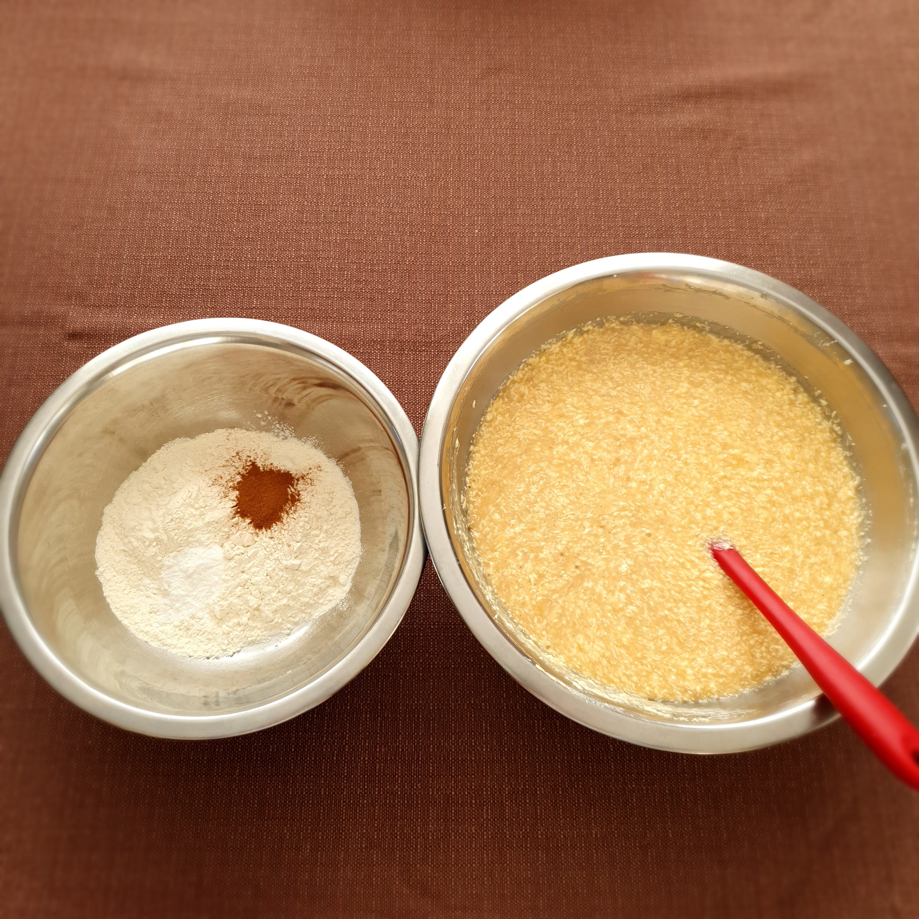 В купа смесете брашното, бакплувера и канелата. Изсипете сухата смес към останалите съставки.
