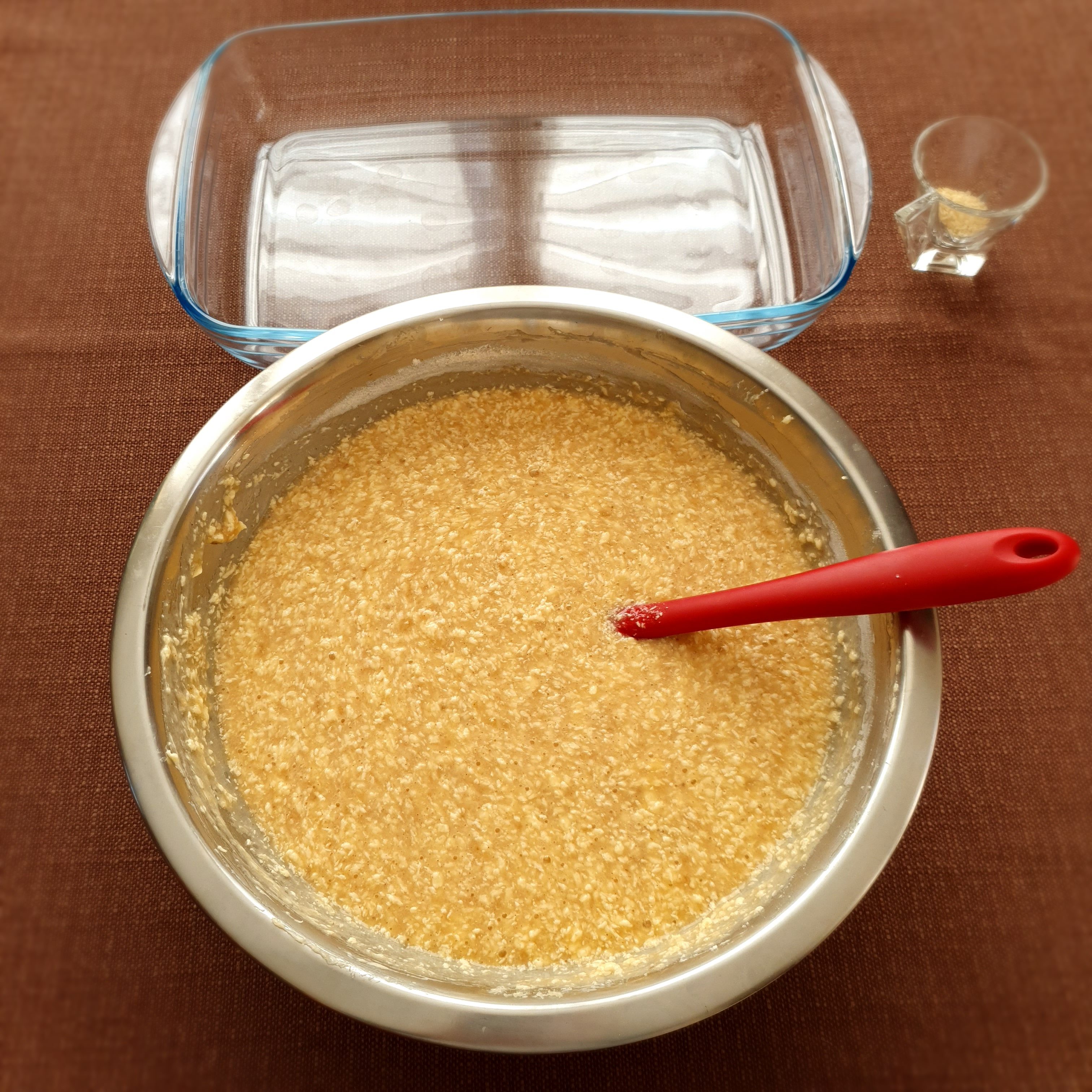 Изсипете тестото в правоъгълна тава и поръсете със сусама.