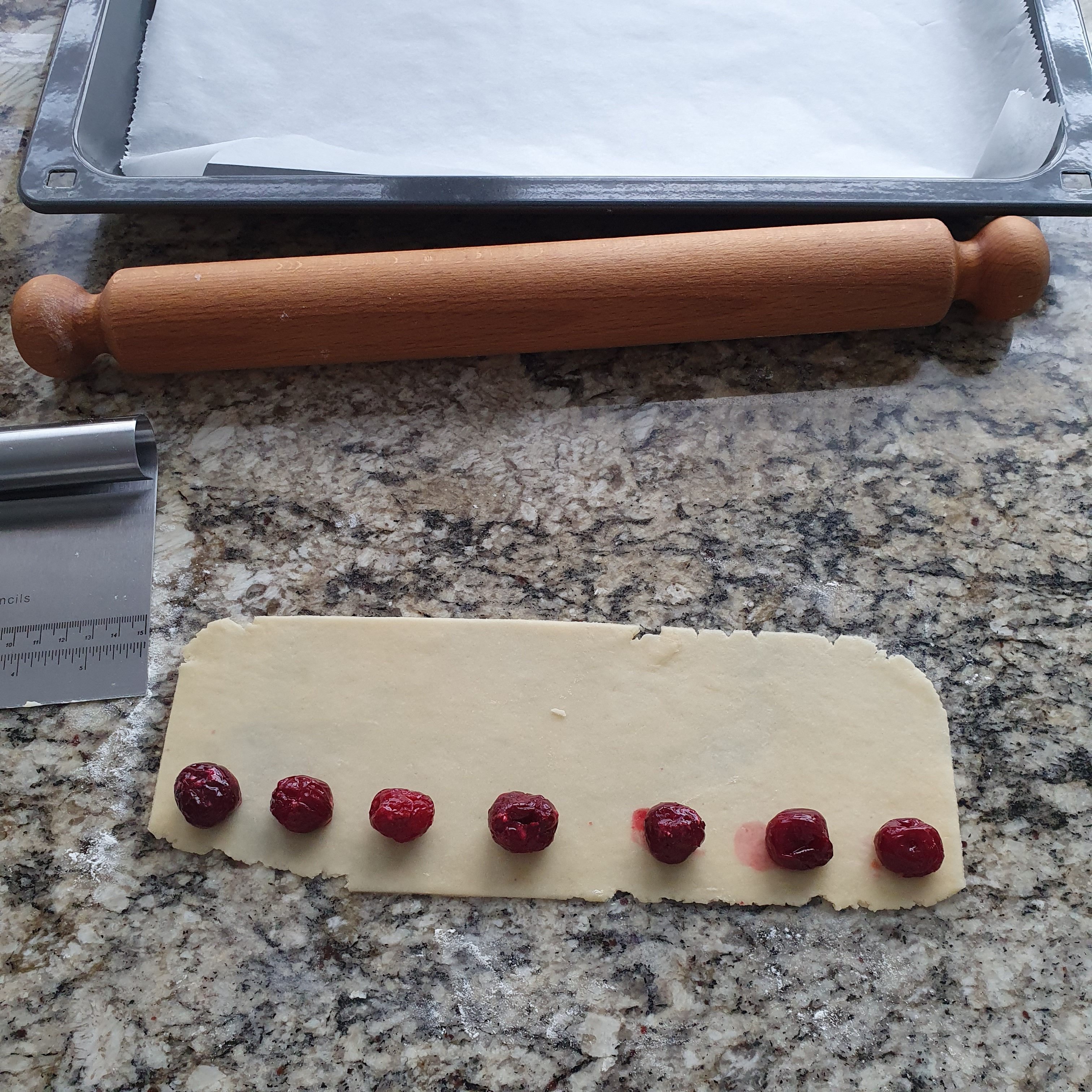 Изваждайте от хладилника едно по едно парчетата тесто и ги разточете по показания начин. Подредете по едната страна череши.