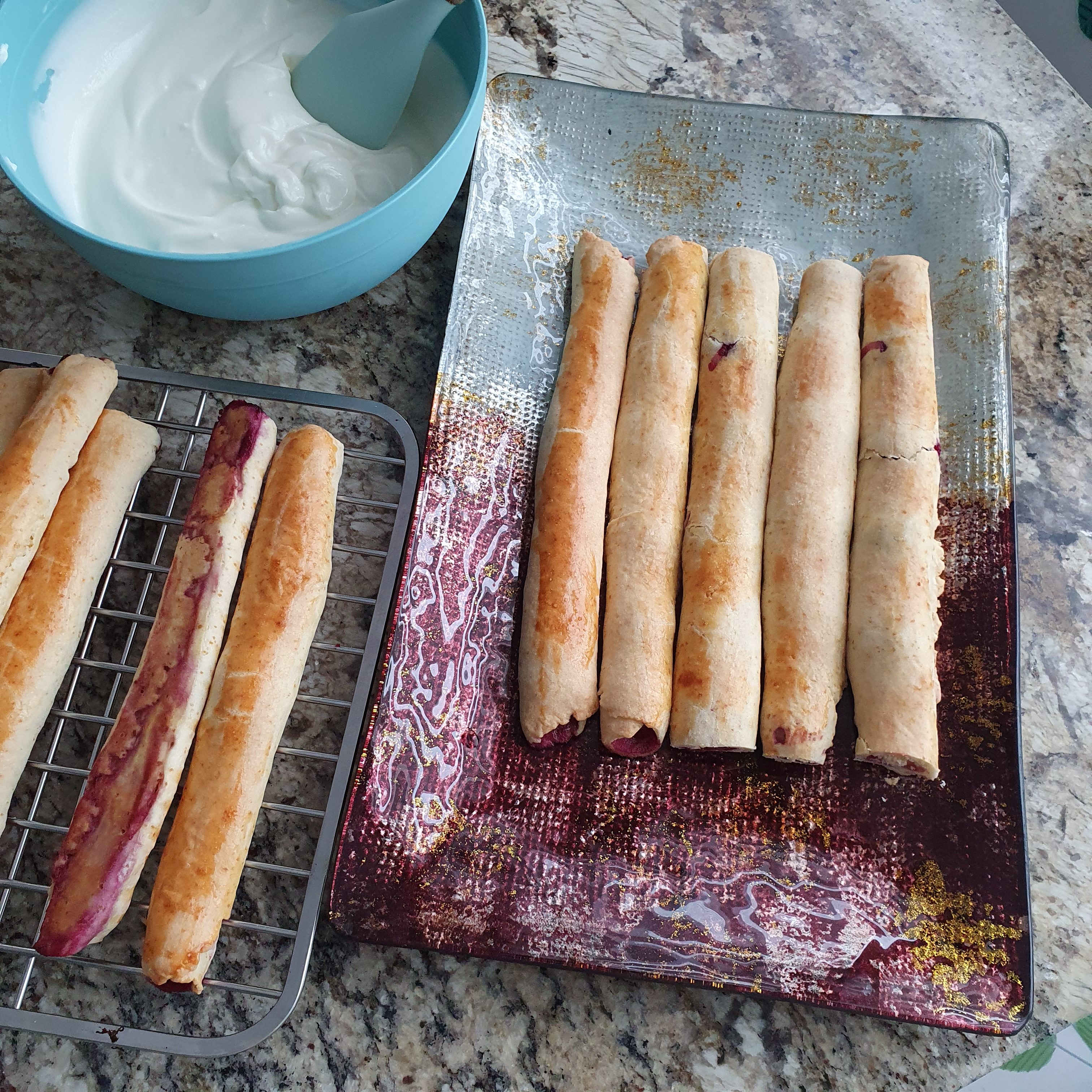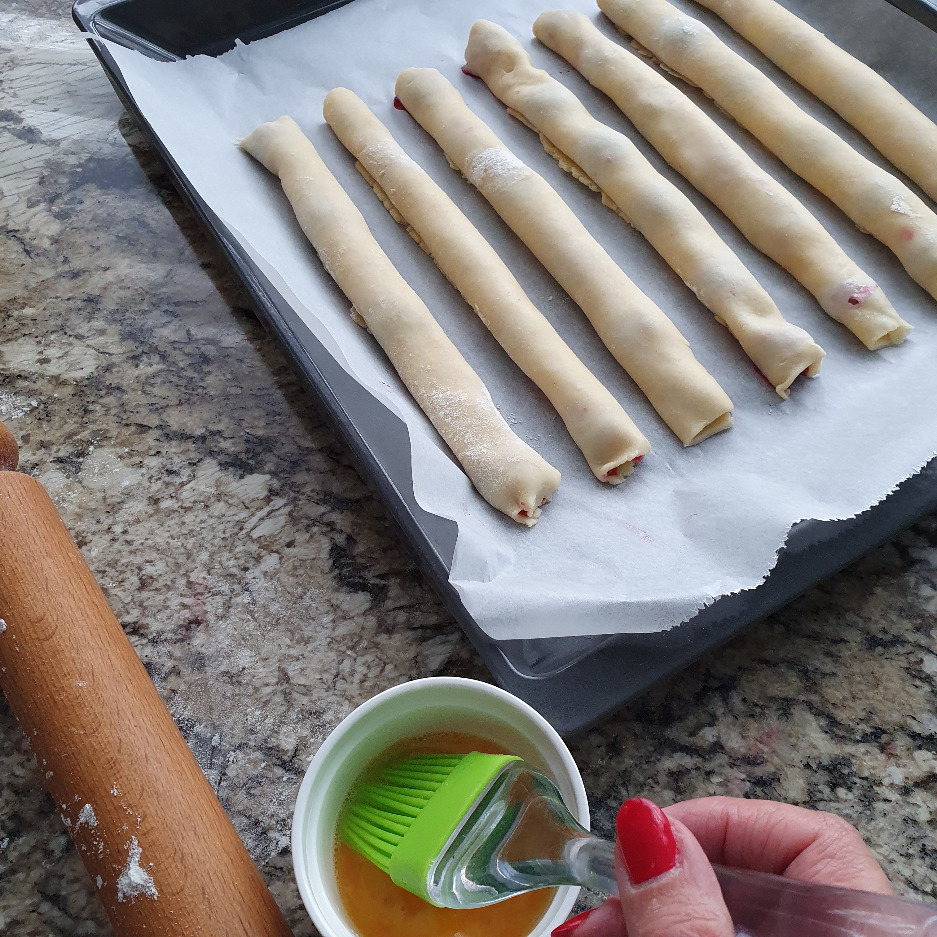 Подредете в тава. Охладете за 20 минути и преди да сложите да печете намажете тръбичките с яйце.