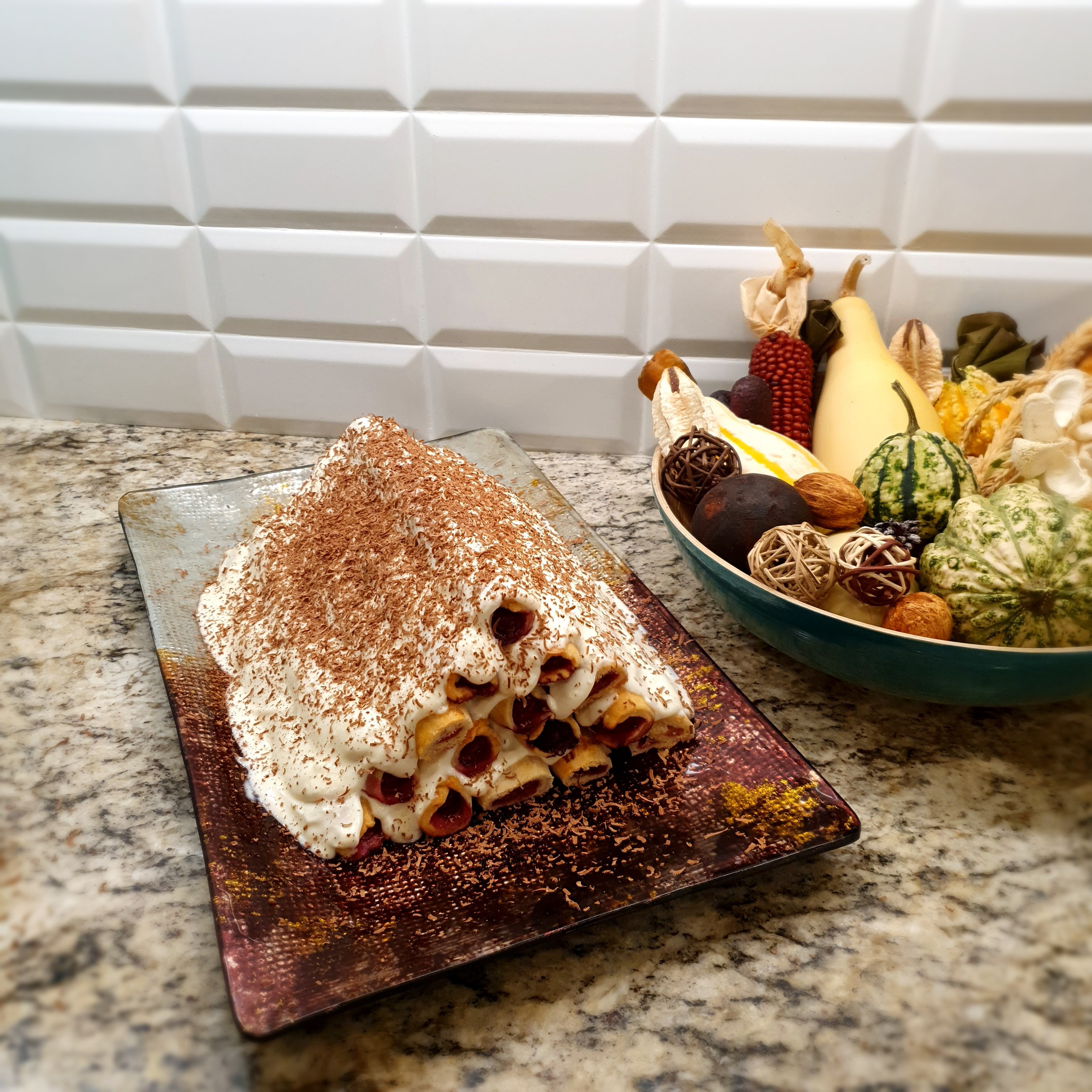 Сложете на следващия ред 4 тестени тъбички и крем, после 3, после 2 и накрая една като редувате с крем. Накрая измажете отвсякъде с крем.
