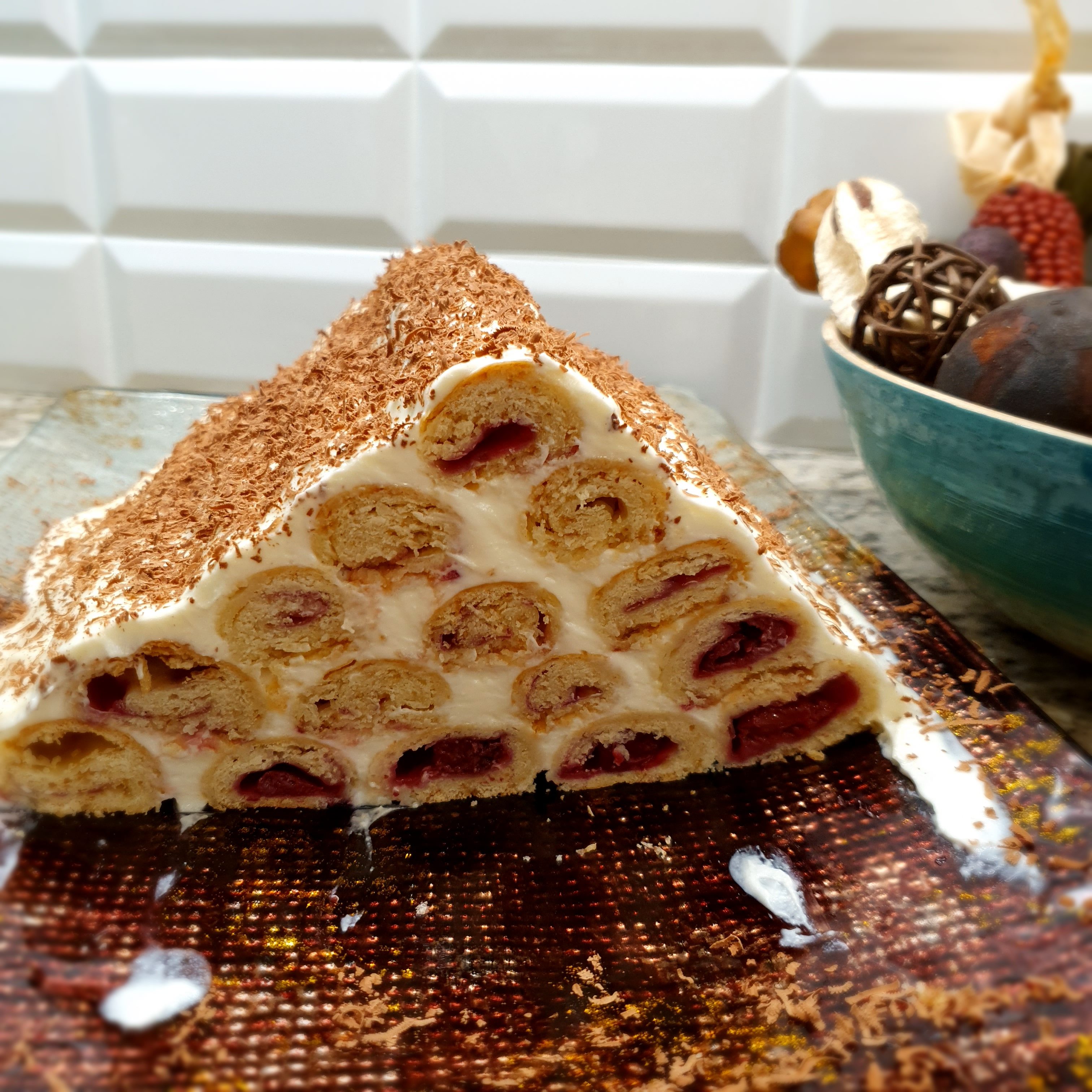 Сложете в хладилника да се споят вкусовете. Аз изчаках около 2 часа преди да я нарежа, защото рецептата я гледах в youtube и се говореше на румънски….Никакъв шанс да разбера колко време трябва да престои. 🙂 Преди да я нарежа поръсих с настърган шоколад. Моята “конструкция” не е от най-красивите, но стана пирамида. 😀