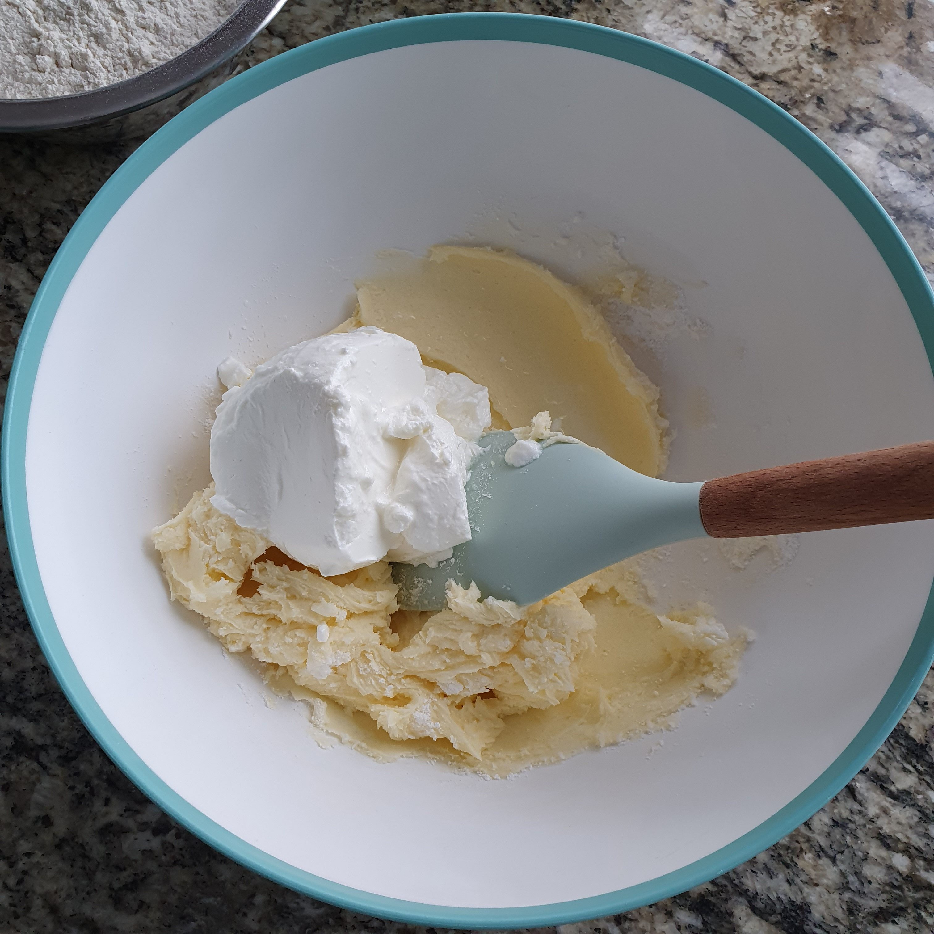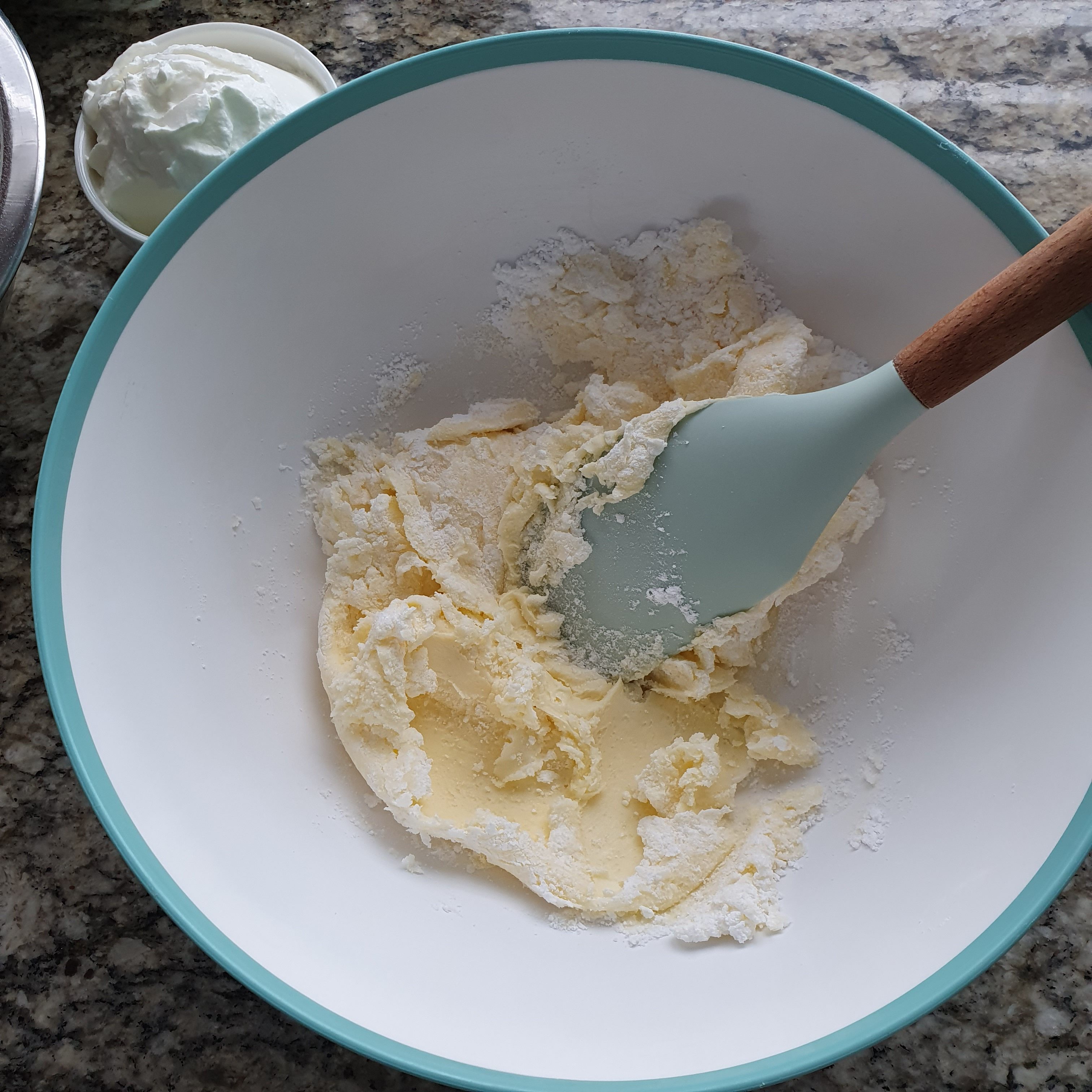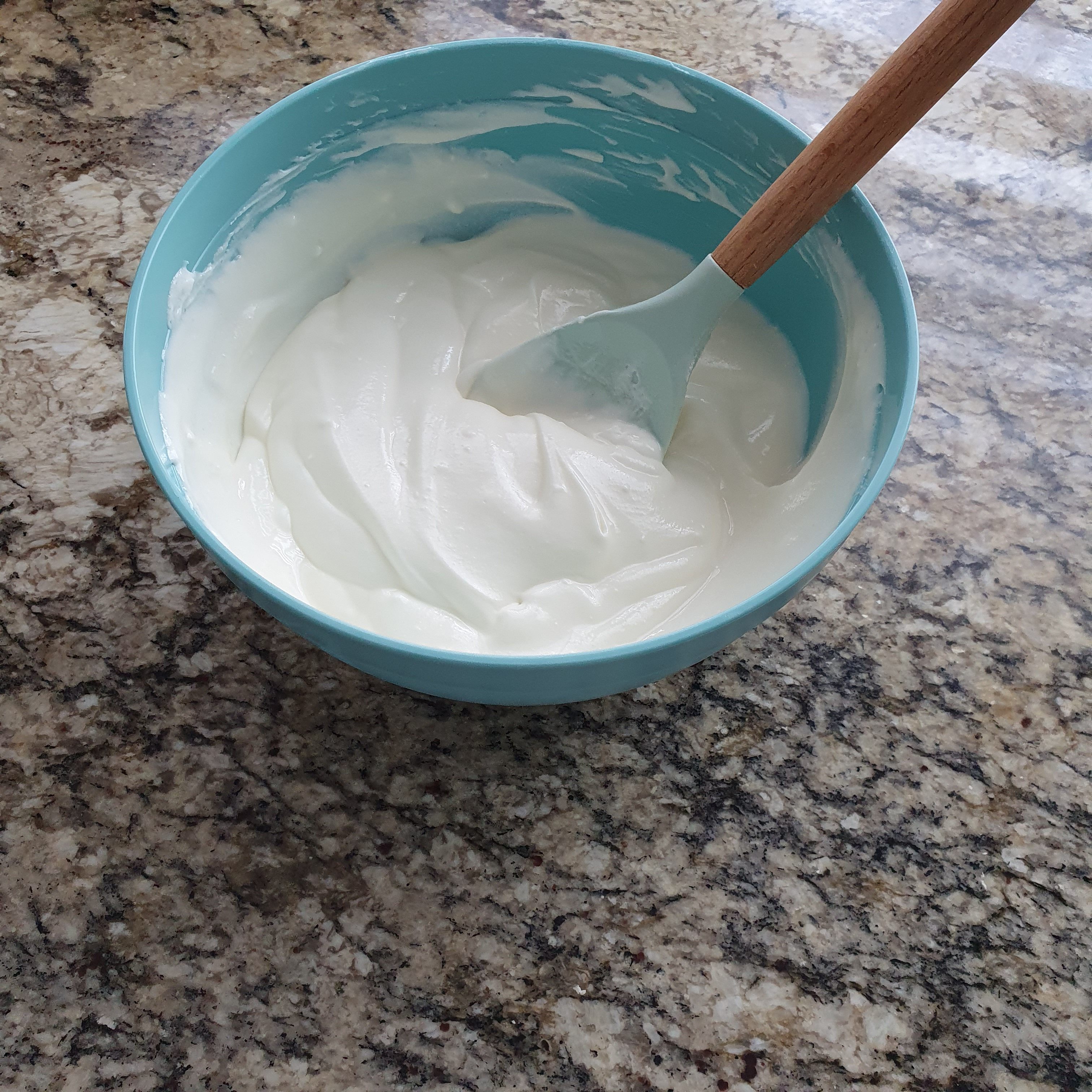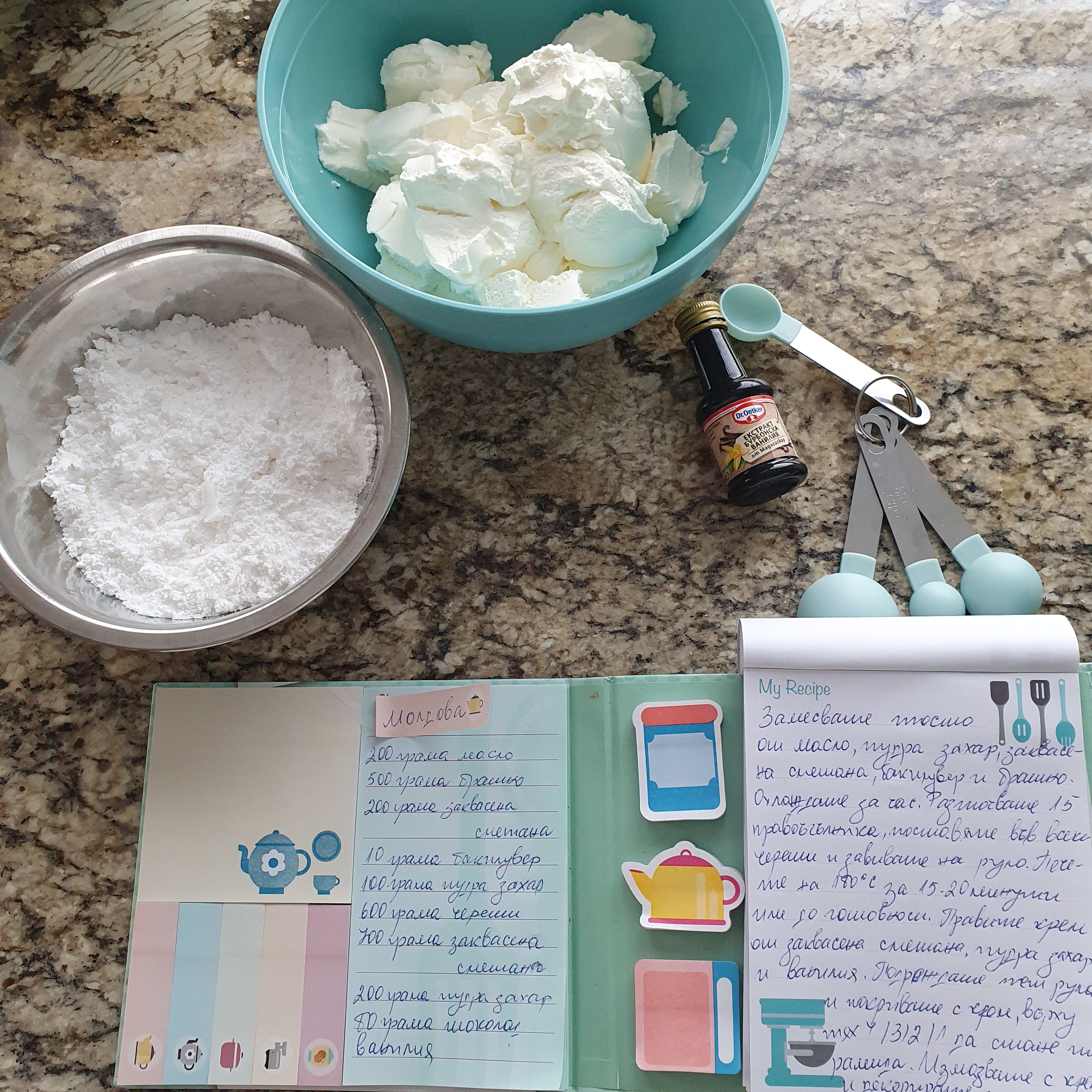 Направете крема като смесите заквасената сметана с пудрата захар и чаена лъжица ванилия. Сега ще си призная за един мързел, който имам – все не пресявам пудрата захар. 🙁 И после се налага много да бъркам докато сместа стане гладка. Не правете като мен.