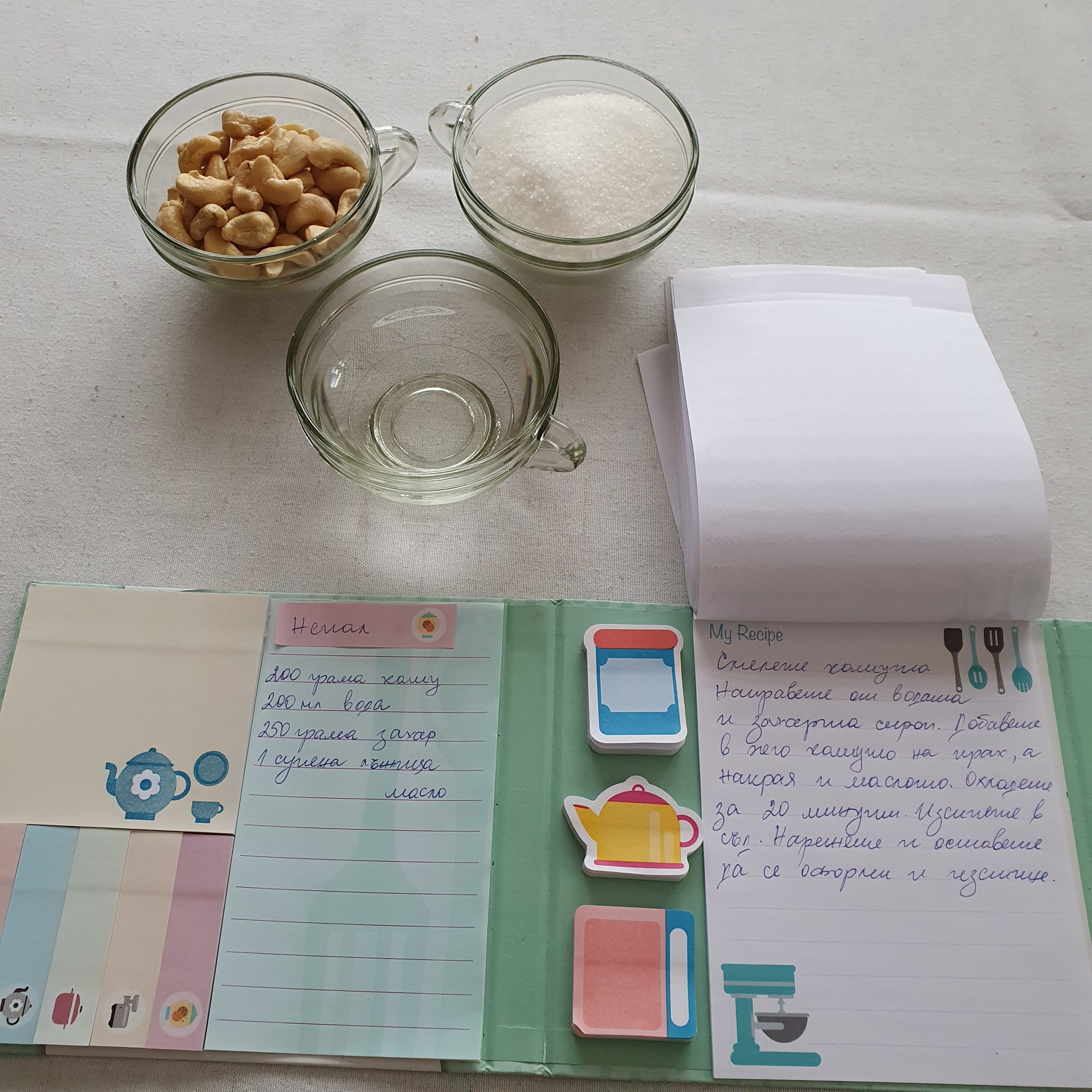 Хималайската кухня се доближава изключително много до тибетската. В нея преобладават ястия от пшеница и просо – основните култури отглеждани в тези части на Непал. В ежедневните ястия често се използват картофи, мляко от як и млечно-кисели продукти, зеленчуци и плодове, като папая, банани, плодове от хлебно дърво, манго, лимон, лайм, азиатски круши и др. Непалската кухня радва и с огромно разнообразие от десерти, повечето от които се приготвят от мляко. Сред най-обичаните са кхир – сладък млечен ориз, джалеби – хрупкави пържени спирали, потопени в сироп, барфи – млечен крем, расбари – хапки от сирене и лалмохан – пържени топки, потопени в сироп. Както забелязвате торти няма. Изобщо не се учудвам – това е Азия. Затова избрах да приготвя за вас десерт, който да има някаква идея да прилича на резен торта, но в никакъв случай не е. Аз по-скоро бих използвала съставките, за да направя пълнеж на бонбон. Но това е положението. Не ме съдете много за избора ми да направя Kaju barfi. Ето и необходимите продукти за него: