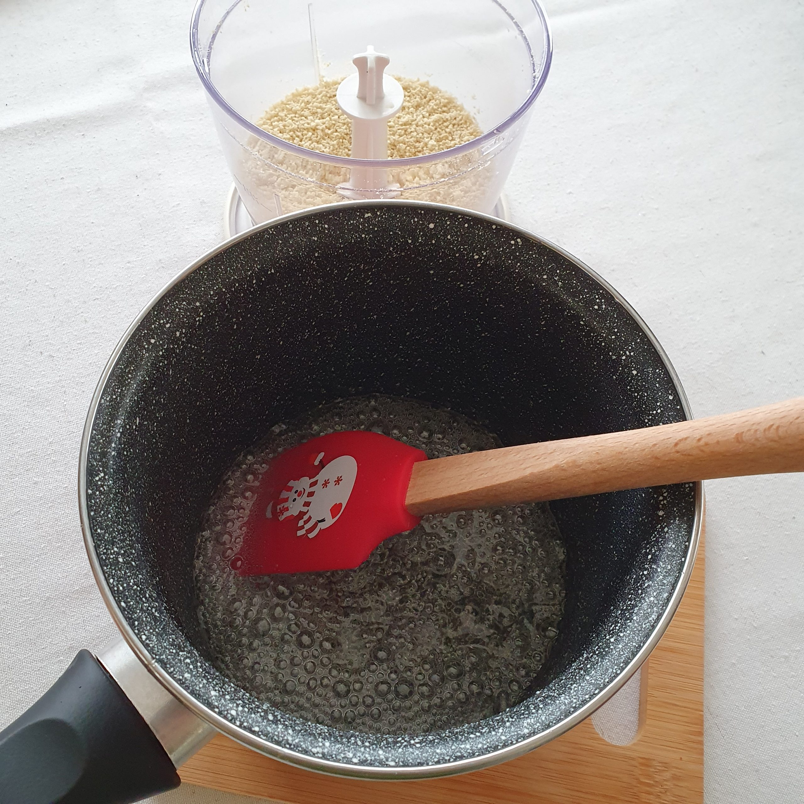 Смелете кашуто на брашно. В касерола от захарта и водата сварете сироп.