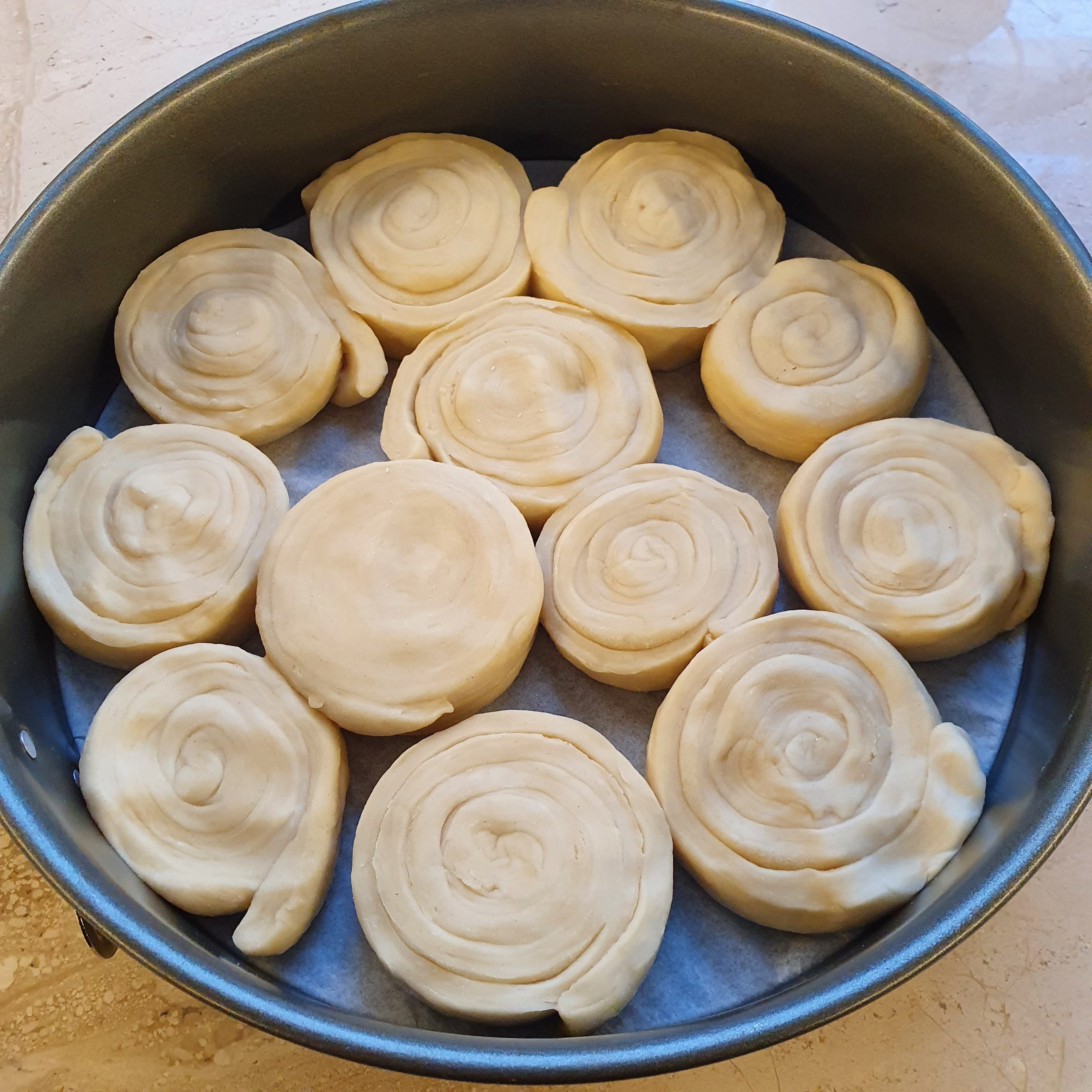 От тях оформете 12 топки като охлювчета. Поставете ги в намаслена тава и ги покрийте с кърпа да втасат.