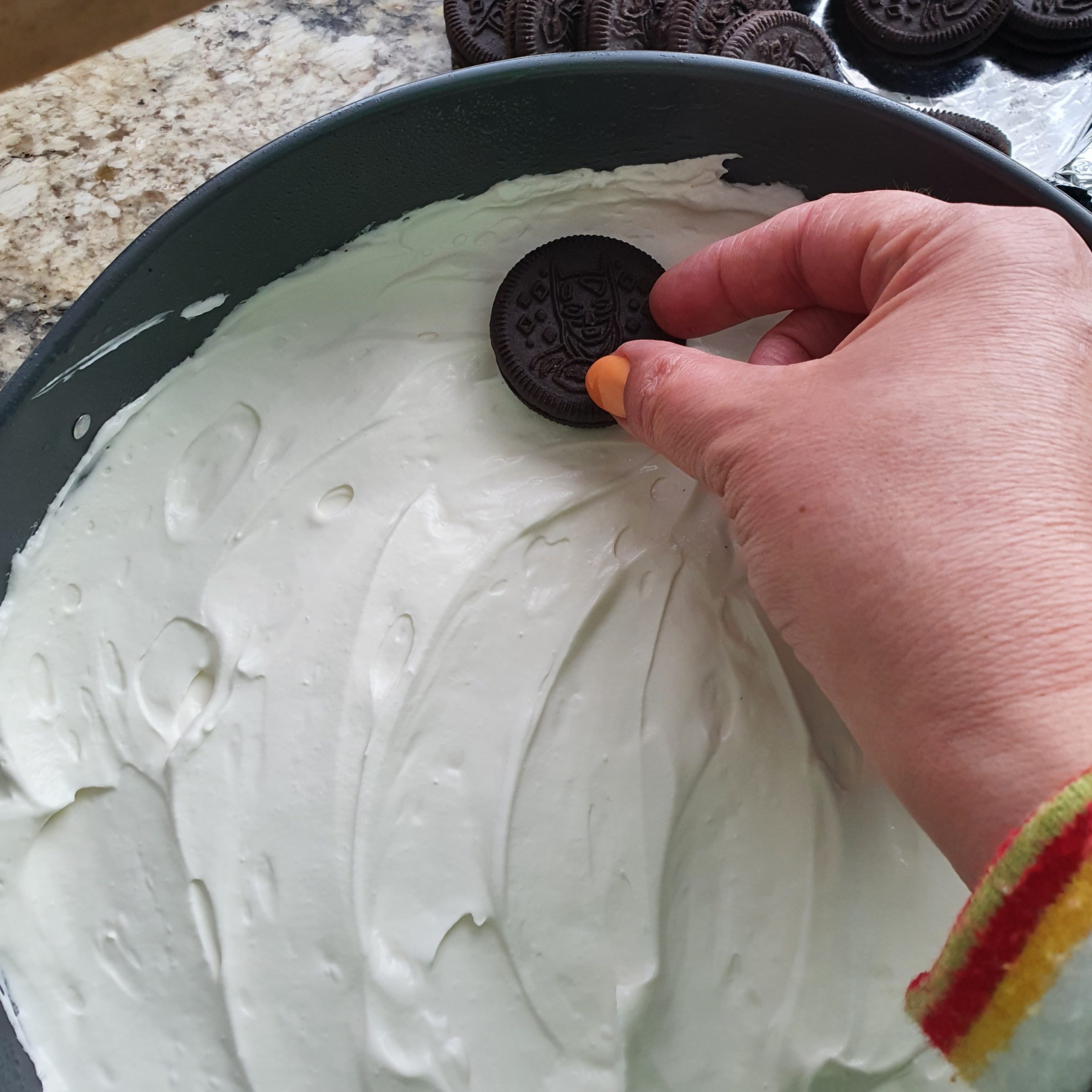 Изсипете половината от крема върху основата. След това подредете бисквитите “Орео”. Чак сега забелязах какви бисквитки съм купила. С Батман. 😀