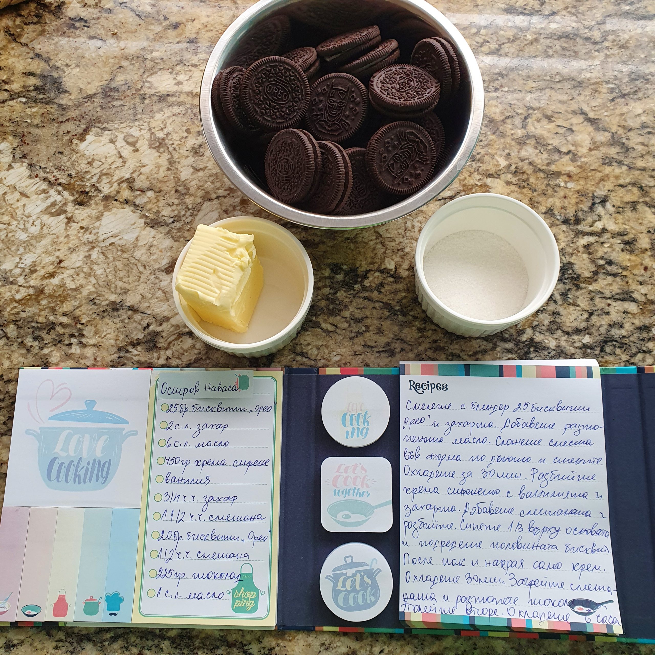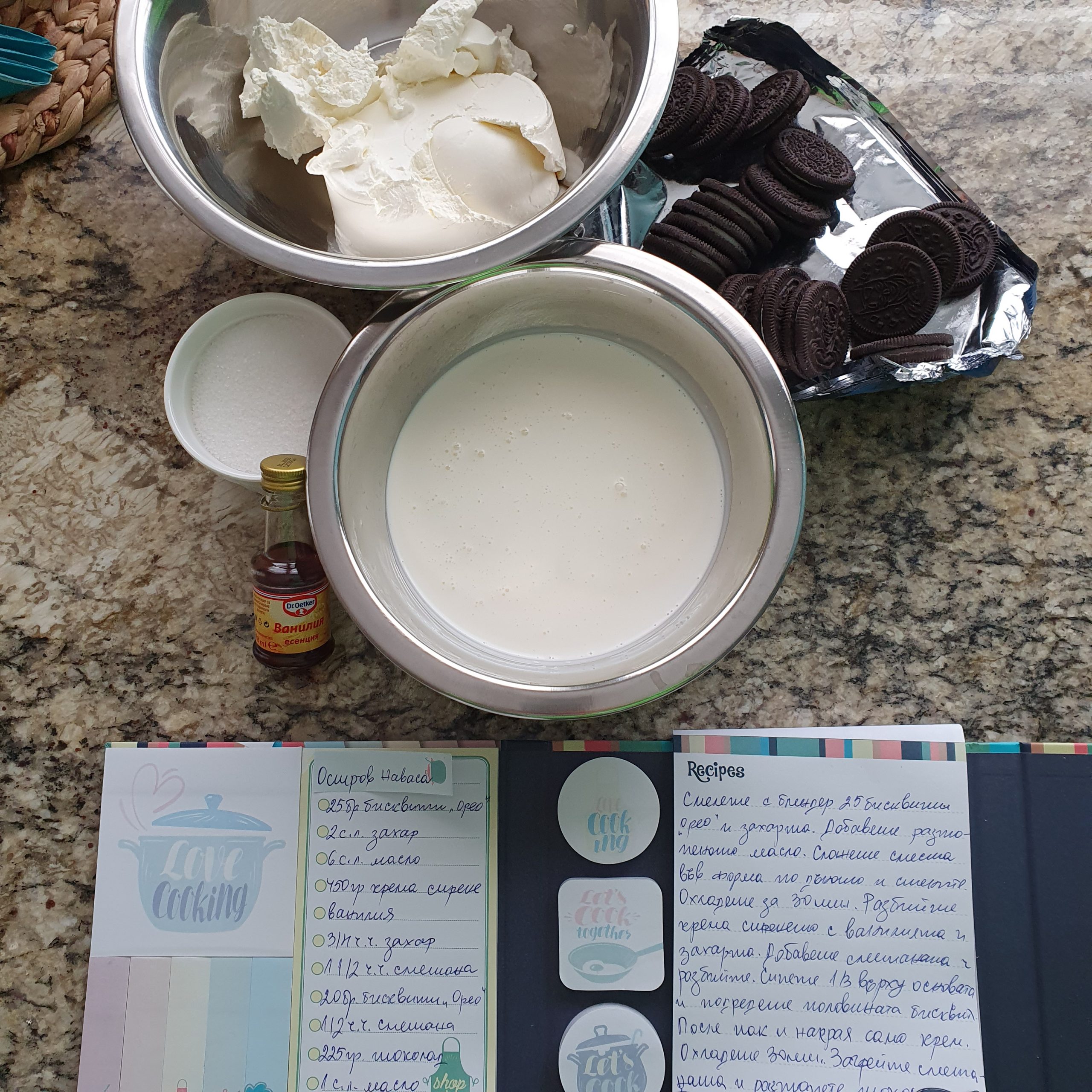 Малко взе да ми става скучно с тези острови, на които не живее никой. Няма какво да науча и да напиша, няма традиции, култура, кулинарни предизвикателства… Тъй като този остров е под управлението на САЩ тортата, която ще направя е американска. Един лесен чийзкейк без печене – “Oreo cheesecake”. Ето и необходимите продукти за него: