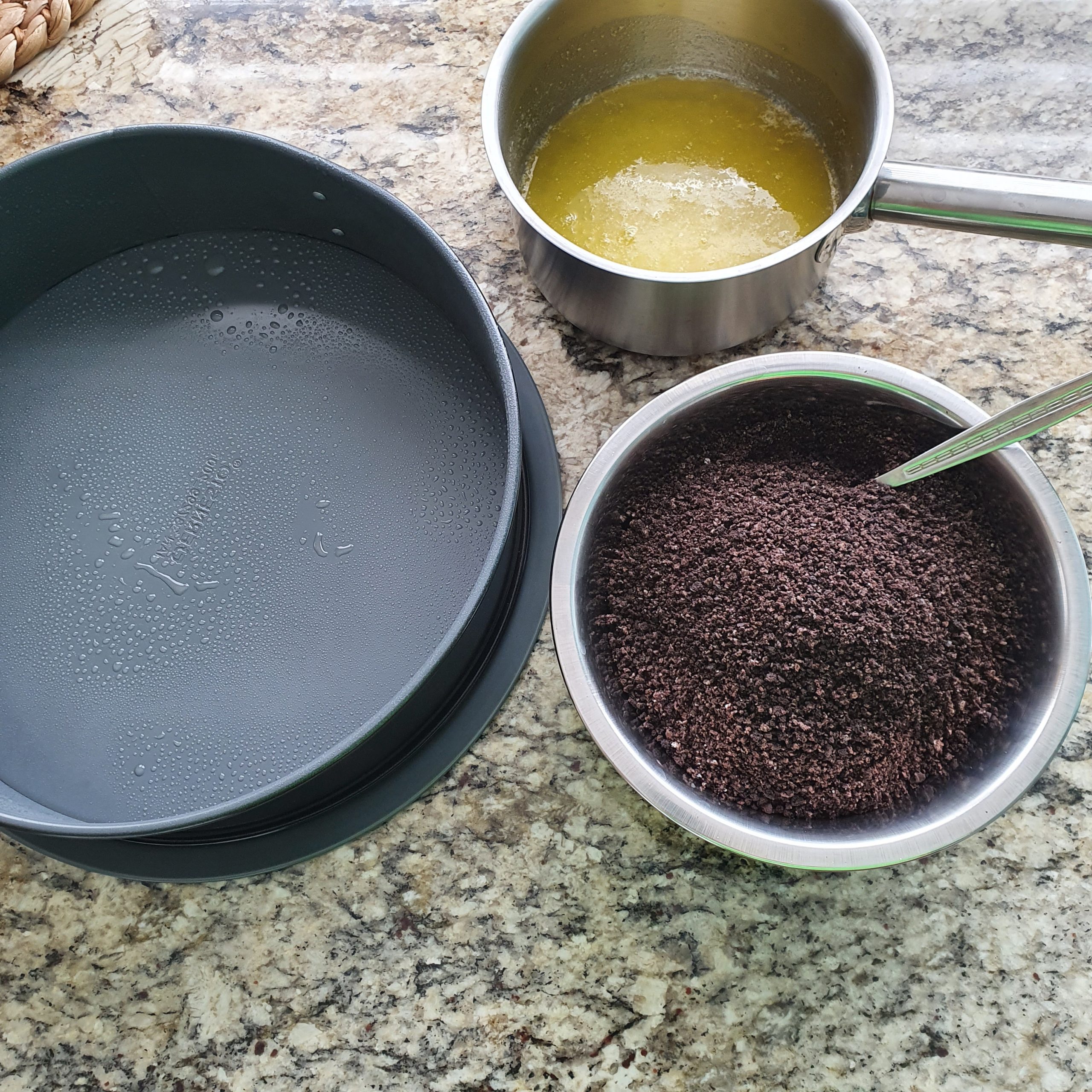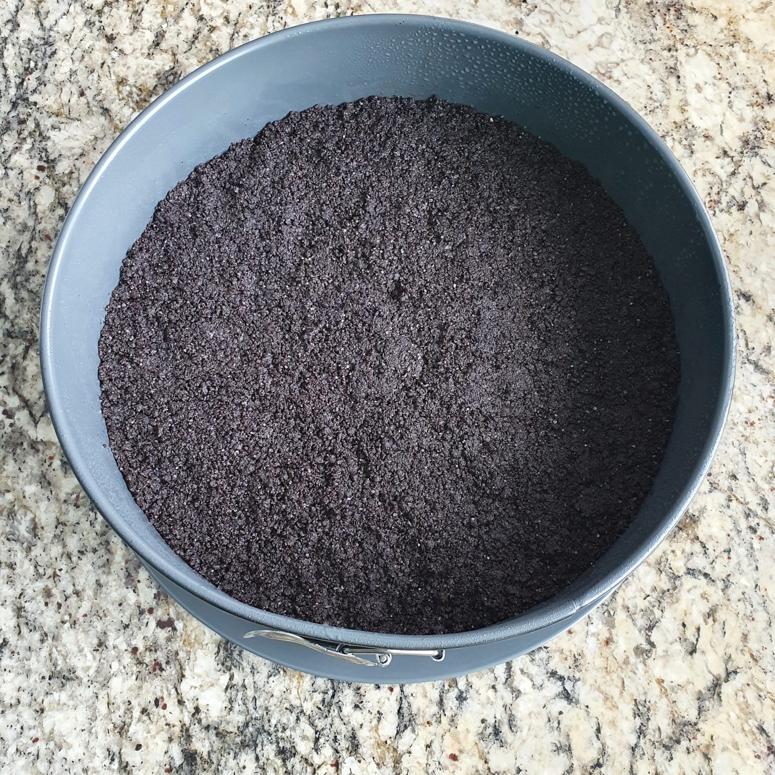 В блендер смелете бисквитите “Орео” заедно със захарта. Накрая добавете маслото и разбъркайте да се смесят. Напръскайте формата, в която ще правите чийзкейка с готварски спрей или намазнете с четка. Изсипете сместа и хубаво притиснете с лъжица или с дъното на чаша. Оставете в хладилника да се охлади за половин час.