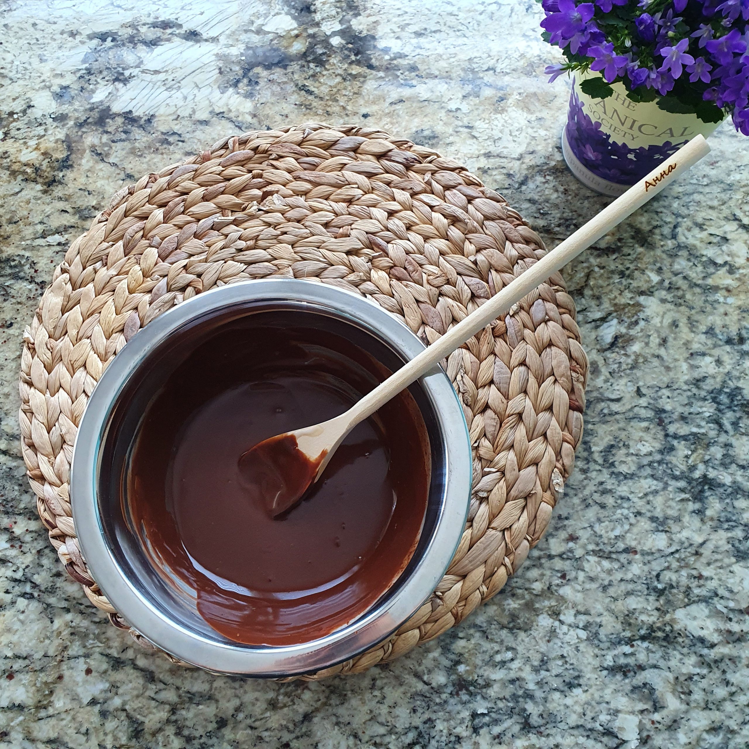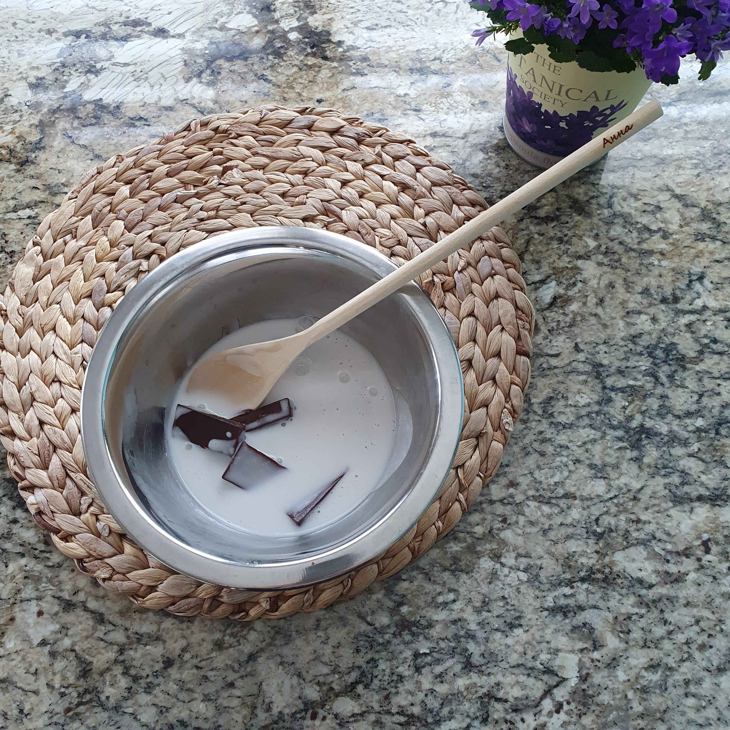 Изсипете кипналото кокосово мляко върху шоколада.
