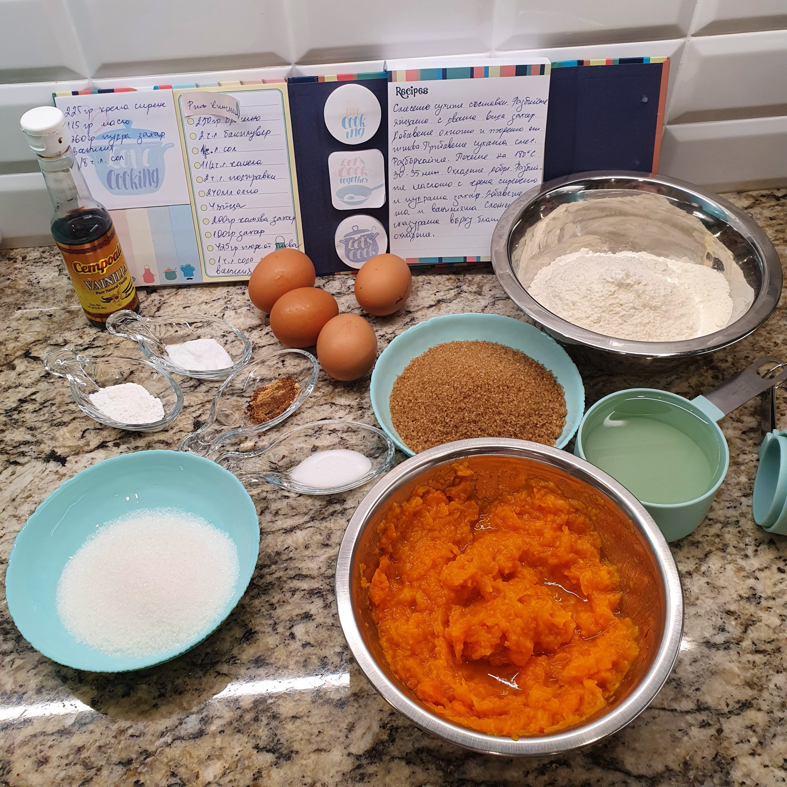 В рецептата пишеше, че е по-добре да се ползва тиквено пюре от консерва, защото е по-гъсто от прясно сварена и пасирана тиква. За жалост не разполагах с такова и използвах прясна тиква, която реших да опека, за да има по-малко влага.