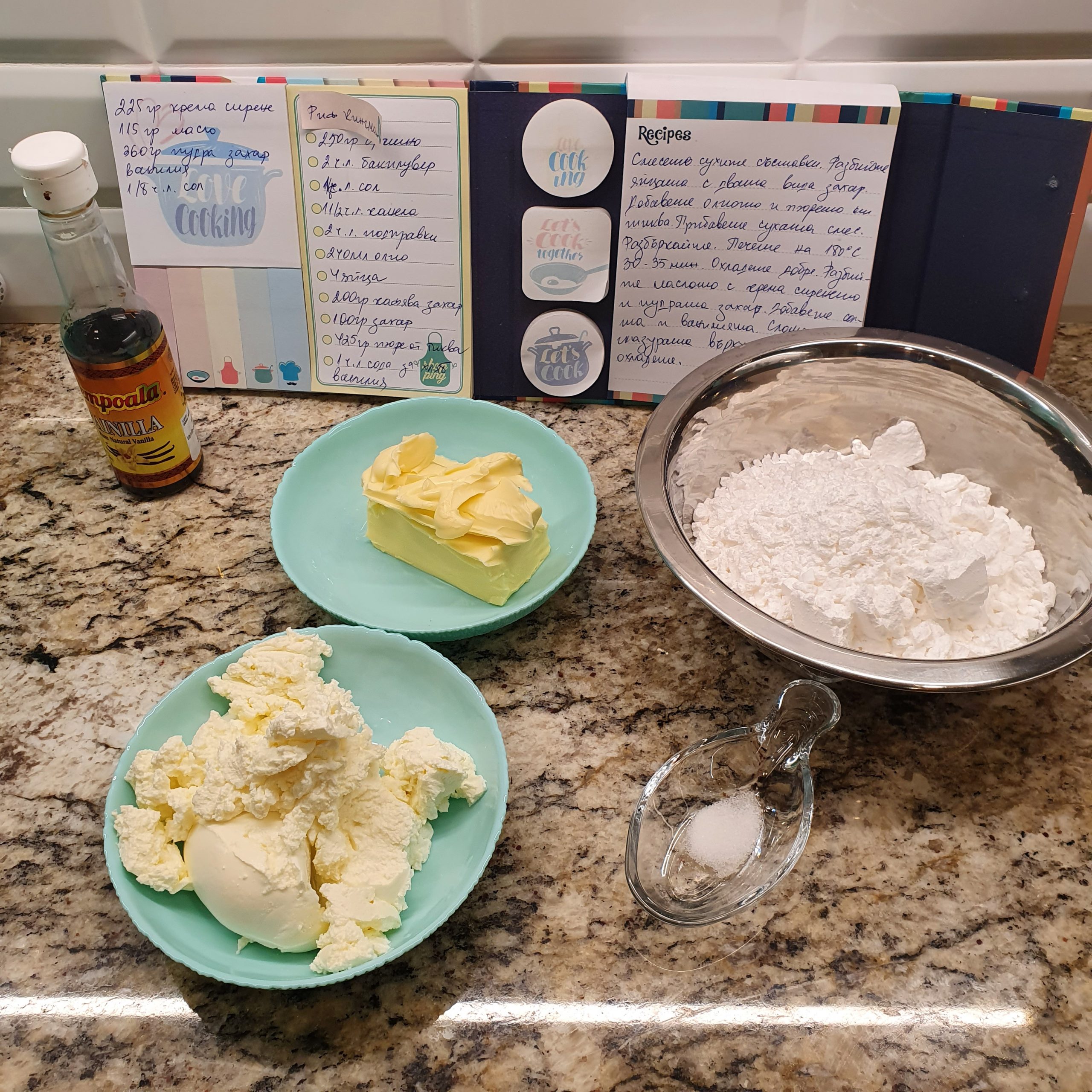 Разбийте крема сиренето, маслото и захарта на гъст крем.