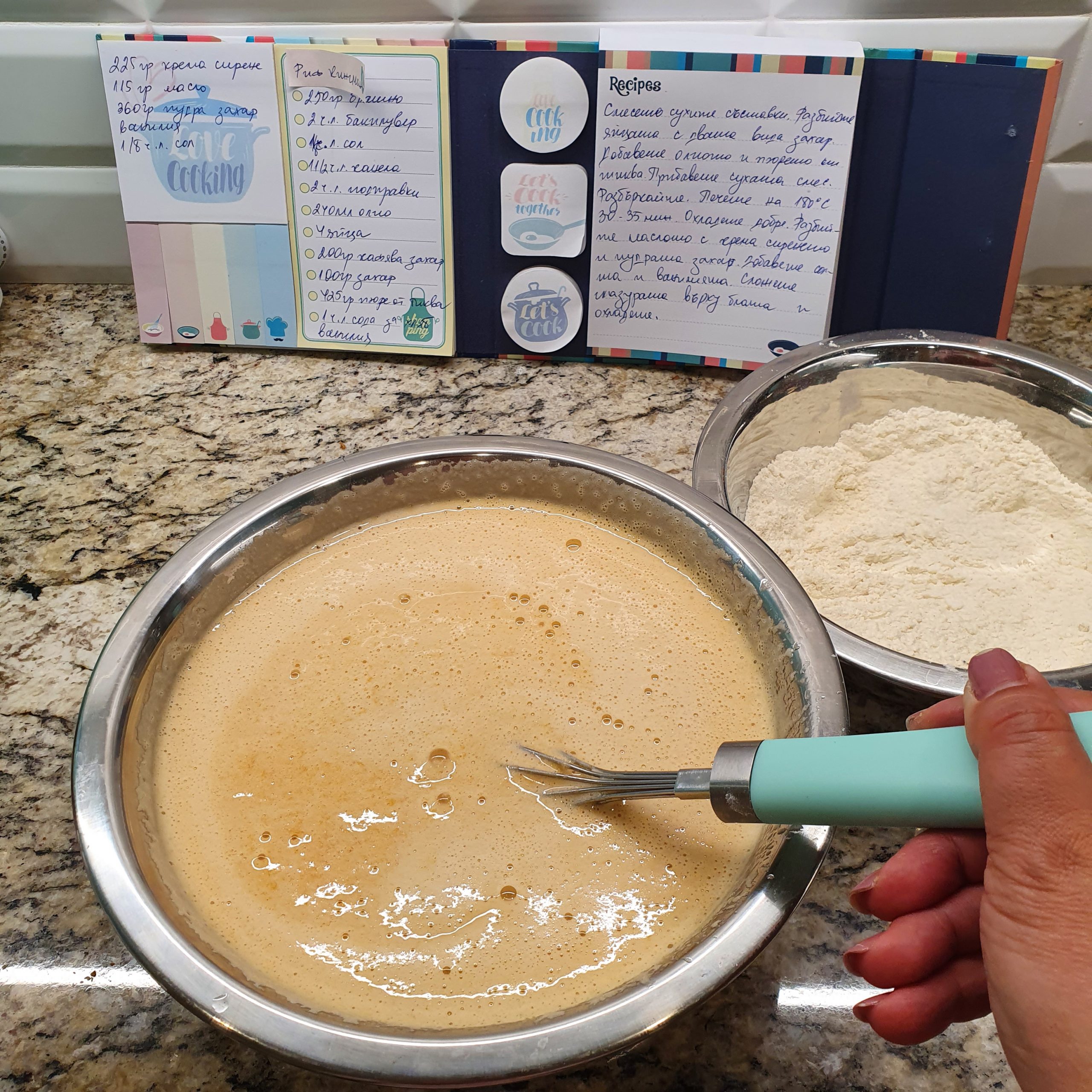 Смесете сухите и мокрите съставки и разбъркайте до хомогенност.