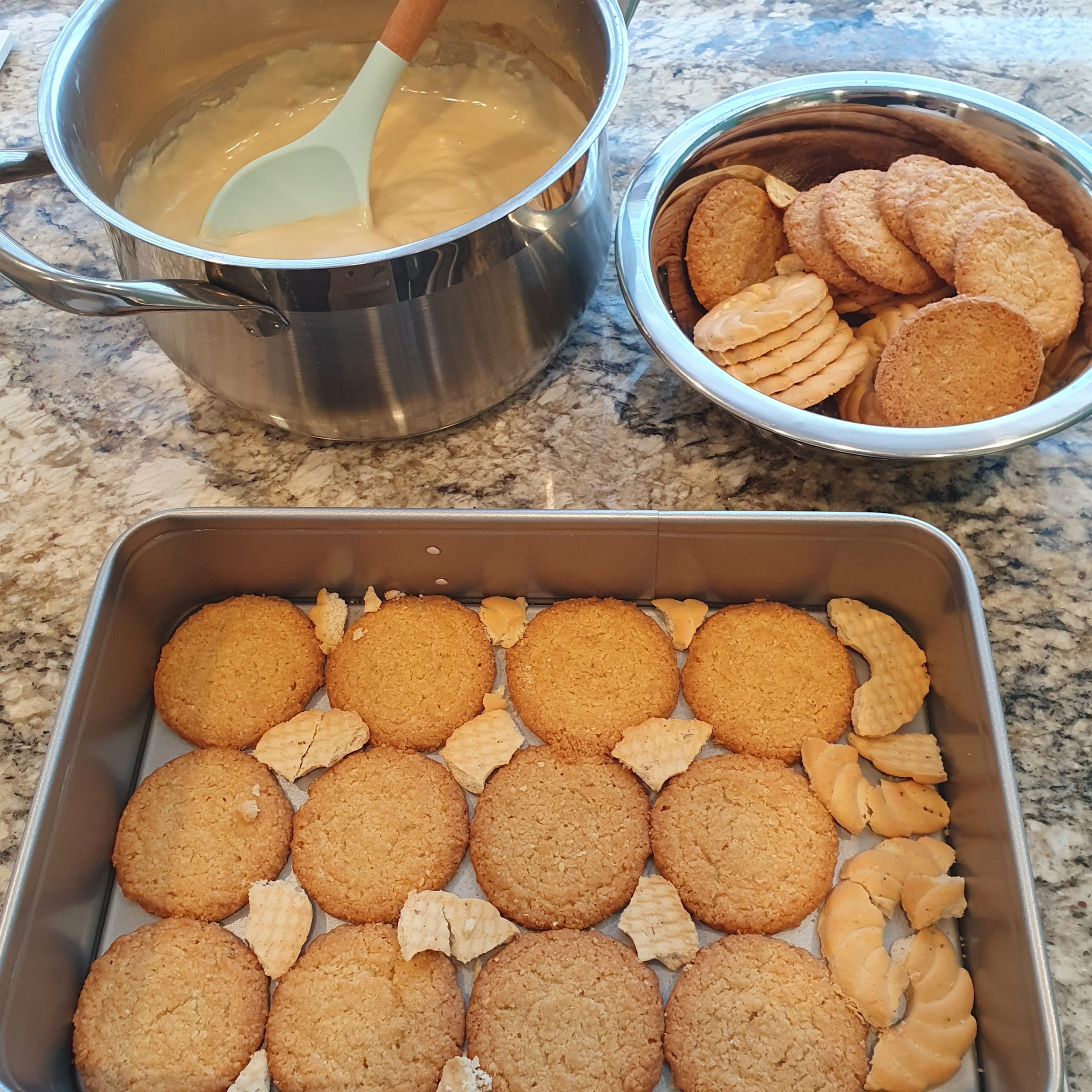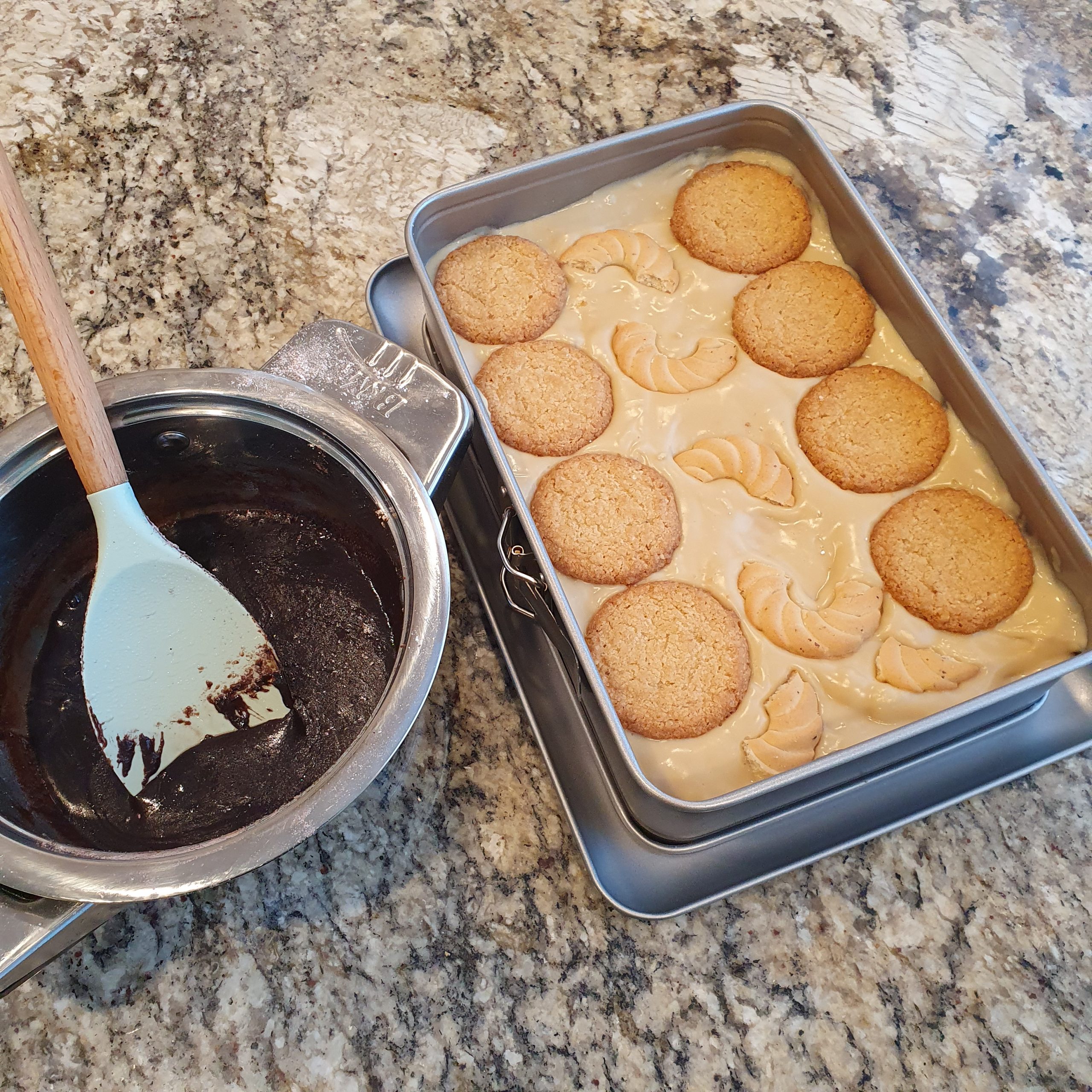 Изсипете върху бисквитите и разнесете да стане равномерен слой.