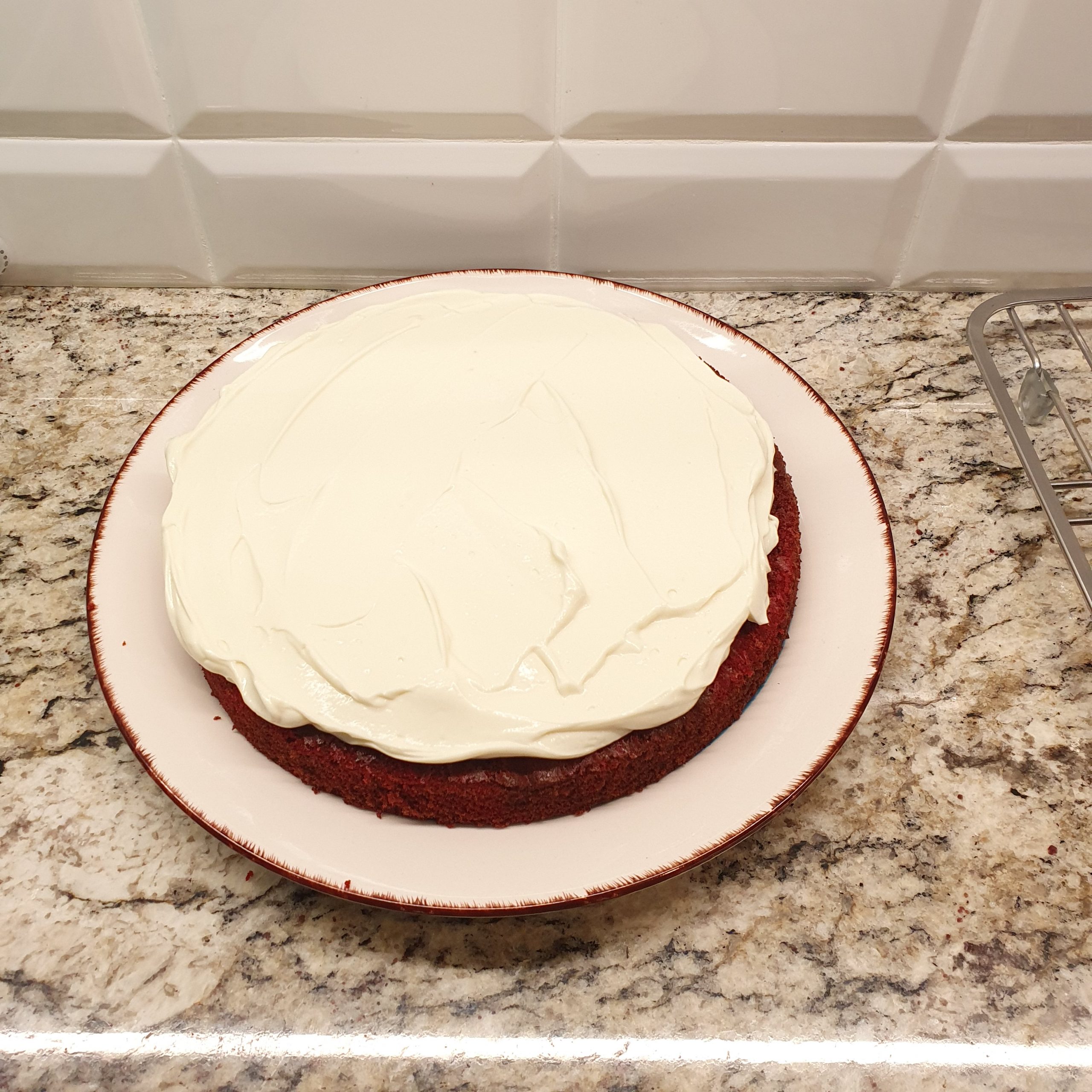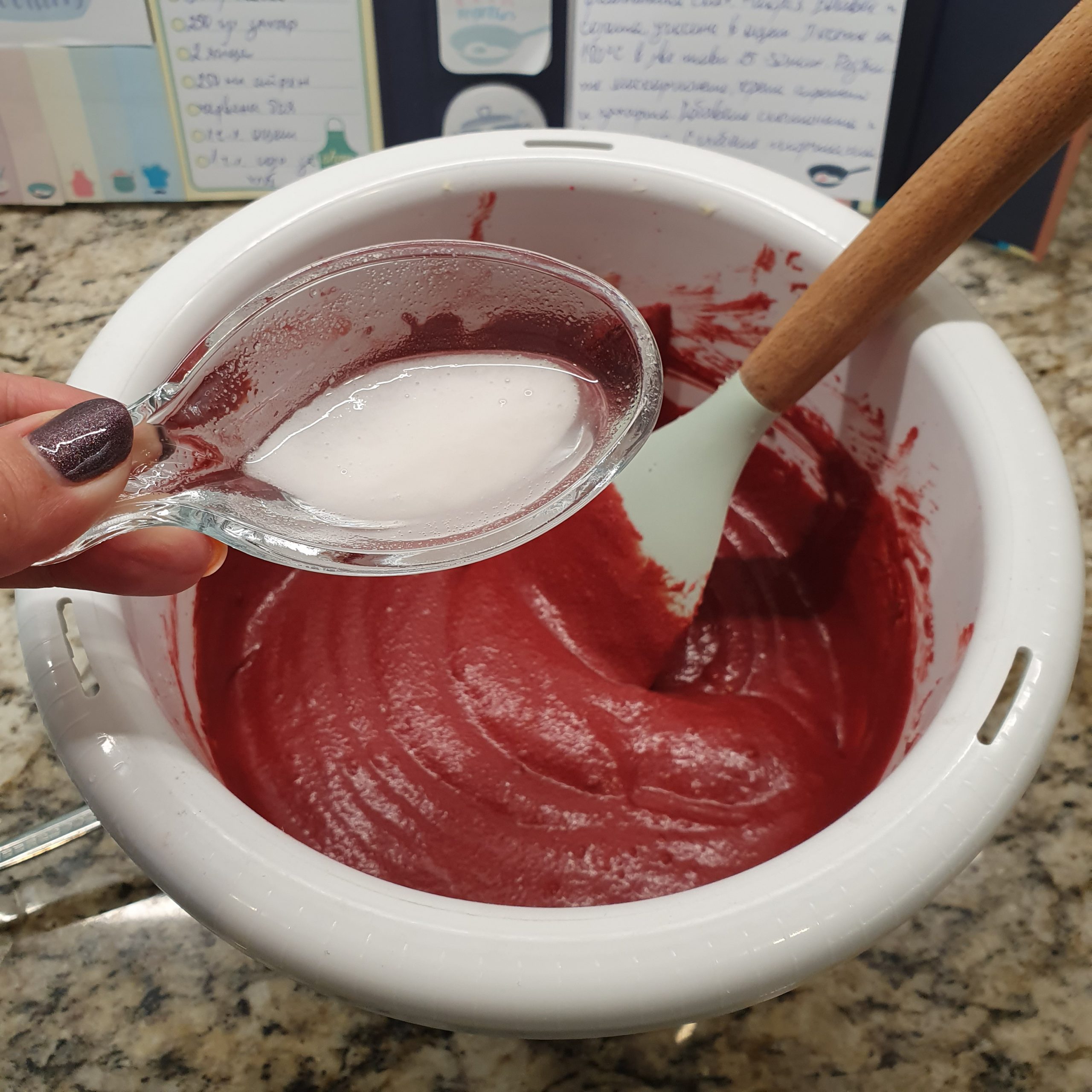 Смесете айряна с червената боя. Добавете толкова колкото искате да стане червено. Аз не обичам да прекалявам, защото не търся ярък червен цвят като на купените торти. Заради какаото, което се добавя ярко червен цвят е трудно постижим.