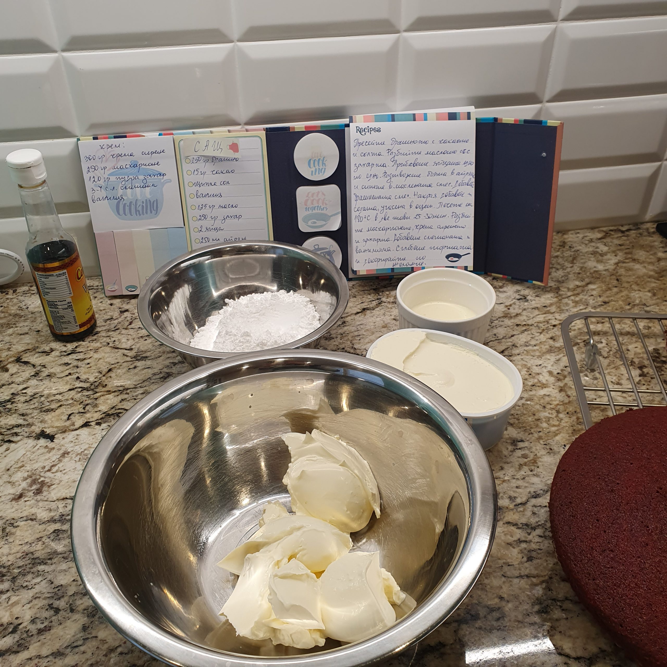 Кремът се прави много лесно. Разбийте крема сиренето с маскарпонето и захарта. Прибавете ванилията и накрая сметаната.