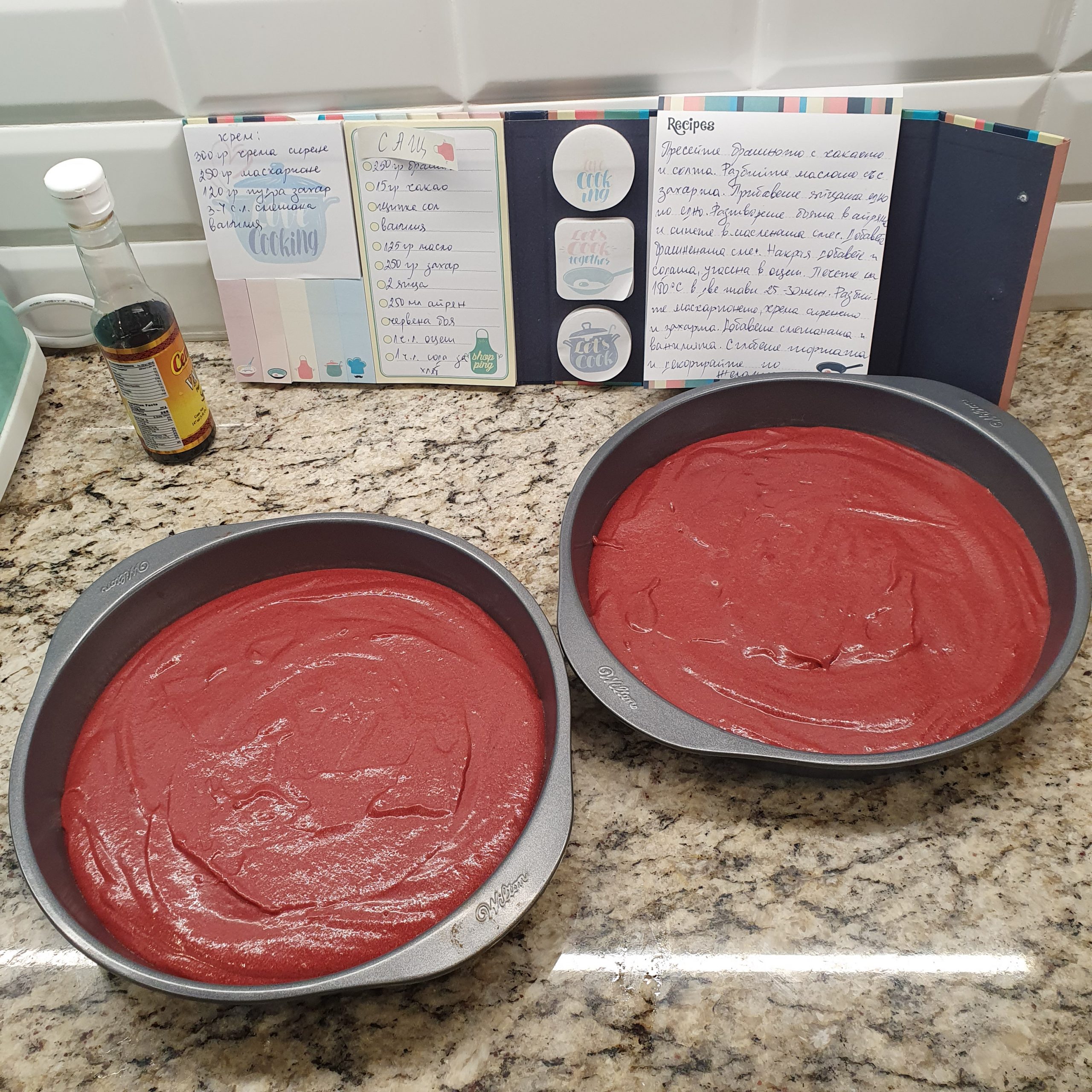 Компанията Adams Extract Company и хотел Waldorf Astoria в Ню Йорк твърдят, че са измислили тортата “Червено кадифе”. Независимо дали е вярно тази торта се издига на видно място в средата на 1900 г. в Съединените щати. Използването на какао в тортата омекотява вкуса, което дава в името добавката „кадифе“. Самата торта е ефирна заради смесването на айрян (мътеница), сода и оцет. Какаото се добавя към тестото, без да го превзема като вкус. Блатовете се покриват с маслена и богата глазура от крема сирене. Добавянето на червения цвят към тестото има смисъл, според Adams Extract (компания за бои), защото “Популярните червени торти биха продали повече червени хранителни оцветители”. 😀 Без червеното багрило тортата е с по-светъл шоколадов оттенък и също толкова вкусна и може просто да бъде наречена „кадифе“. 🙂 По време на Втората световна война и Депресията червеният цвят е идвал от варено цвекло. Именно тази торта избрах да приготвя за вас днес. Ето и необходимите продукти: