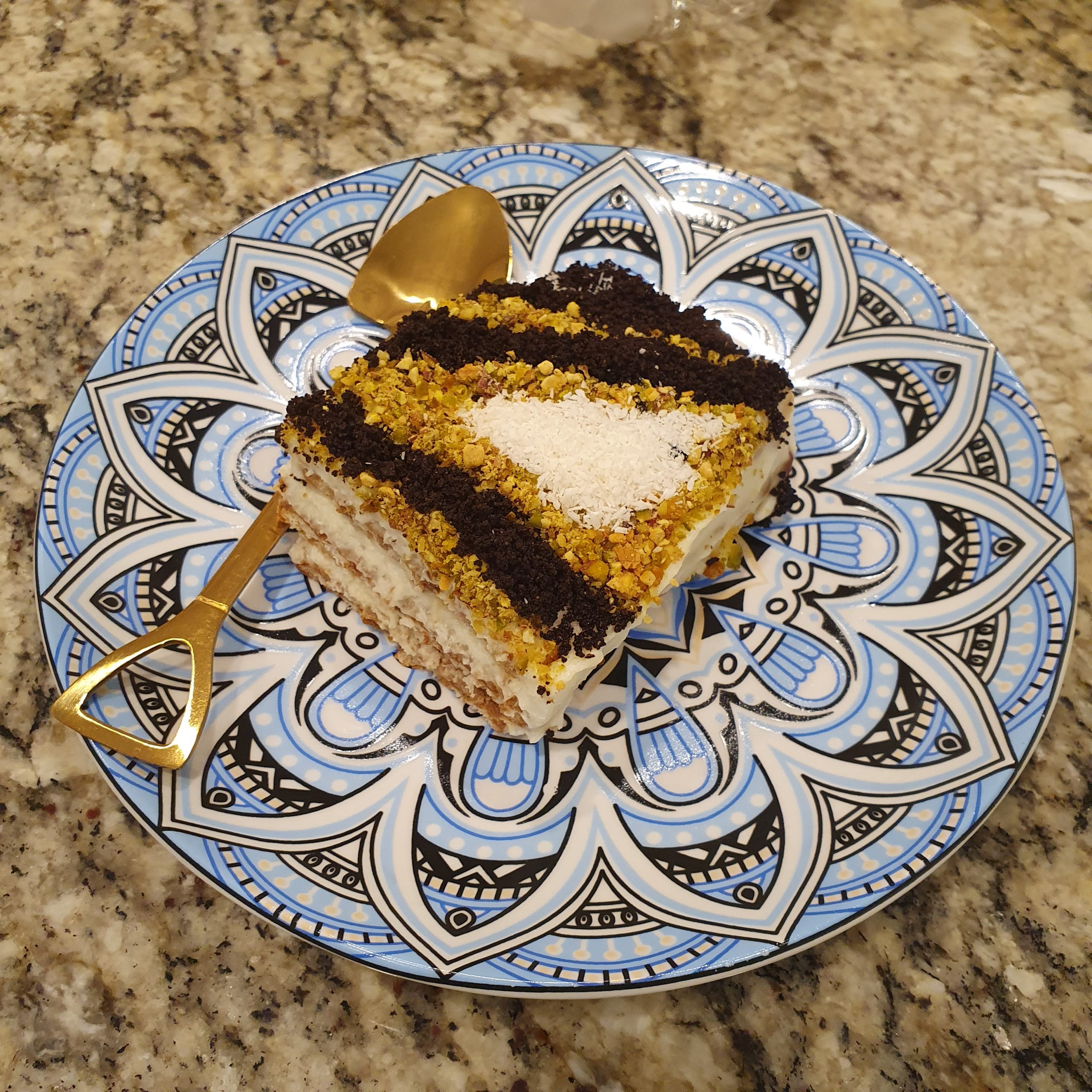 Накрая оформете някаква шарка с помощта на смлените бисквити, ядки и кокос да наподобява шарка на килим.
