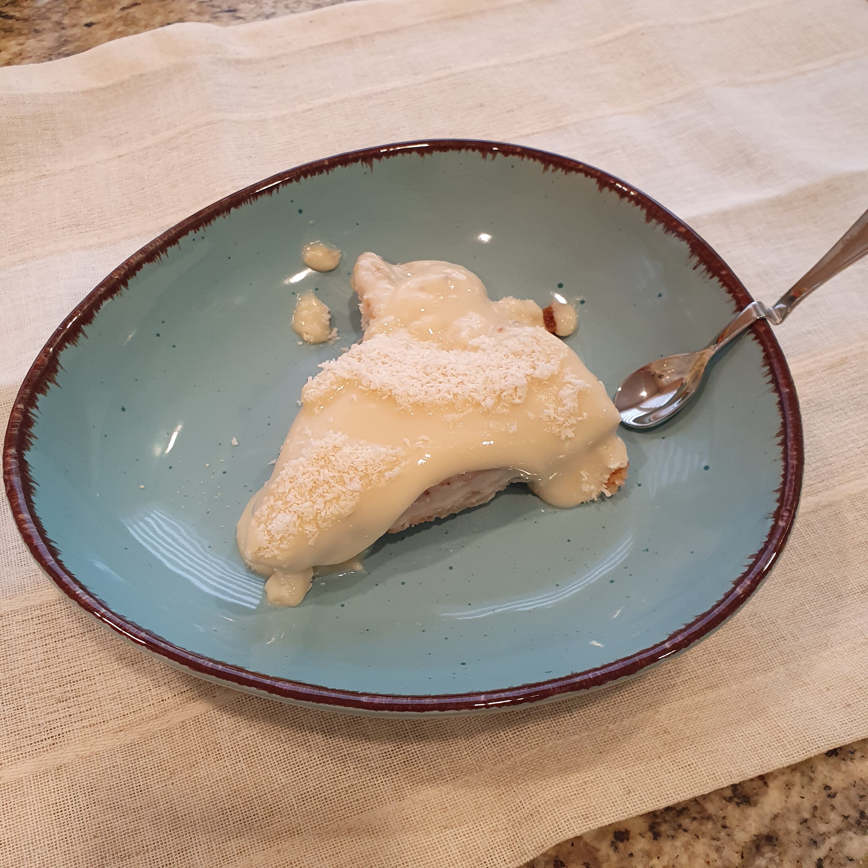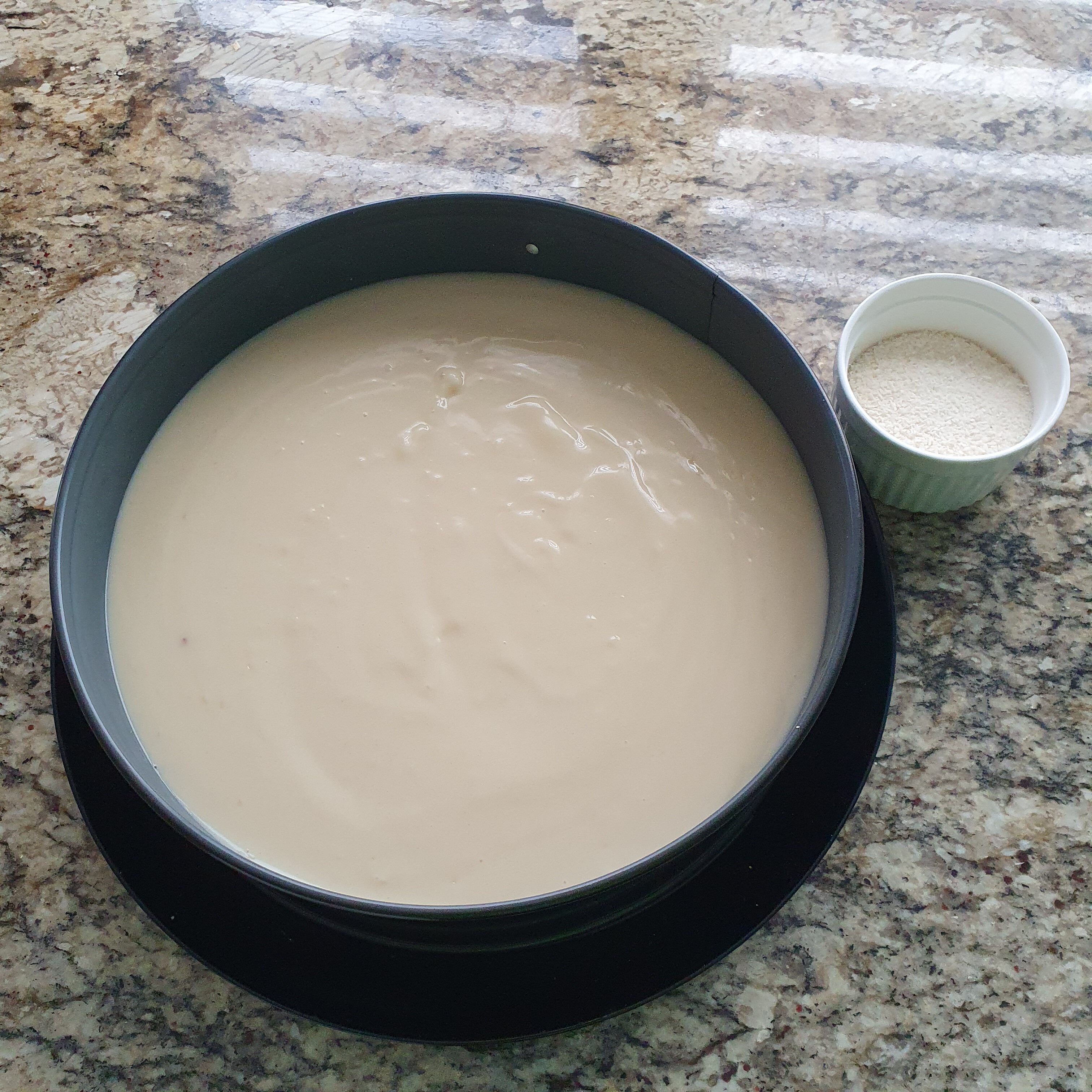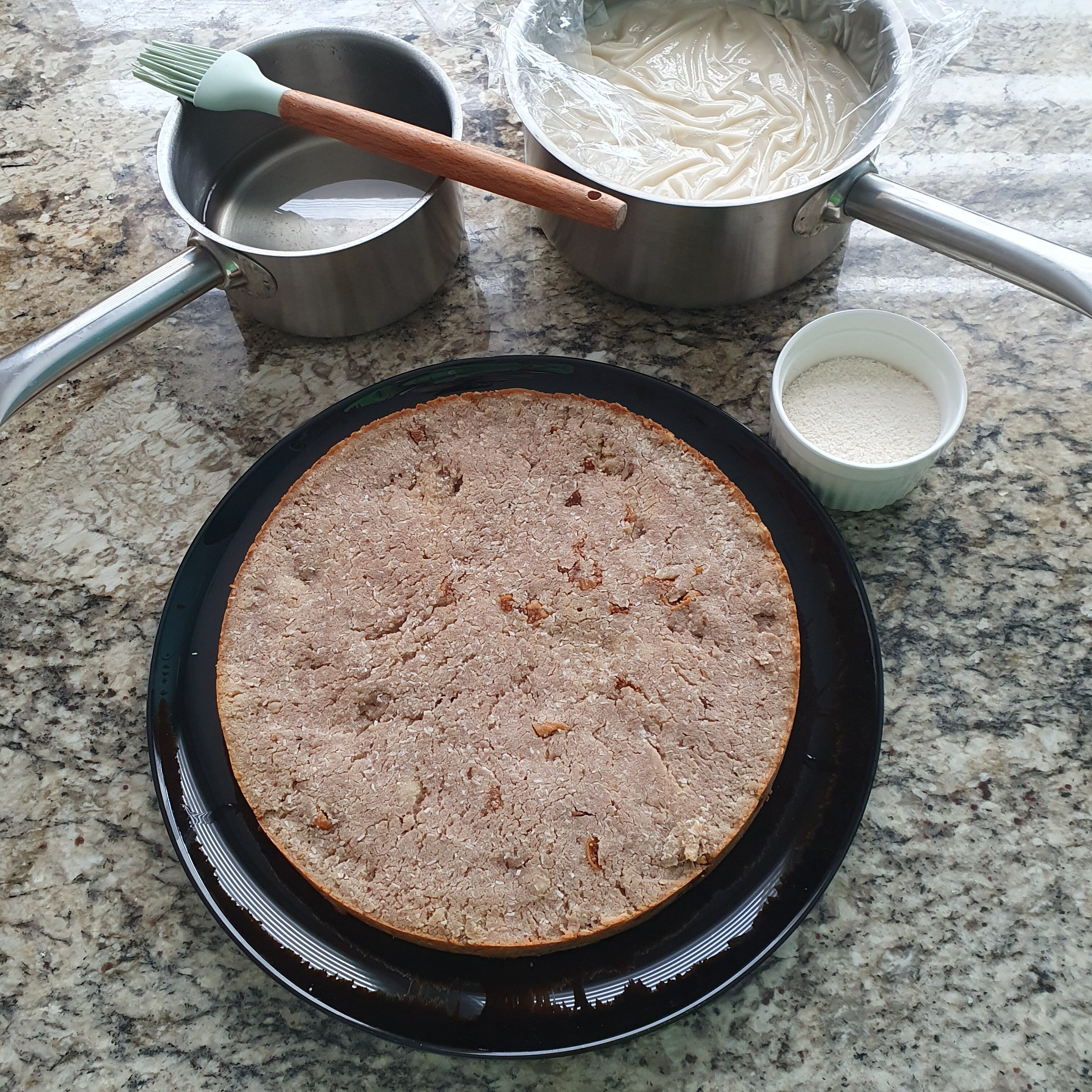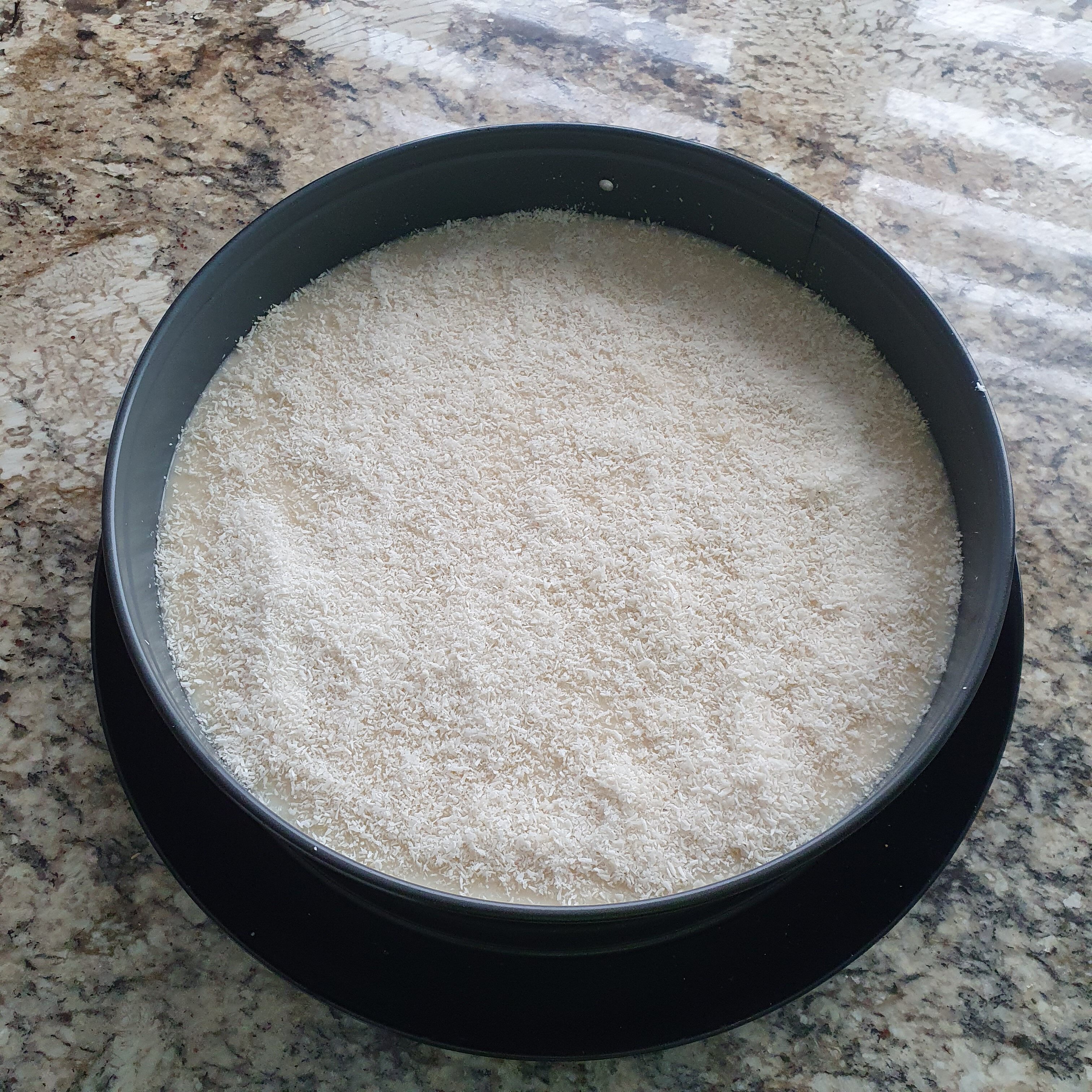 Сиропирайте основата и изсипете крема отгоре. Поръсете с кокоса.