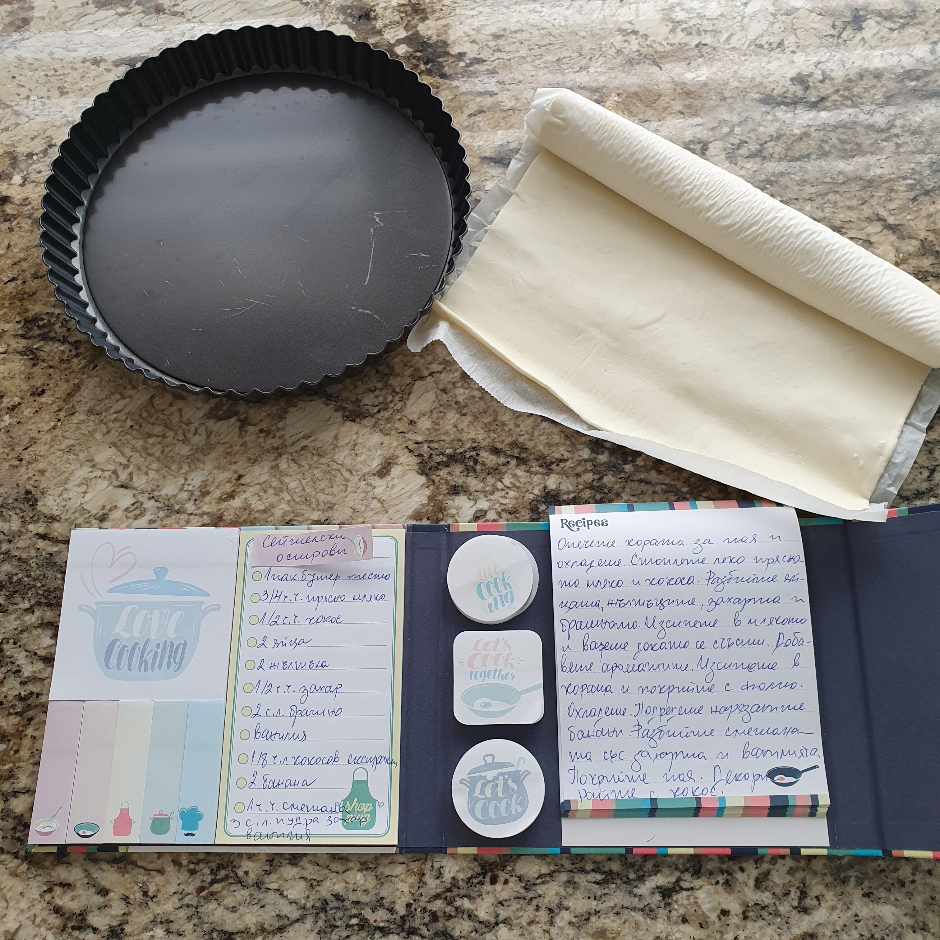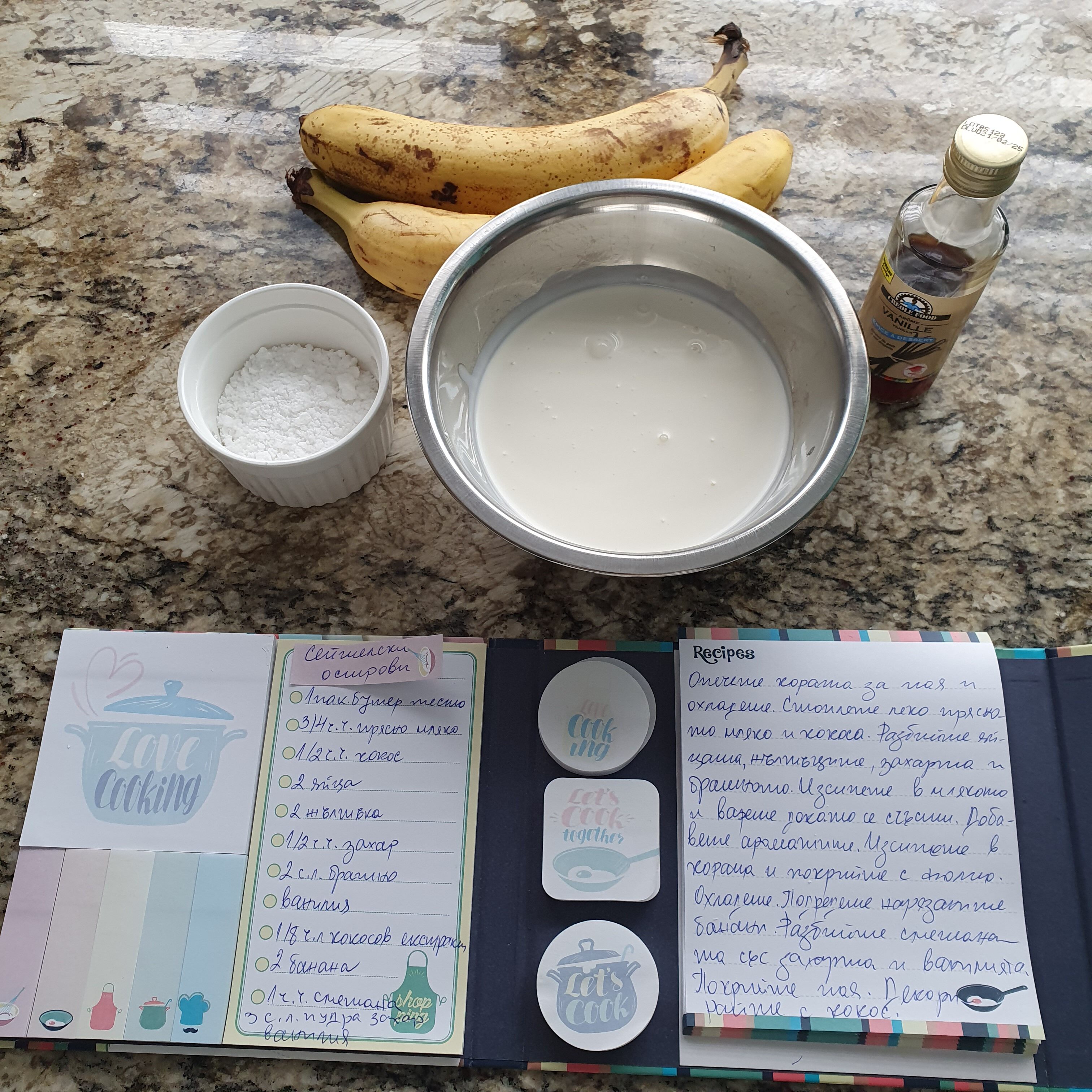 За вас ще направя “Banana coconut cream pie”. И не, защото го приготвят на Сейшелите. Там са други десертите и както на повечето острови преобладават вкусните плодове. А защото в тази рецепта има две съставки, които са емблематични за кухнята на Сейшелите – банани и кокос. Понякога и аз хитрувам в избора на рецепти. Най-вече, когато съм изпаднава в абсолютна невъзможност да намеря каквата и да е рецепта за торта от даденото място. 🙂 Ето и необходимите продукти за пая: