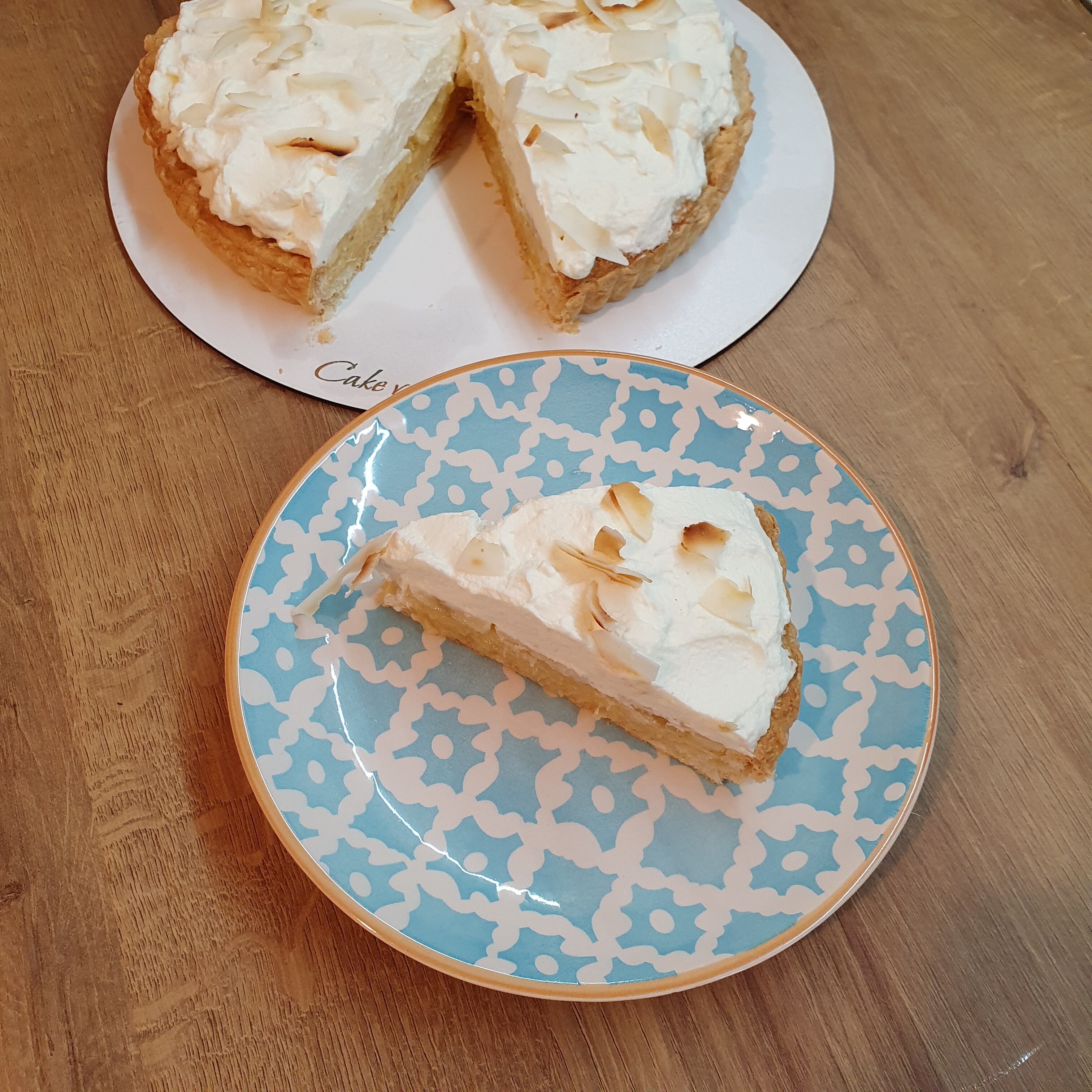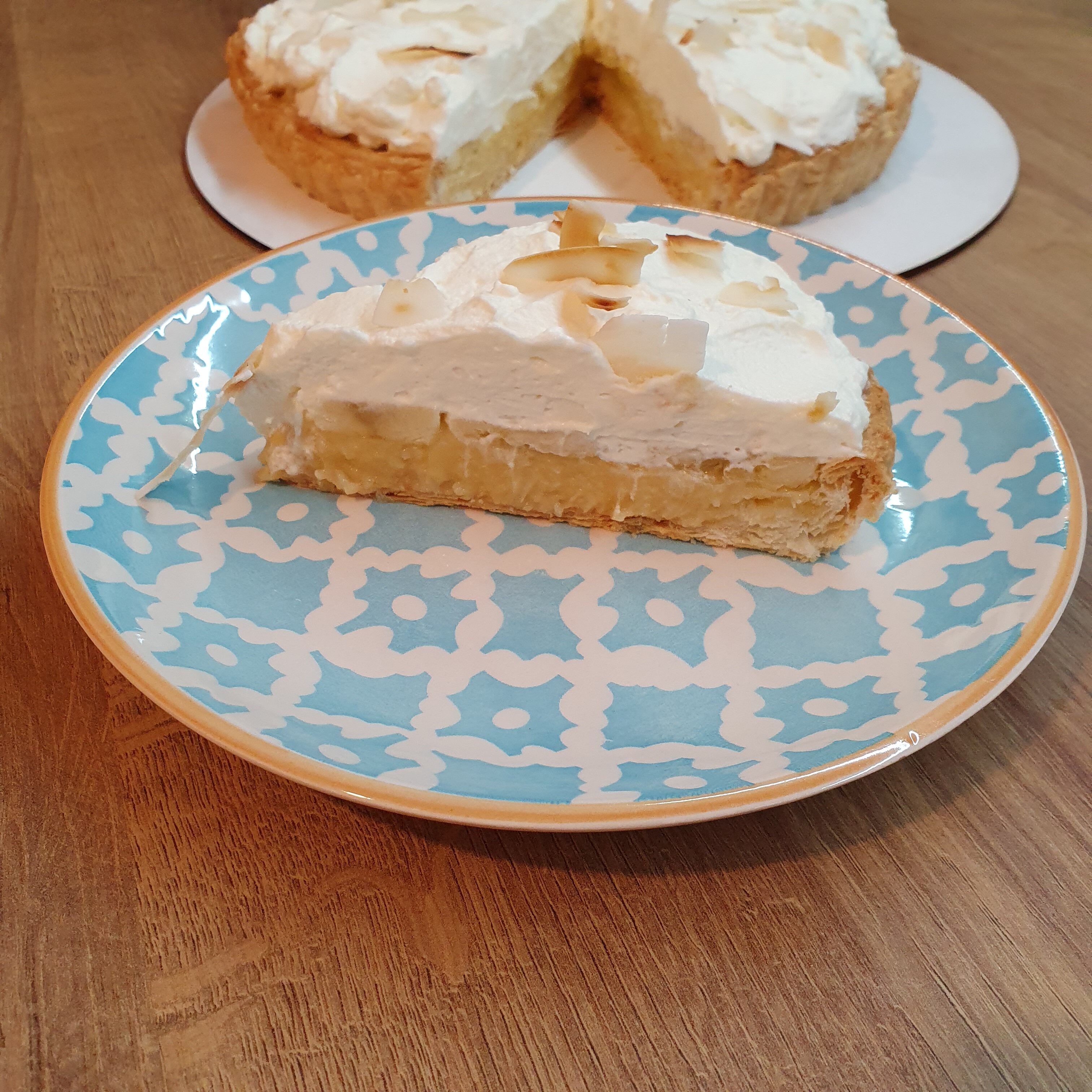Тортата е страхотна – лека, свежа, бананово-кокосова и много вкусна. Както се вижда от снимките не ме бива да направя перфектната кора за пай от многолистно тесто. Ръбчетата не са равни. Уж не е кой знае какво, но явно нещо ми липсва като умение. Предполагам, че не разточвам перфектно тестото и заради минимални разлики в дебелината се получава някакво леко “смъкване” на борда при печене… Ще се науча. Амбицирах се. 😉 Хората, които я хапнаха изобщо не забелязаха този дефект, защото вкусът ги завладя. А и със завършека от сметана дефектът не личеше, само аз си знаех за него. 😉 Горещо препоръчвам да се опитате да я направите. Няма да съжалявате.