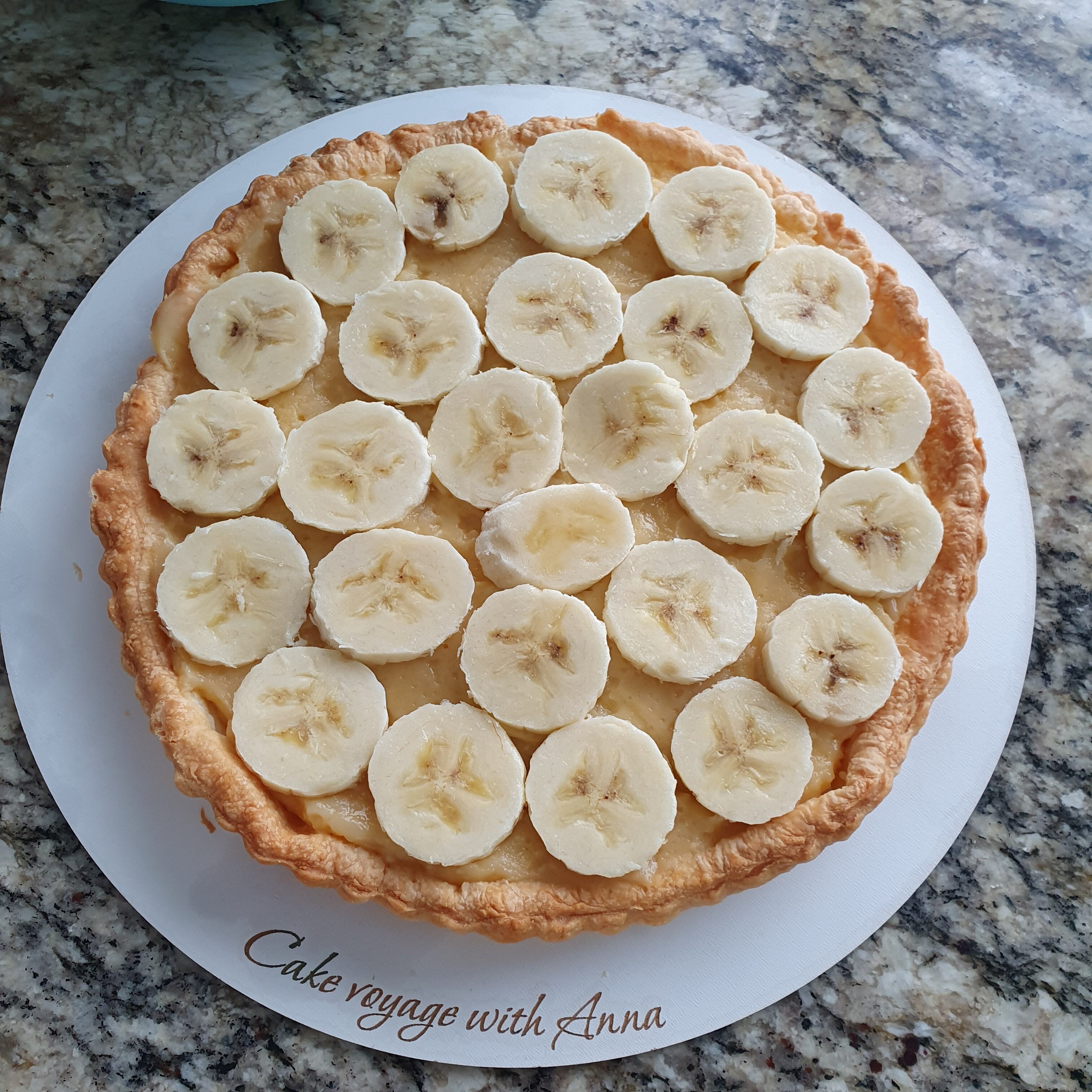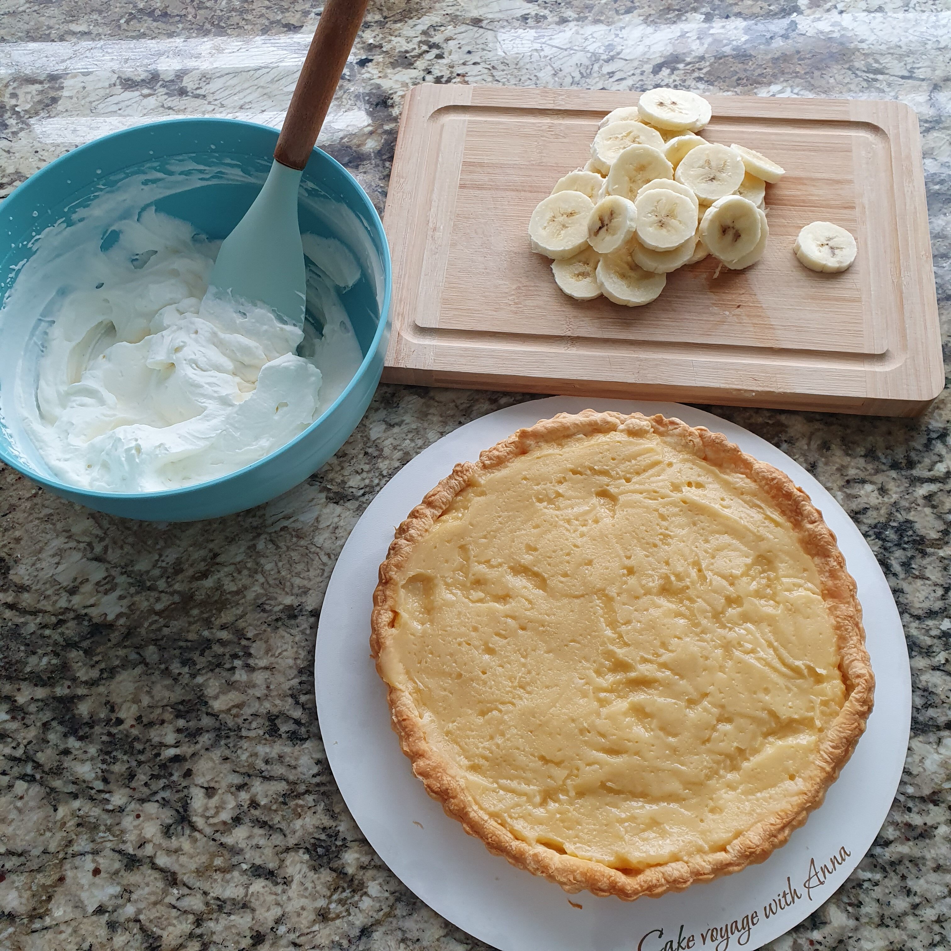 Нарежете бананите на кръгчета и ги подредете върху пълнежа.