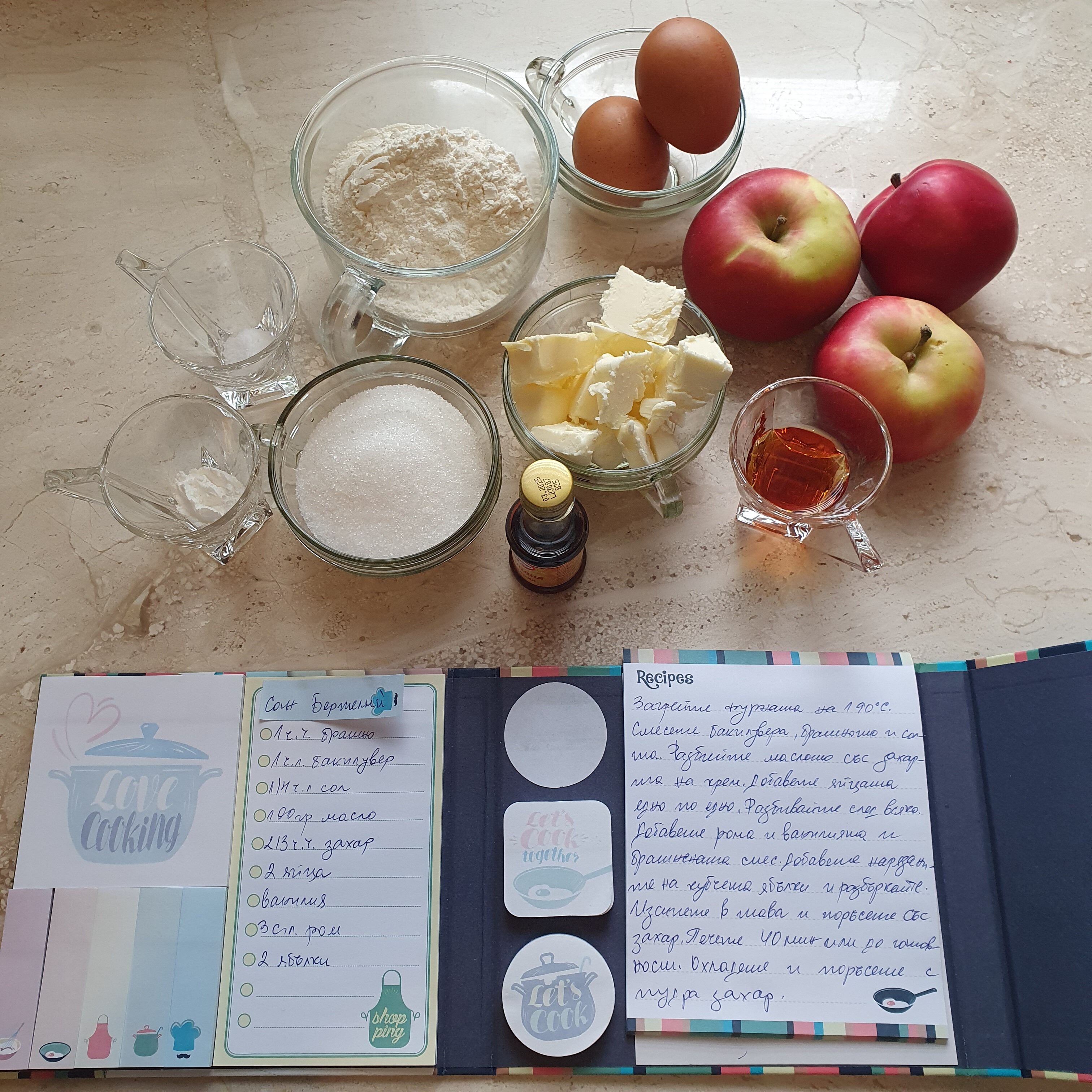 Заради френското минало и заради липса на по-добра алтернатива днешната торта е “French apple cake”. Ето и необходимите продукти за нея: