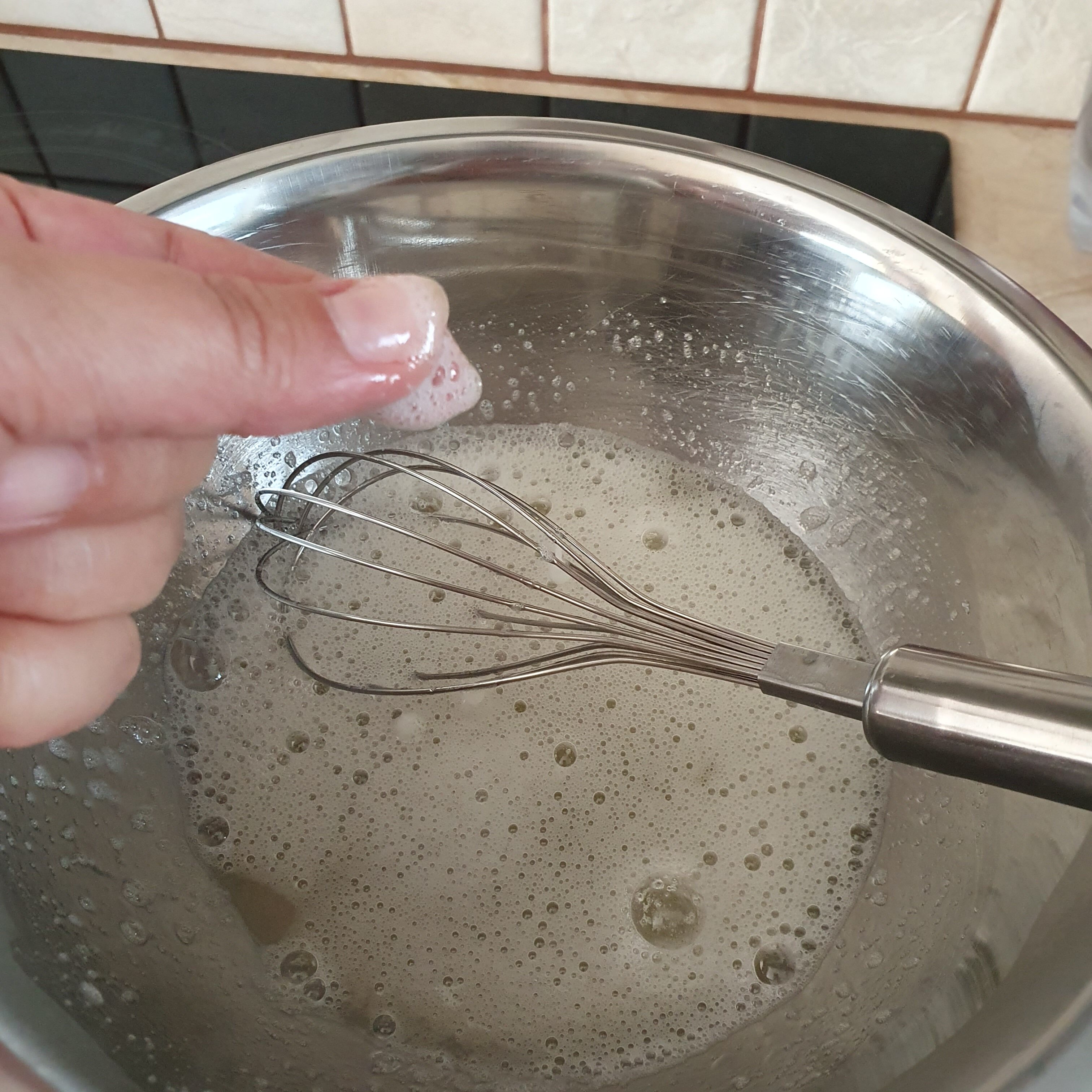 В термоустойчива купа разбийте заедно захарта и белтъците на ръка. Поставете купата върху тенджера с кипяща вода. Гответе, като разбърквате често, докато захарта се разтвори напълно и термометърът отчете между 49°C и54°C. Добър тест е, ако нямате термометър, да разтриете сместа между пръстите си. Готово е, когато кристалчетата захар се разтопят напълно.