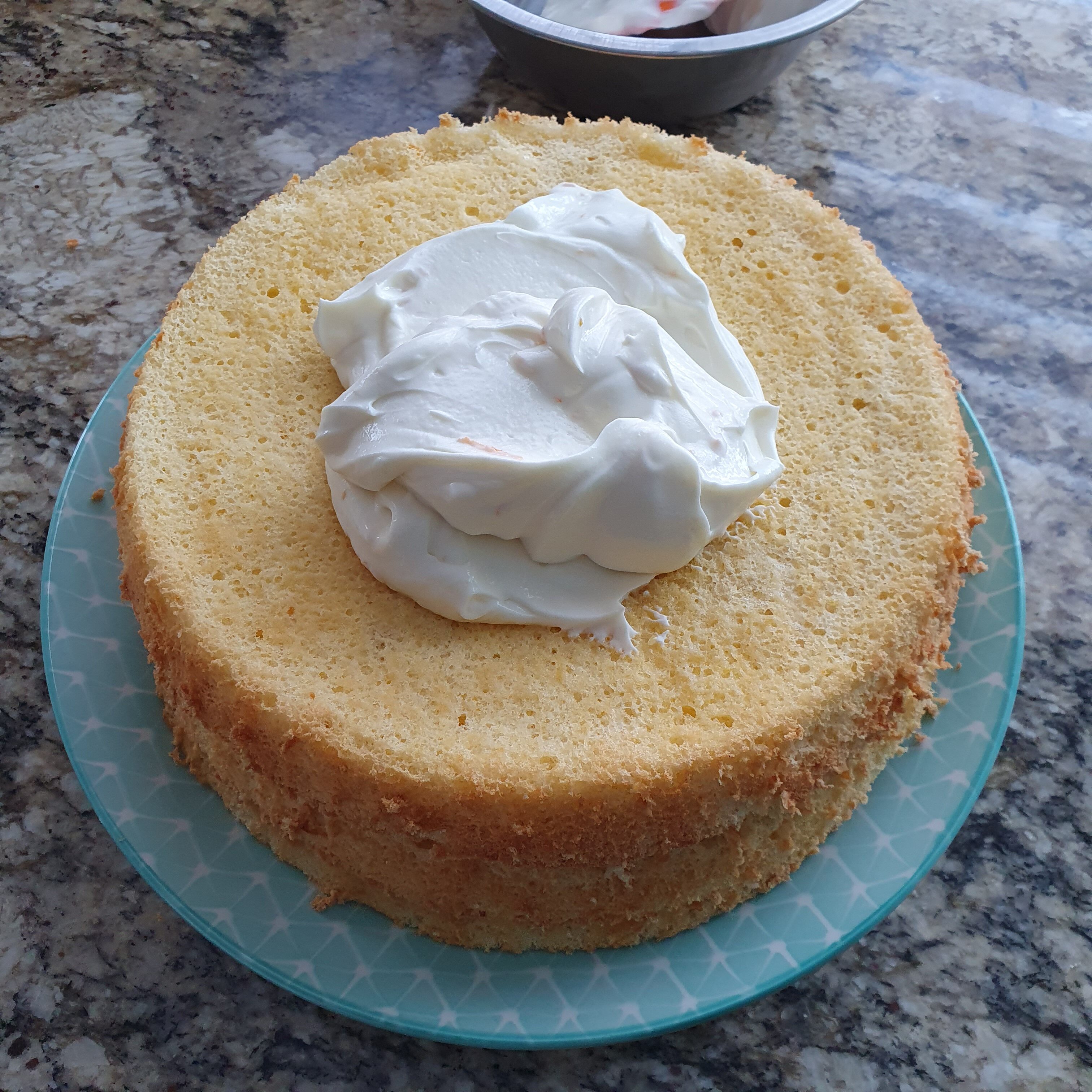 Поставяме първия блат, сиропираме и разстиламе 1/2 от крема с коричките.