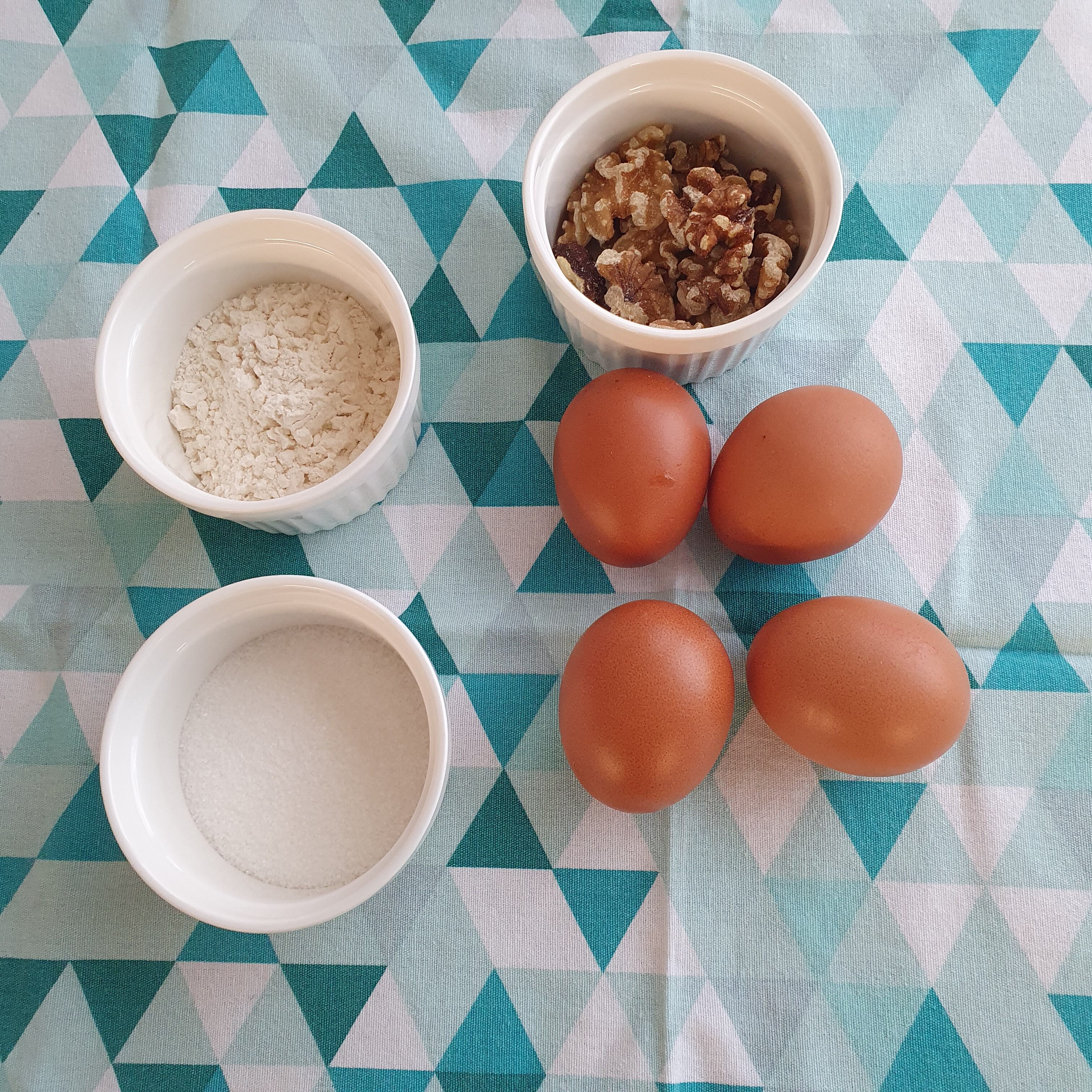 Прибавят се орехите и брашното като се разбърква внимателно, за да не спадне сместа.