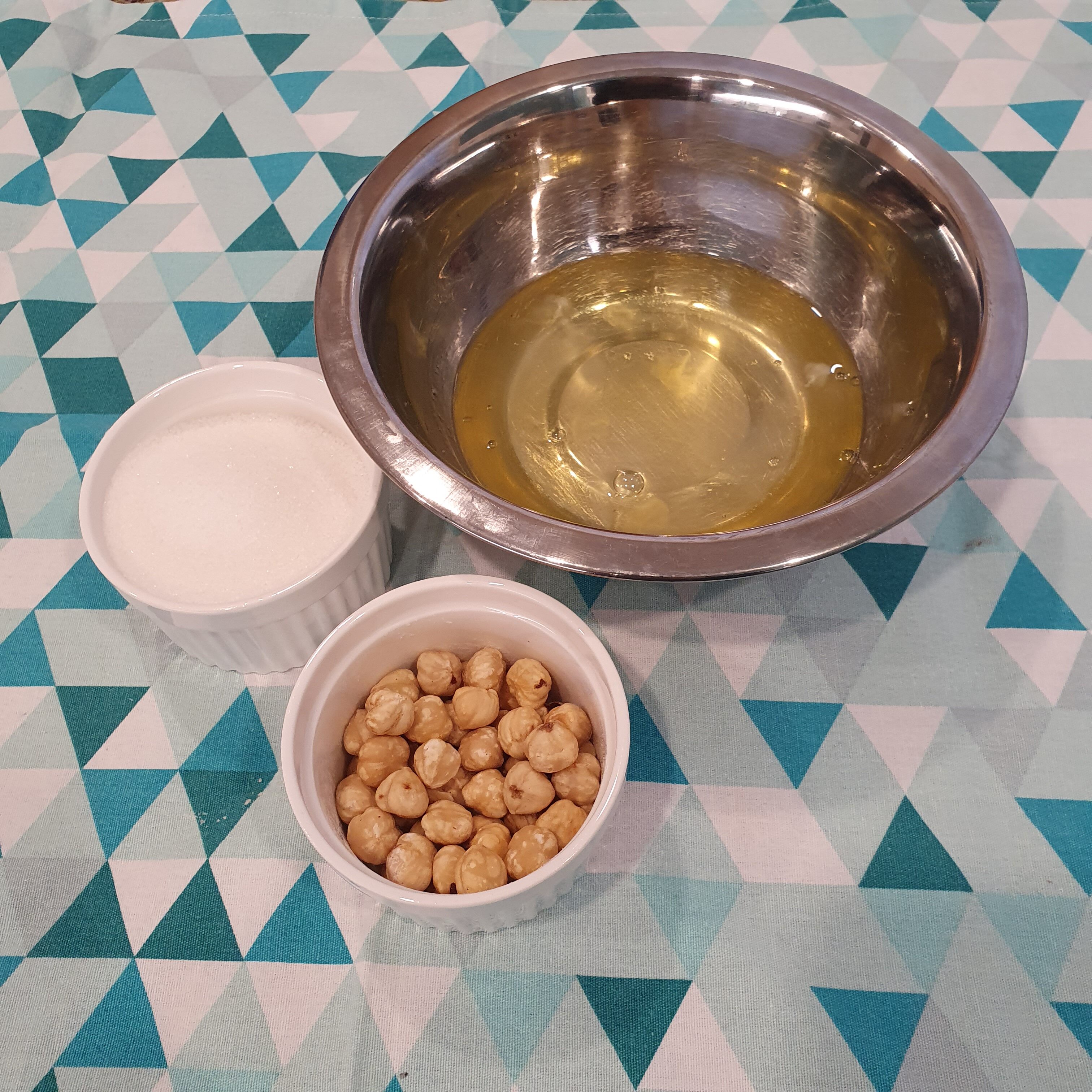 Захарта за белтъчния крем и 120 мл вода се слагат в касерола и се варят докато се получи гъст сироп. Лешниците се нарязват на дребно.