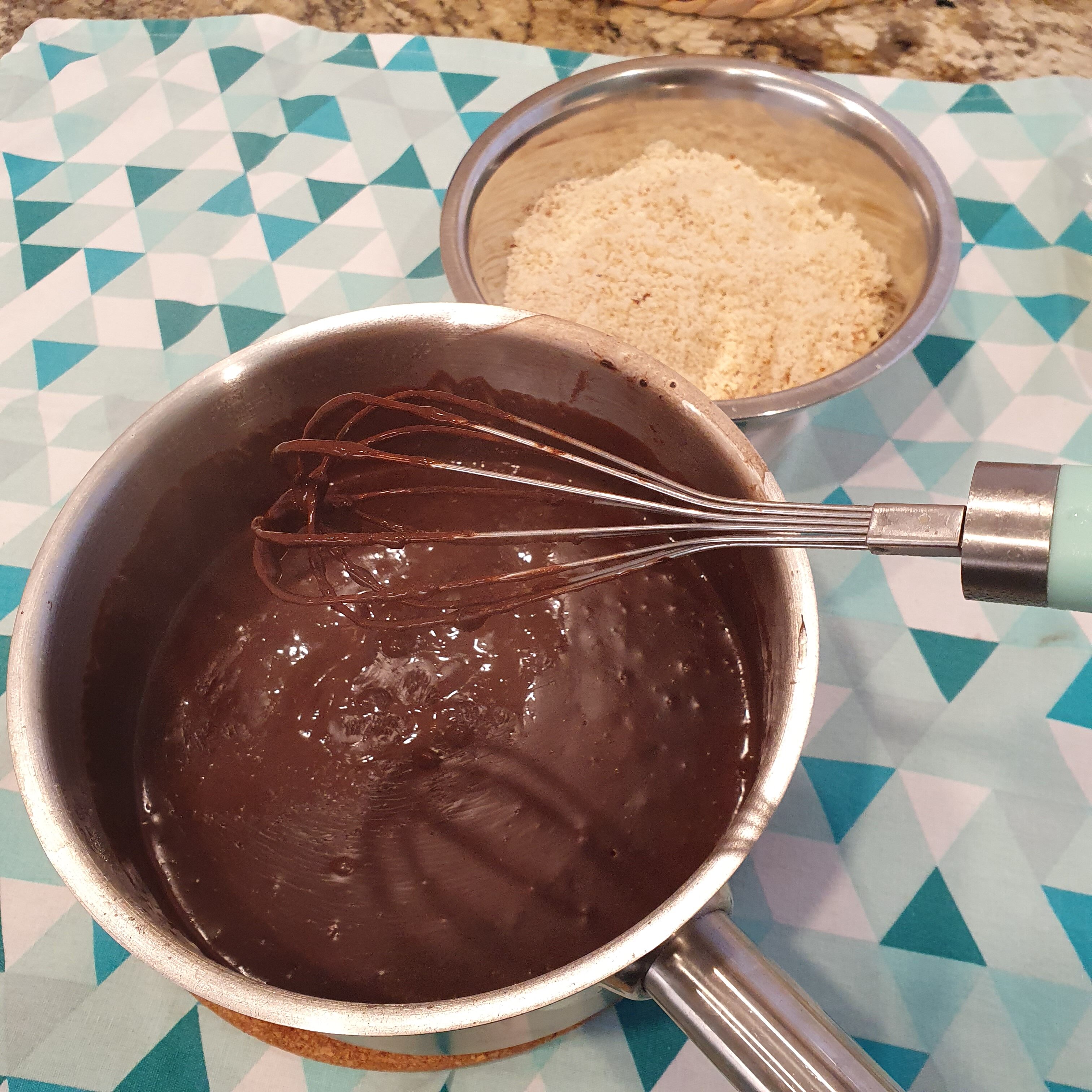Сваля се от котлона, прибавят се смлените бадеми и кремът се охлажда, като се покрива с фолио за свежо съхранение.