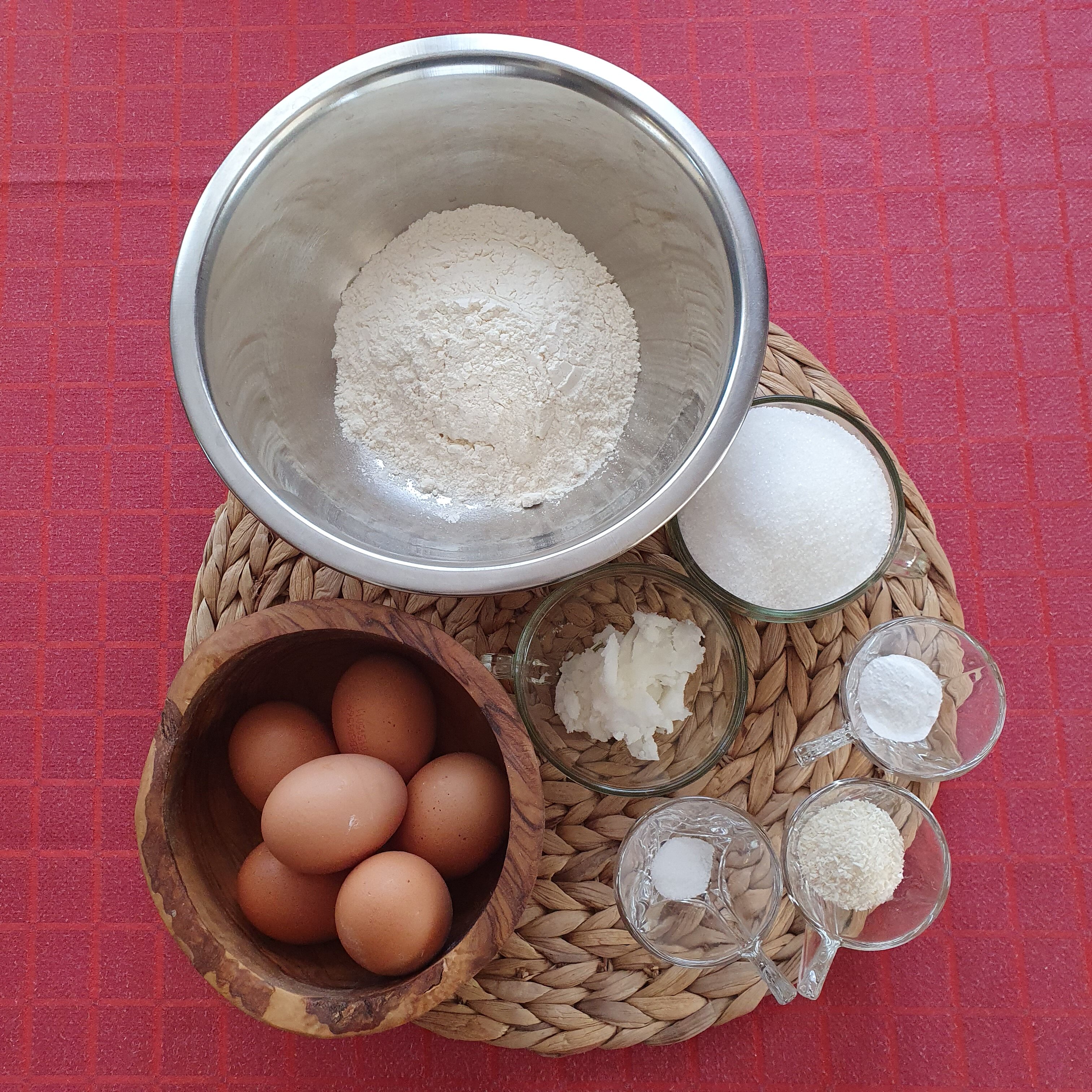 Смесете брашното с бакплувера, солта и кокосовите стърготини.