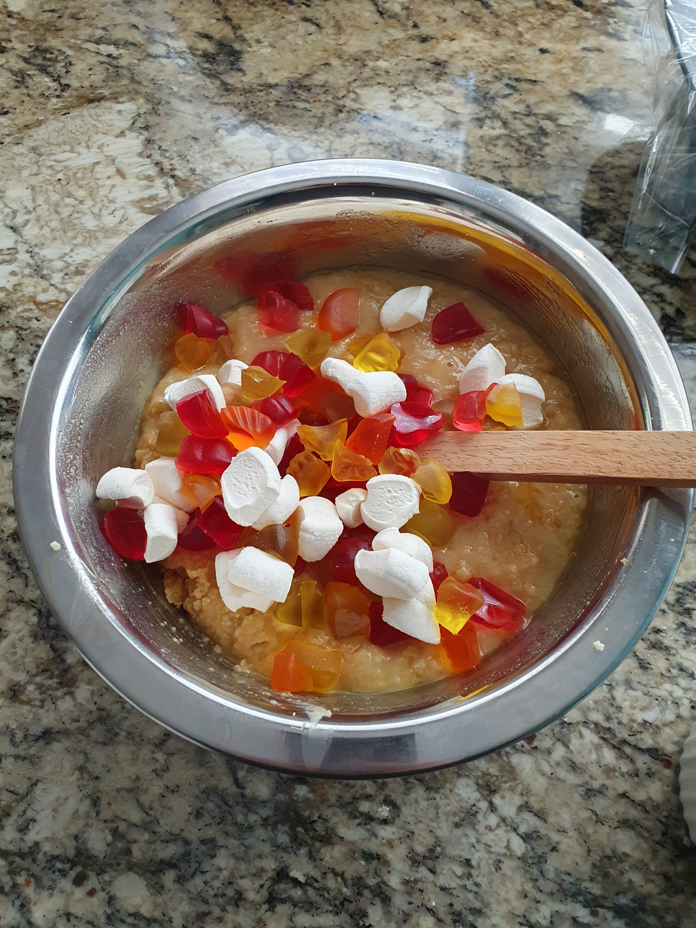 Сега за fruit puffs. Това са някакви новозеландски сладости, които тук няма (очаквано). По описанието за тях са нещо като плодов маршмелоу. Затова аз използвах смес от маршмелоу и желирани бонбони. 😀 Добавяме и тях към сместа.