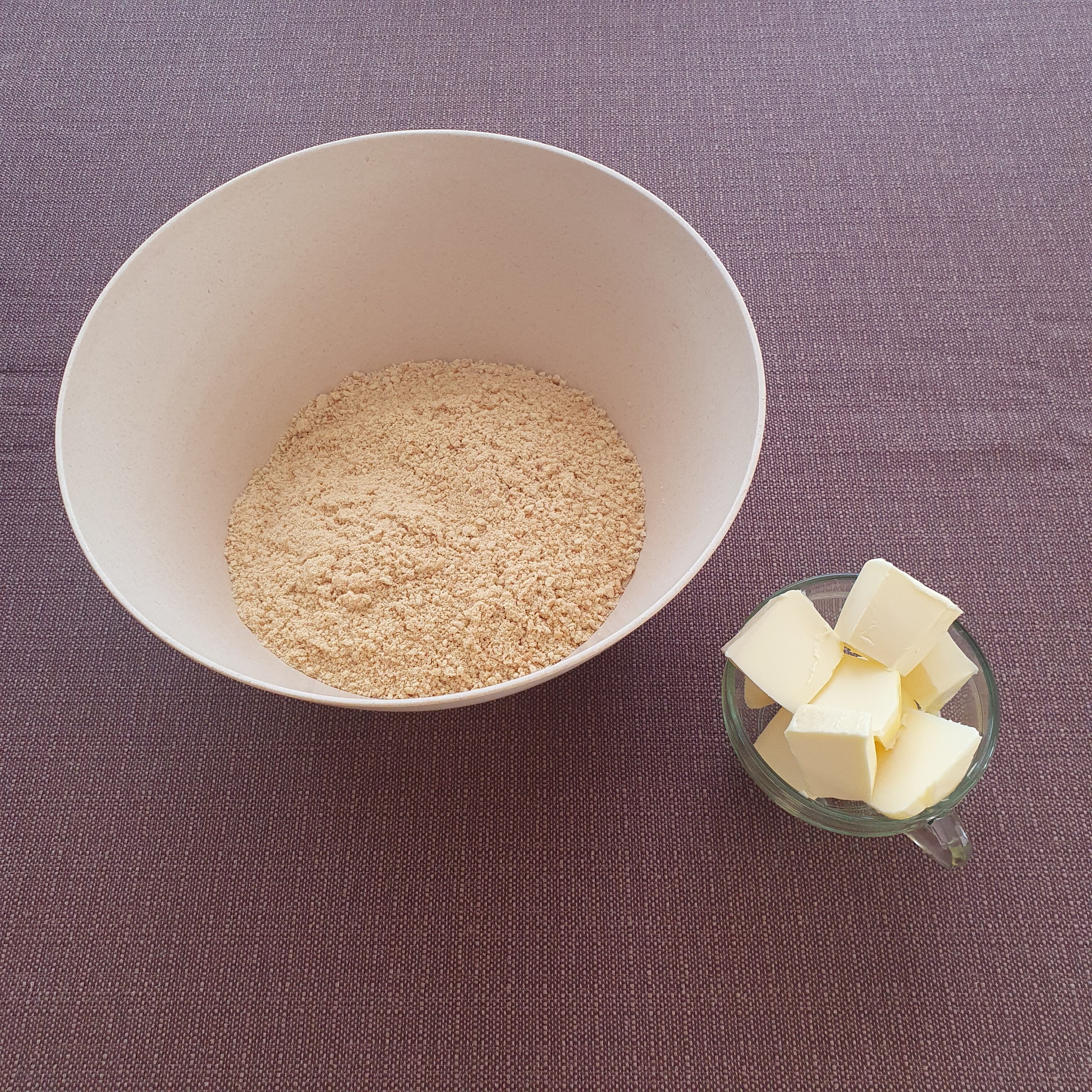 Разтопете маслото и го смесете с бисквитените трохи.