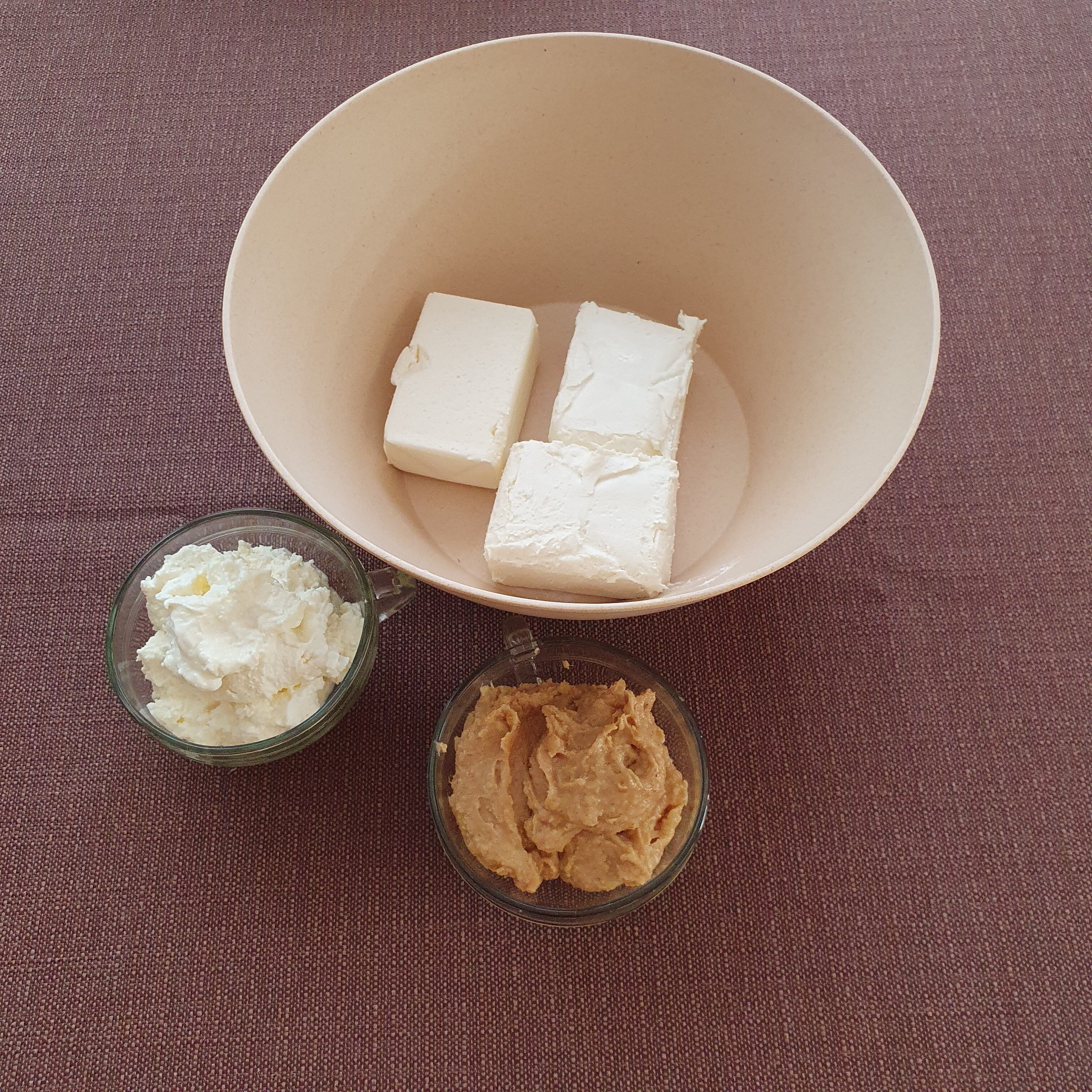 Рабийте крема сиренето и сметаната със захарта. Тъй като имах подсладено кондензирано мялко за biscoff крема аз пропуснах в пълнежа да добавям захар.