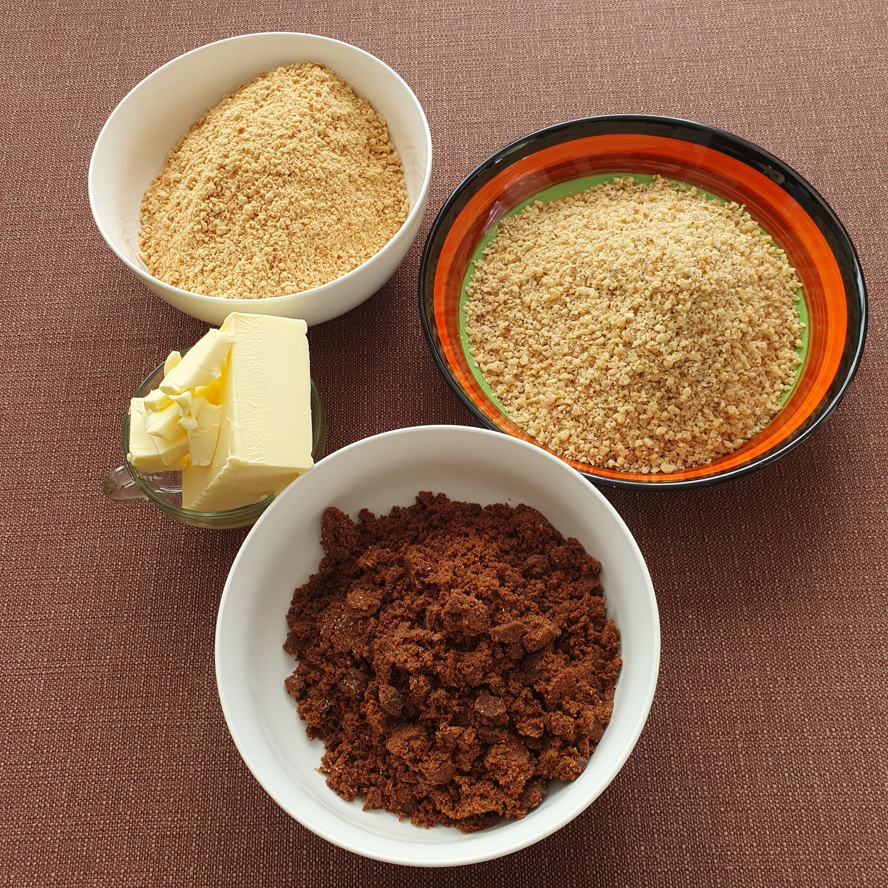 Смесваме бисквитите, орехите и кафявата захар и накрая добавяме разтопеното масло.