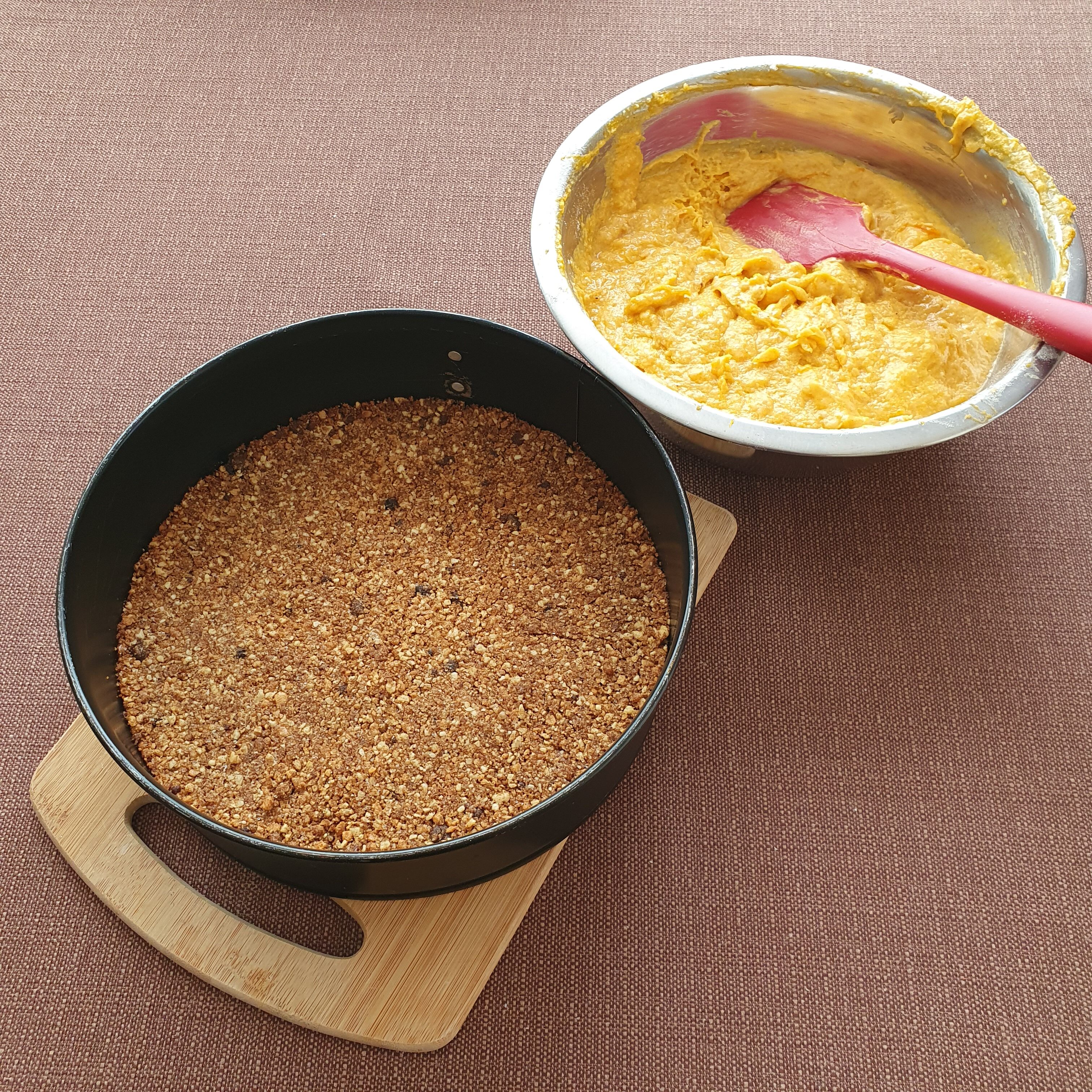 Застиламе форма за печене с хартия и слагаме 1/4 от сместа за хрупкавия слой. Разпределяме я равномерно и я притискаме леко.