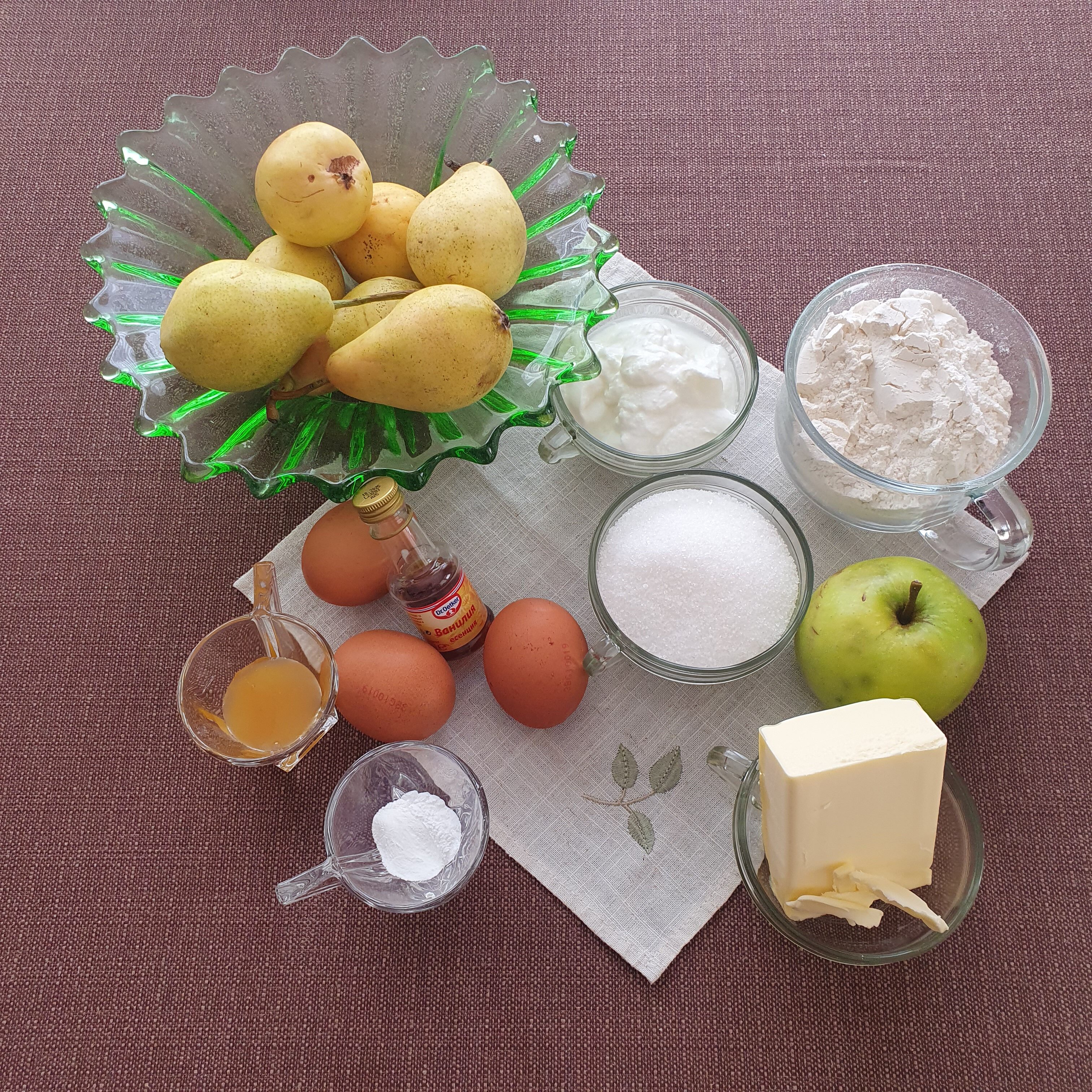 Предполагам няма да се учудите, че избрах френски десерт за тази дестинация – “French Yoghurt Pot Pear Cake”. Ето и необходимите продукти за него: