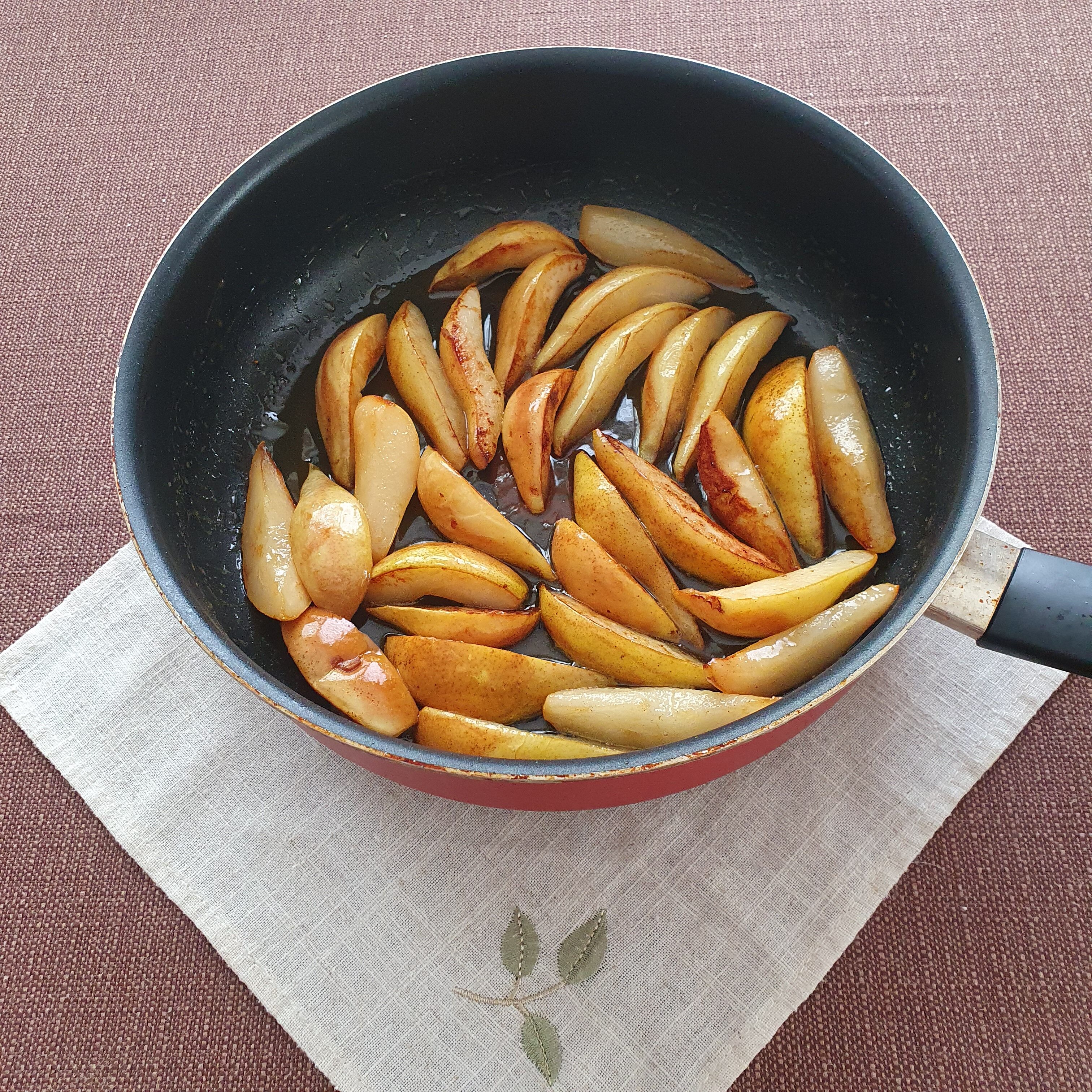 Нарежете всяка круша на шест или осем дълги парчета и отстранете сърцевината. Загрейте бучка масло в тиган на умерен огън, добавете резенчетата круша и гответе само докато леко покафенеят от двете страни. Полейте с меда и обърнете крушите да се покрият. Оставете настрана.