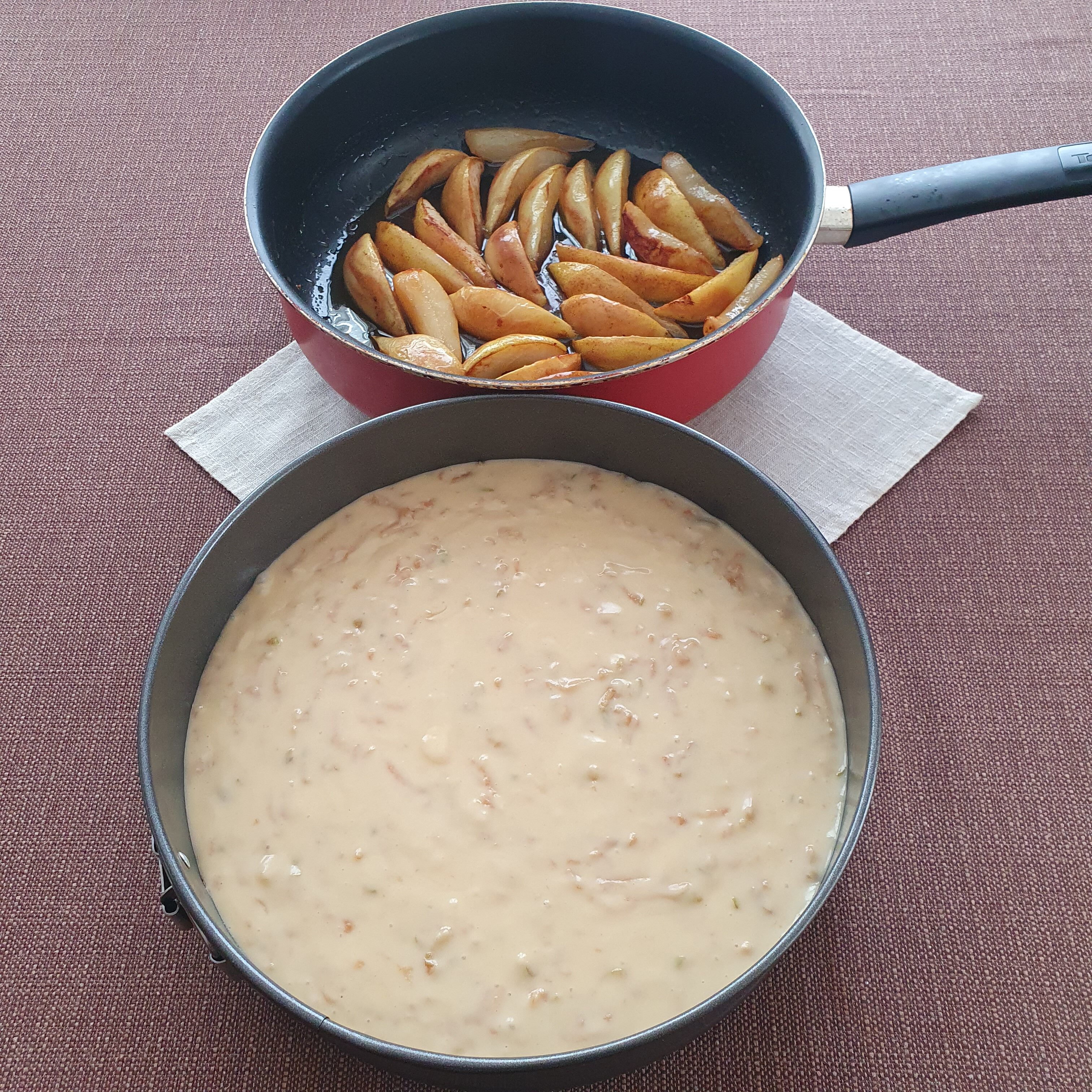Не разбивайте сместа, защото това ще я направи жилава. Прехвърлете кексовото тесто в подготвената форма и отгоре наредете запечените резени круши.
