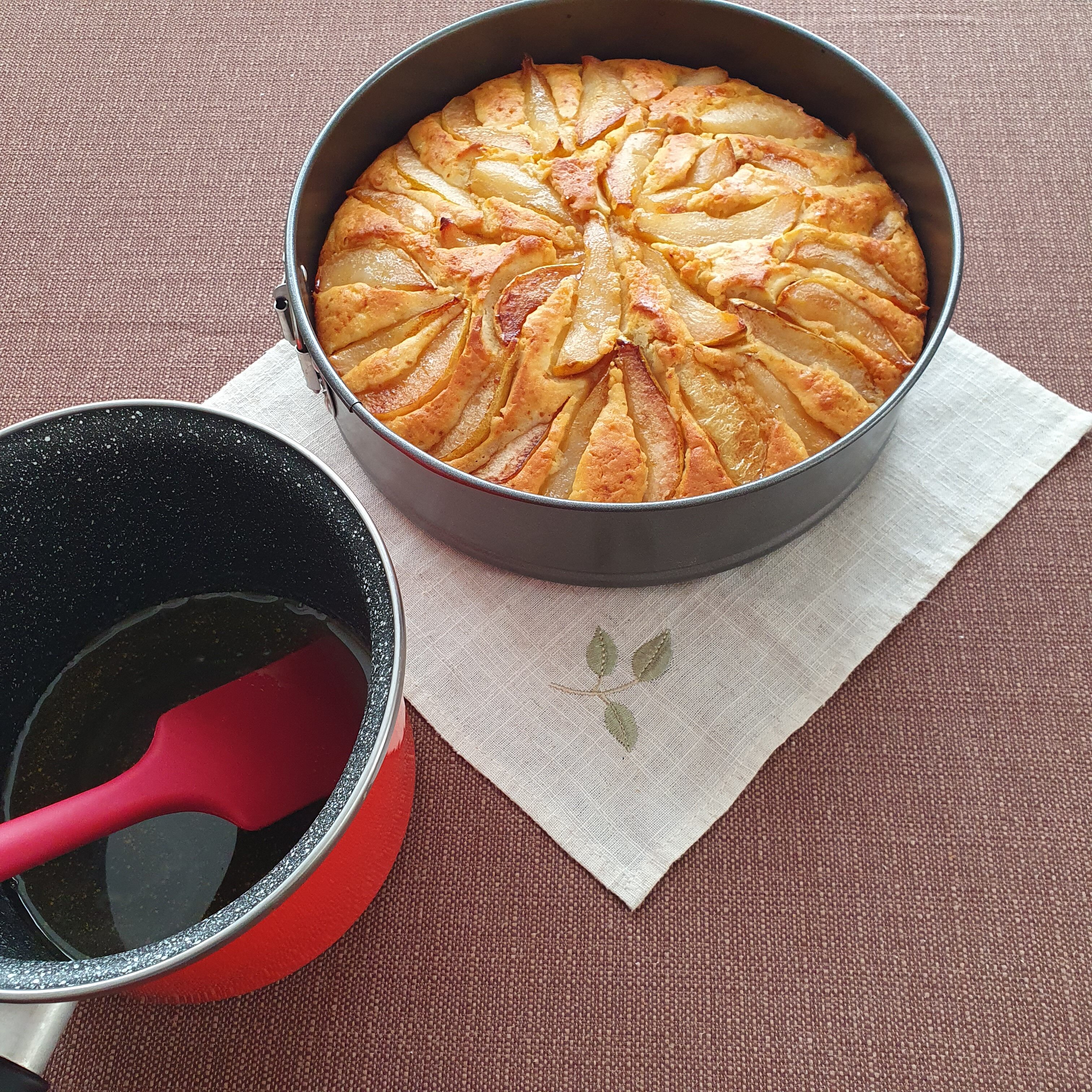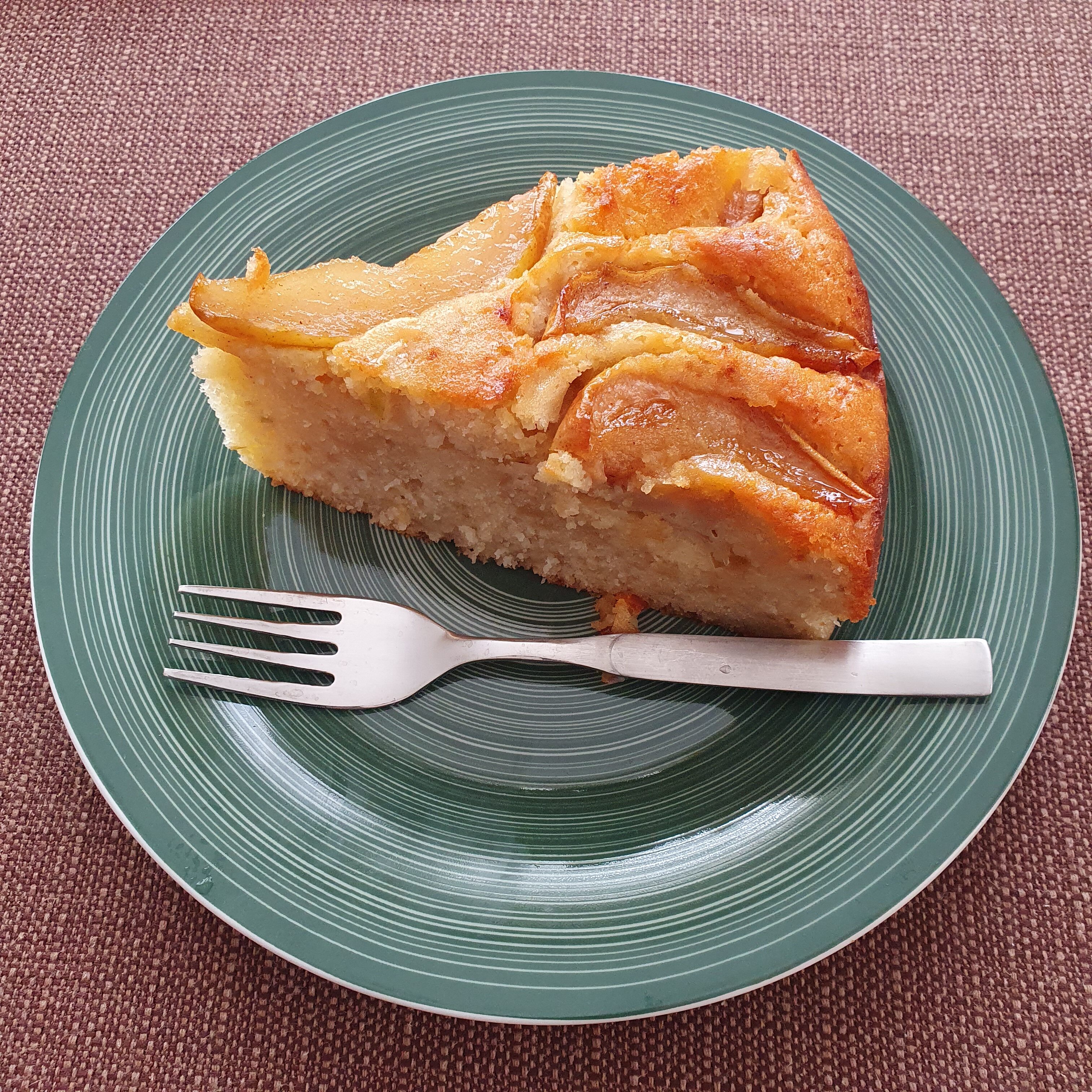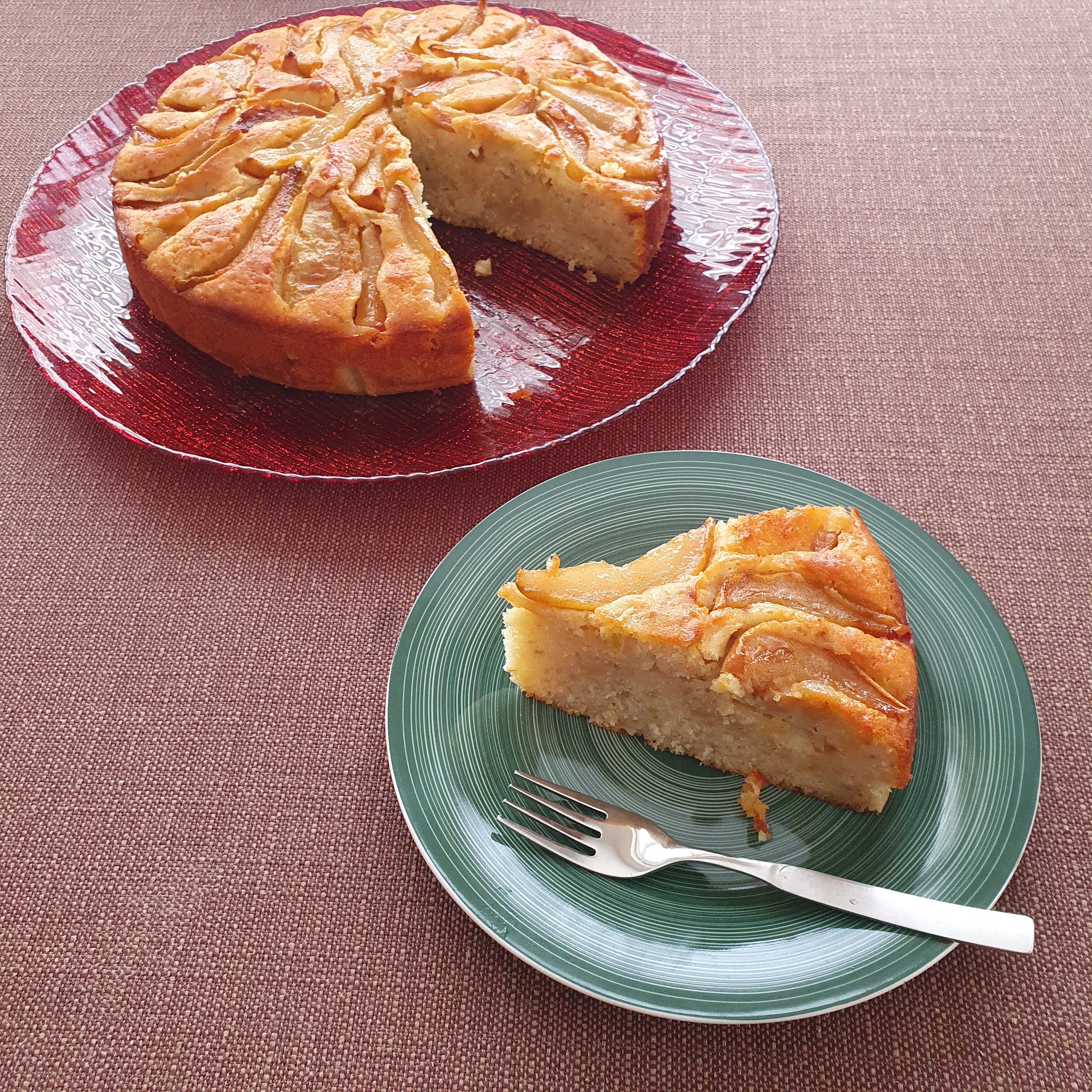 Тортата има типичен френски вкус – на масло. 🙂 Реших да приготвя точно нея, защото сега сме в сезона на ябълките и крушите и могат да се намерят прекрасни узрели плодове навсякъде. Тортата е сочна и плодова и наистина много ще ѝ отива малко сметана. Не, че и без нея не е вкусна. Идеална е за непретенциозна добавка към кафето или, когато решите да подсладите живота на близките вкъщи. Опитайте и вие.