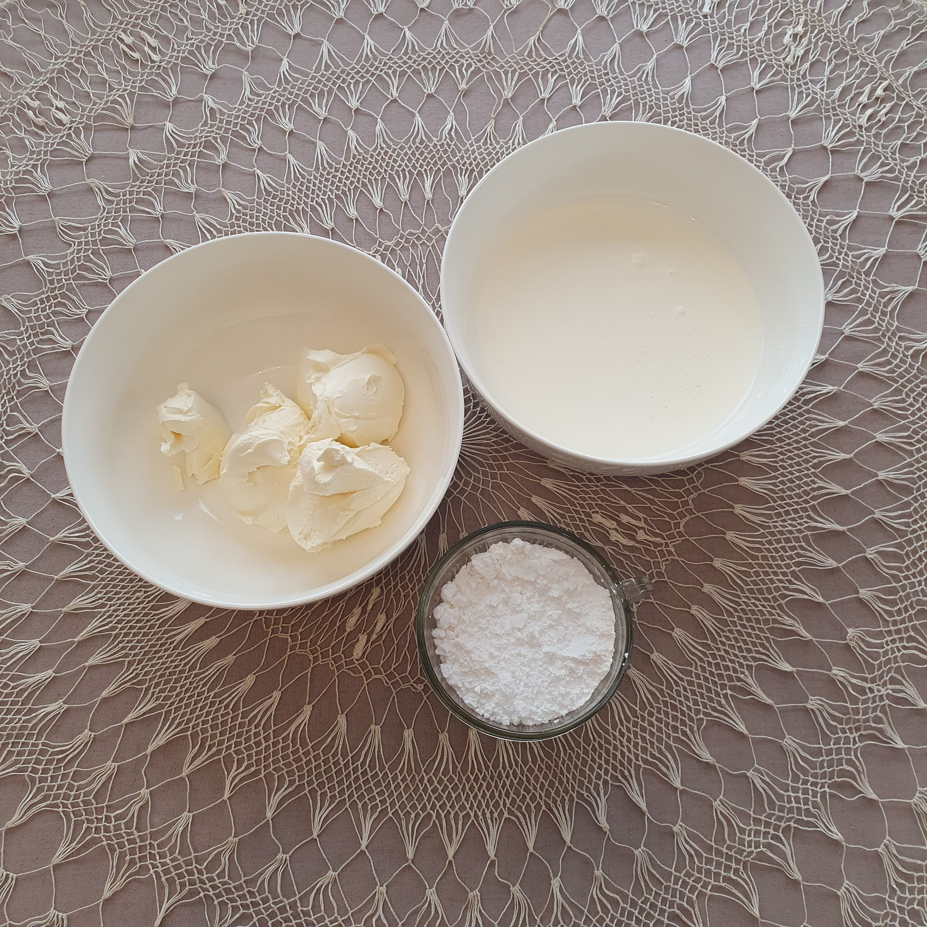 Увийте в найлоново фолио, още топло, и охладете до следващия ден. Изсипете сметаната заедно с маскарпонето и пудрата захар в купа и разбийте с миксер на ниска скорост.