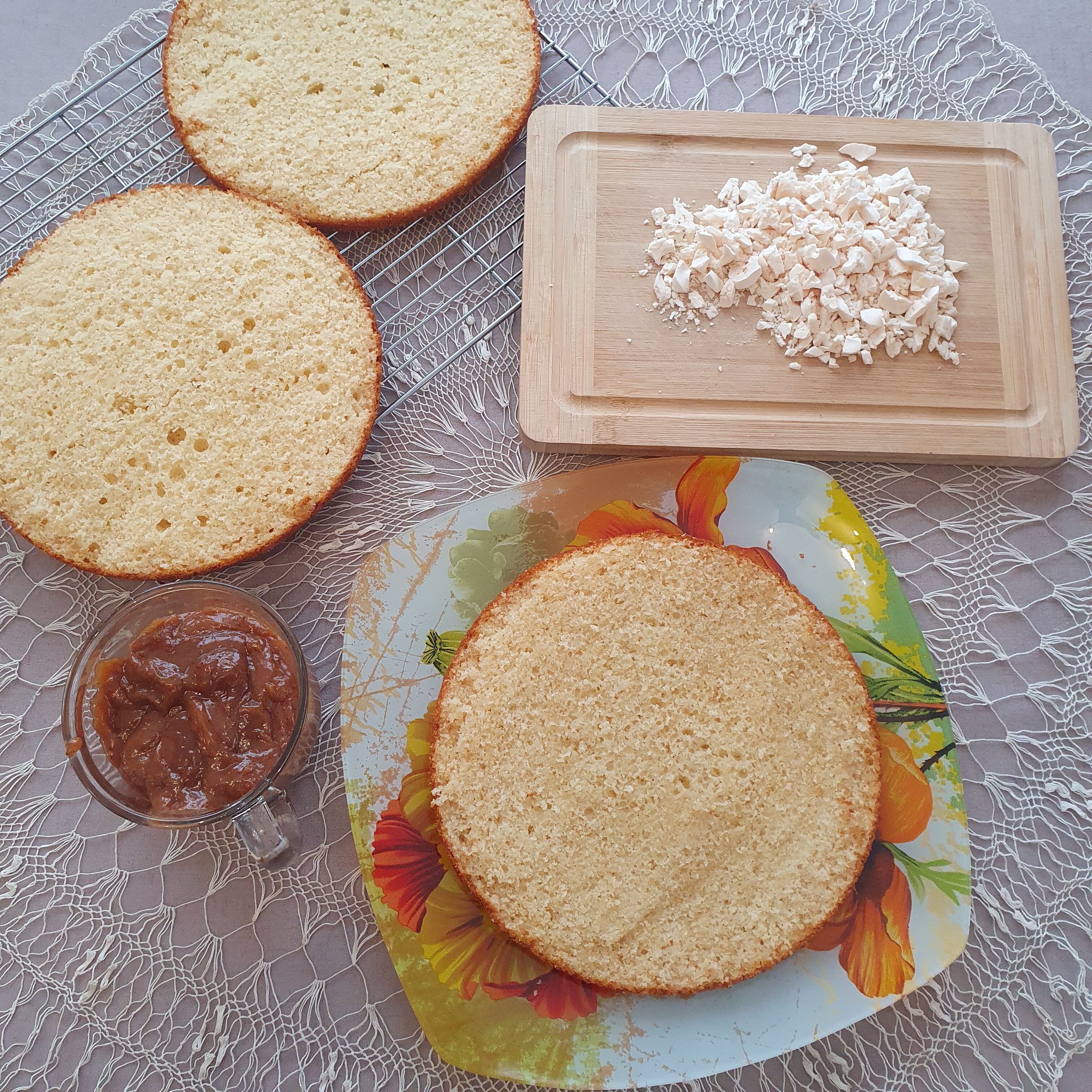 Поставете обилен слой дулсе де лече върху първия пандишпан. Загладете с помощта на шпатула.