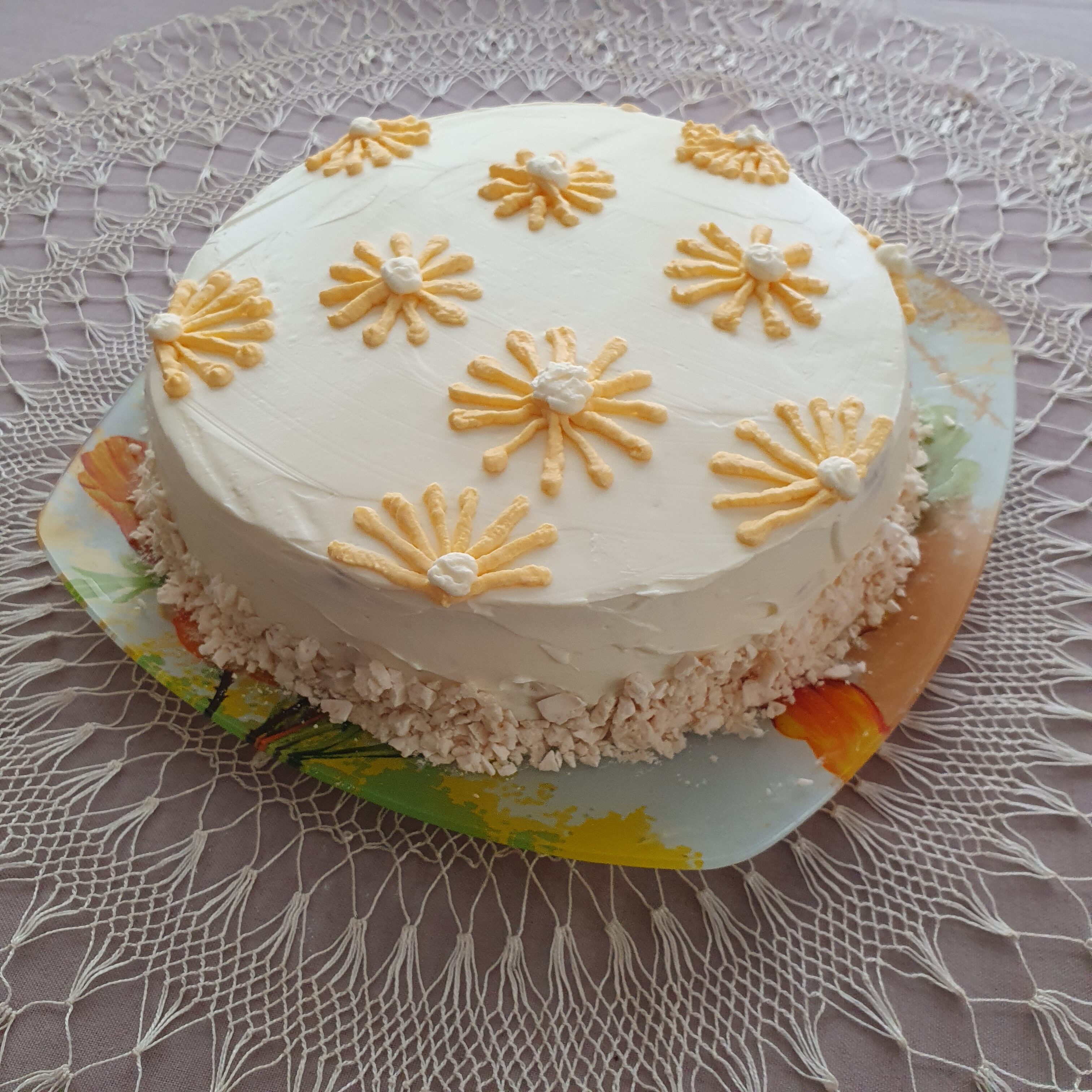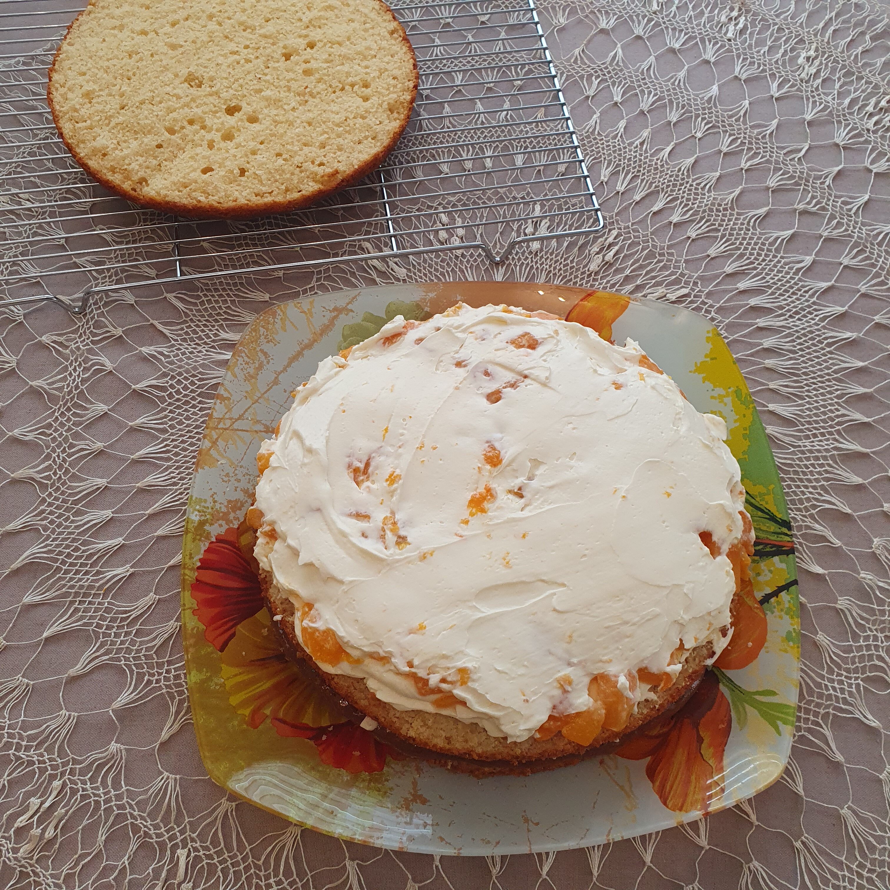 Накрая се поставя последният блат от пандишпан. Притиснете внимателно и навлажнете със сироп. Разбийте крема за измазване по същия начин като този за пълнежа. Измажете тортата отгоре и отстрани и декорирайте както ви харесва. Оставете в хладилника поне за 4-5 часа преди да сервирате.