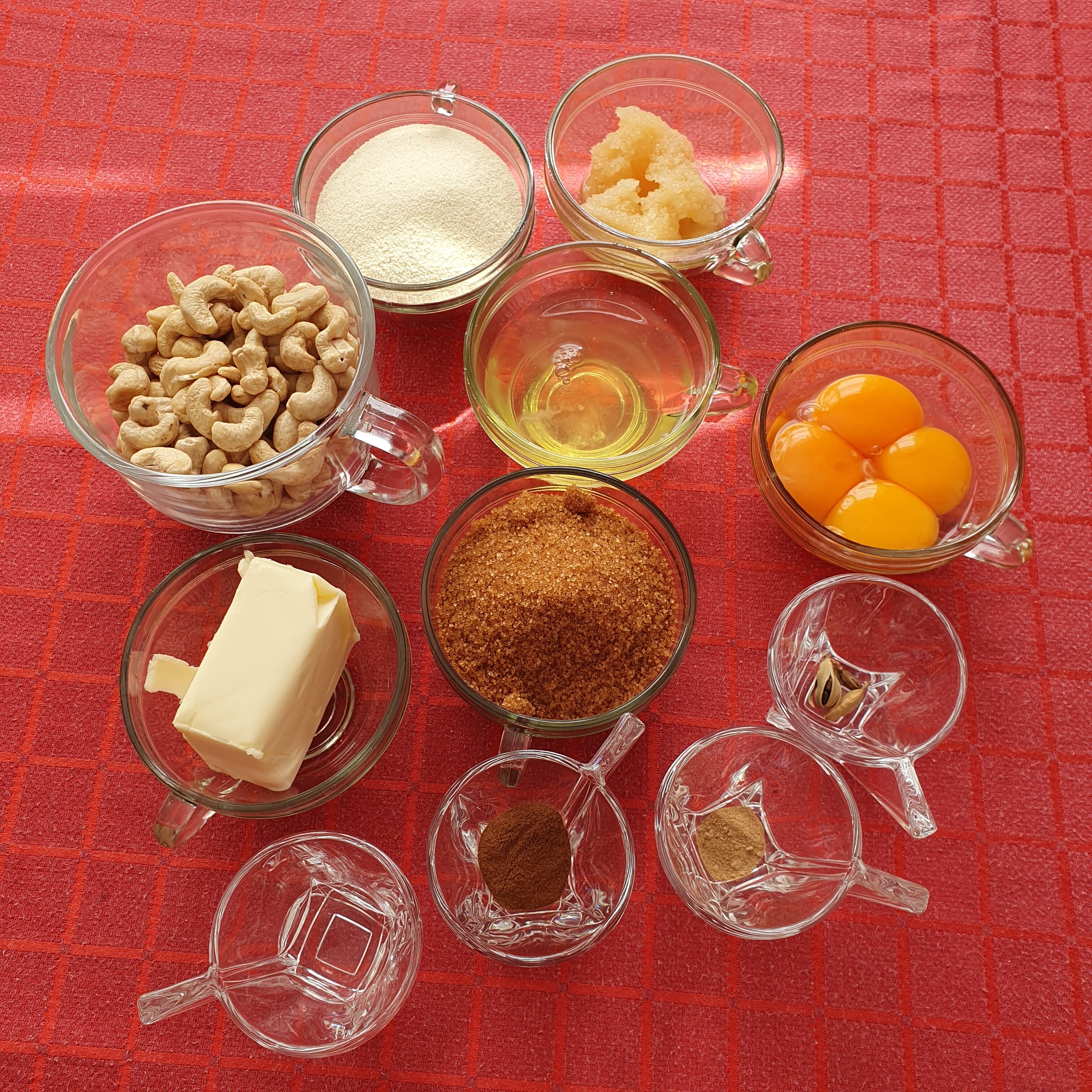 Разбийте маслото и захарта заедно докато сместа стане бледа и кремообразна, след което добавете жълтъците един по един, като разбивате добре след всяко добавяне. Накрая добавете кашуто, гриса, меда, розовата вода и подправките.